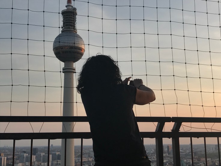 Vi bodde på Park Inn vid Alexanderplatz, ett rätt högt hotell med 41 våningar (vi bodde på våning 6) och faktiskt Tysklands högsta hotell. Så den andra kvällen gick vi upp till the Panorama Terrace högst upp i huset och 150 m över havet, där har man rätt fin utsikt och om man vågar och vill kan man även hoppa fritt fall ner längs fasaden, lockande… not!