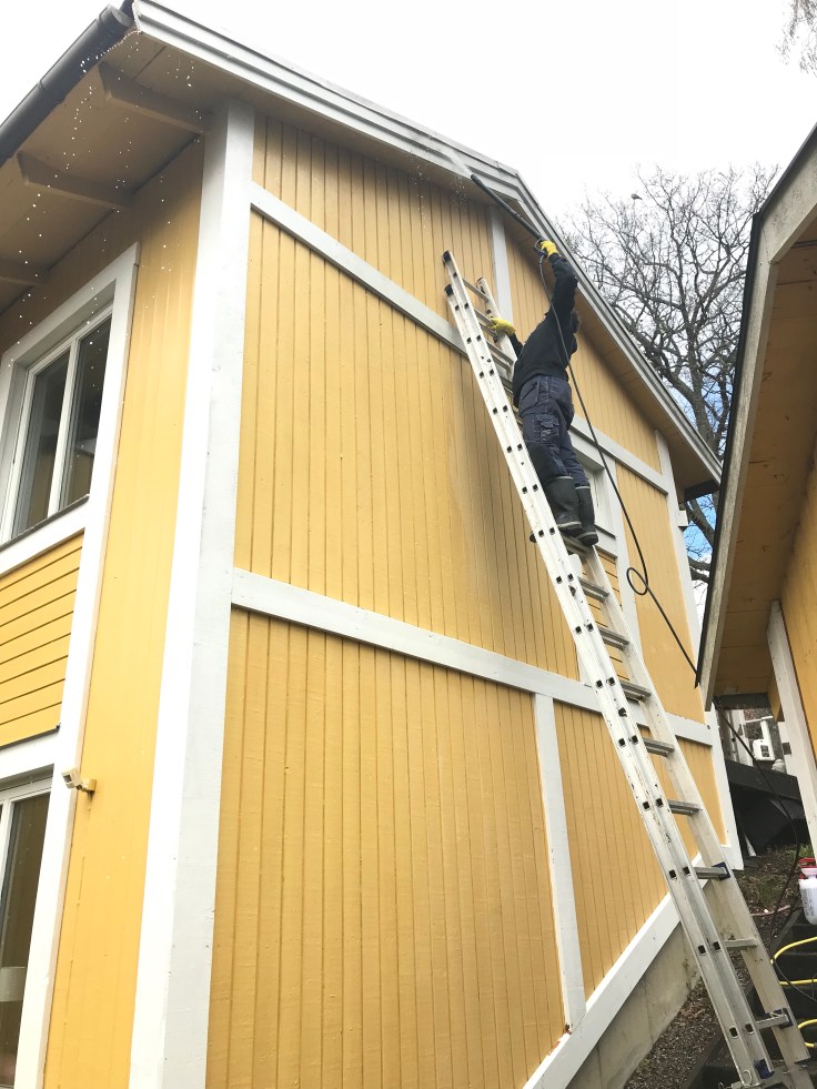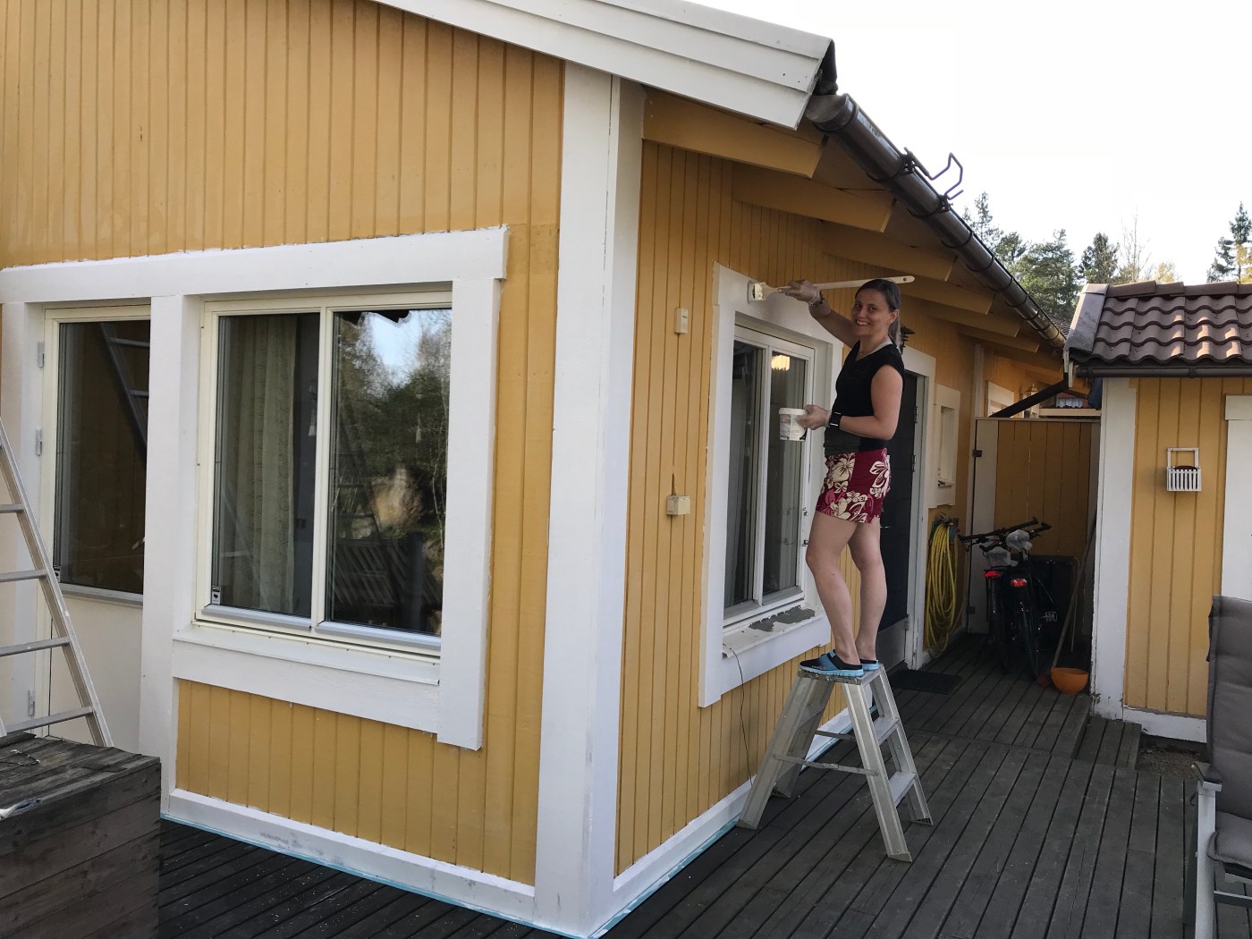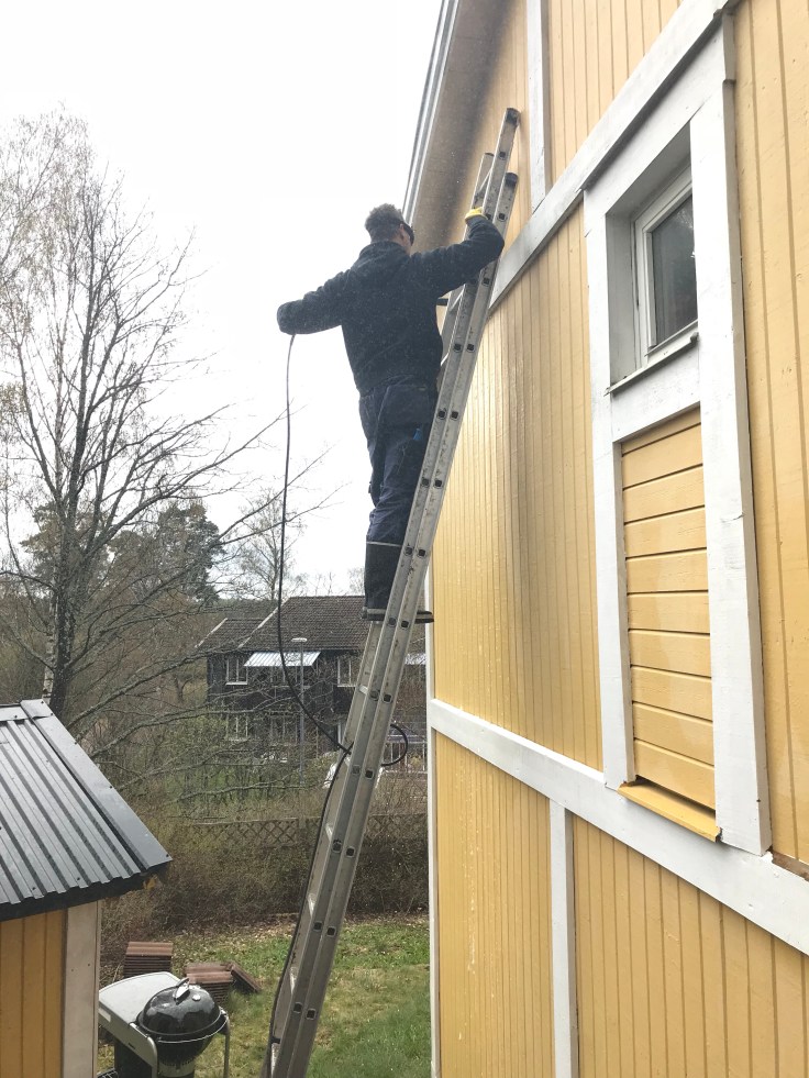 Måla hus, det är vad vi ska göra hela långa Kristi Himmelfärds-helgen! Tvätt och skrapning är avklarat, nu är det bara att måla vidare. Vi gjorde baksidan (nästan klar, typ något varv vitt kvar) förra sommaren, så det är gavel och framsida som gäller i år.