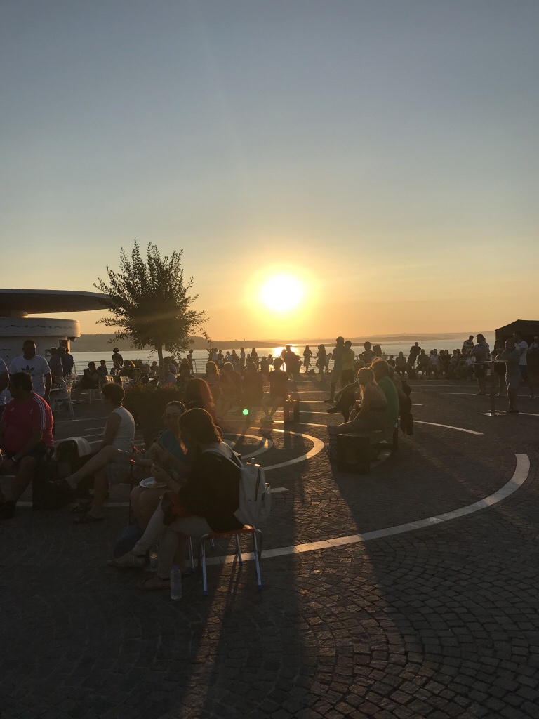 Sveriges VM-match på storbilds-tv i solnedgången.