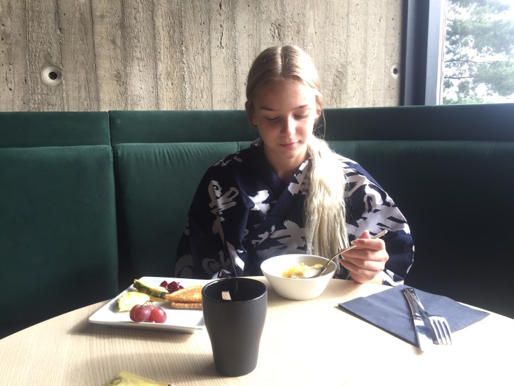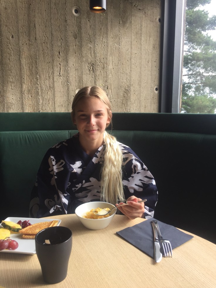 Efter frukost gick vi ner till det Japanska badet. Det är mobilfritt där såklart så därifrån finns det inga bilder på oss men Yasuragi har i alla fall renoverat och gjort om sedan Tove och jag var där. Istället för den stora poolen hade de gjort som små pooldelar, nästan som olika rum. Där fanns bland annat ett Kolsyrebad (typ bubbelpool), kallvattenbad (13-14 grader) och en lite större pool som gick runt ”rummen”. Ute finns det (som tidigare) varma källor. Sen fanns det också torrbastu, ångbastu och en sovbastu!