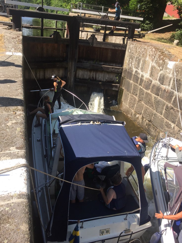 Fyra båtar slussade samtidigt. De andra tre kom från Danmark. De gjorde tydligen samma resa för några år sedan och ville göra om det i år igen. Förra gången var dom sex båtar och hamnade tydligen i lokaltidningen med ett reportage om äventyret i Östergötland😊
