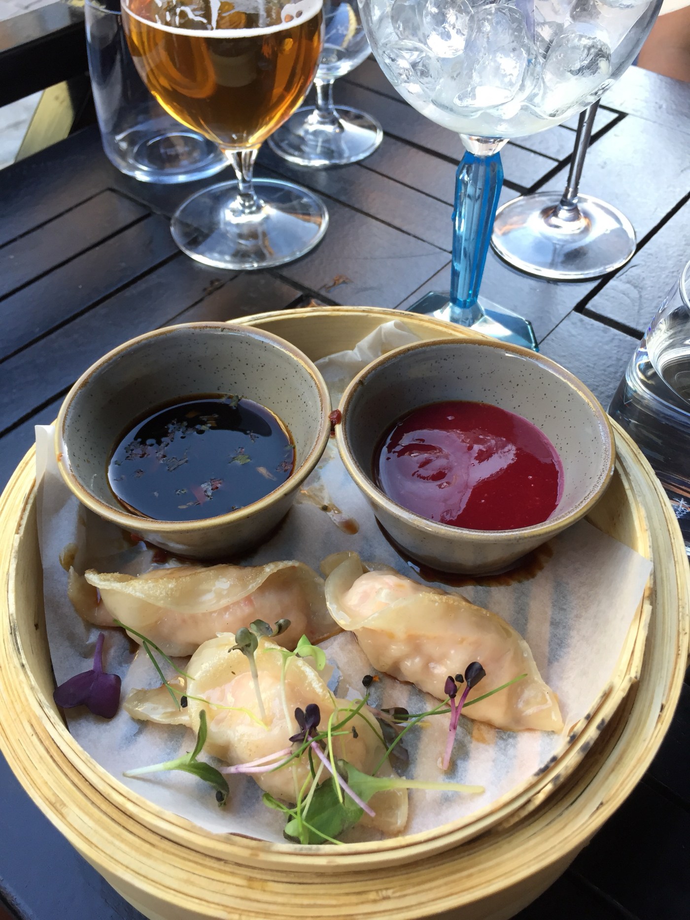 Gyosa med hummer och plommonfyllning.