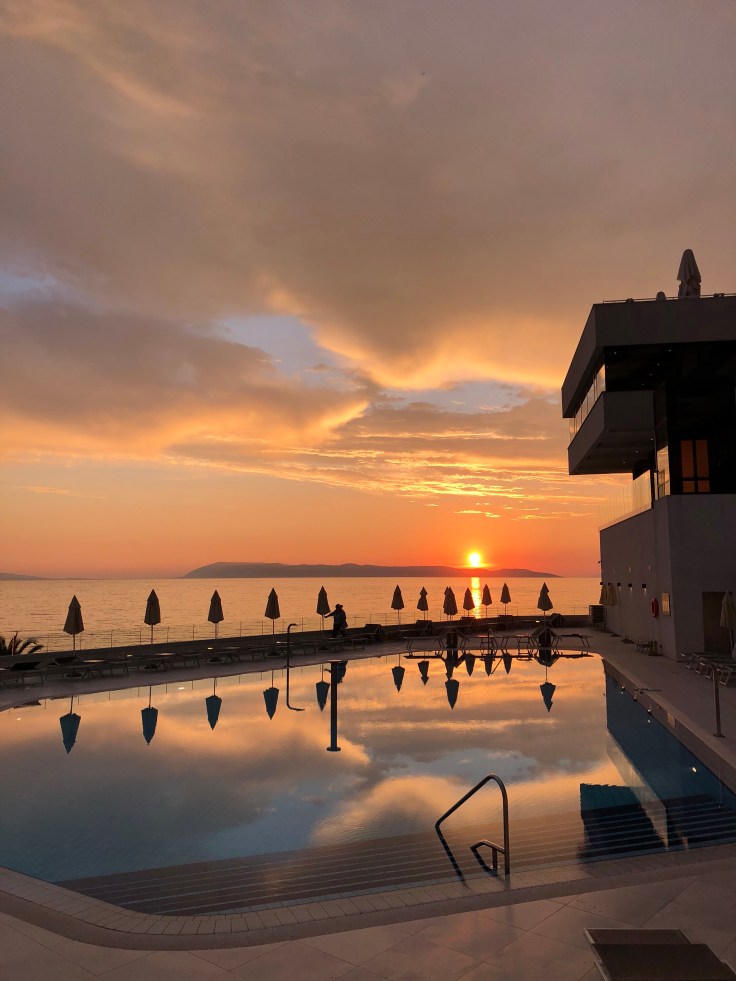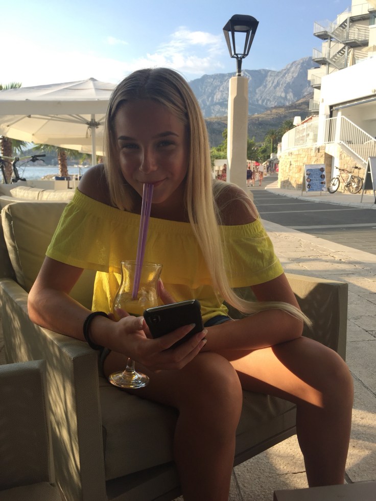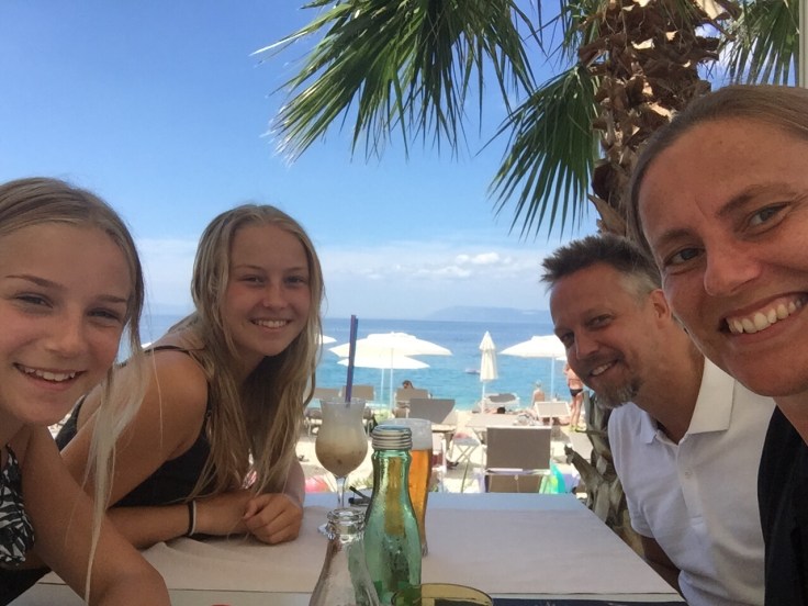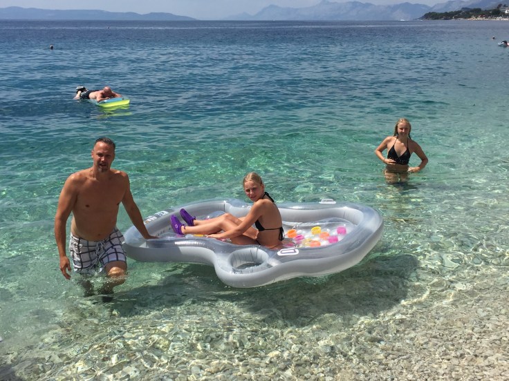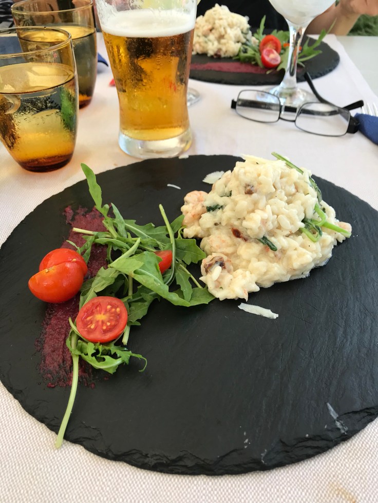 Risotto med räkor, väldigt liten portion med gott! Efter maten satt vi kvar en stund medan tjejerna gick tillbaka till solstolarna. Jag berättade för Magnus att Lina hade frågat dagen innan om vi inte kunde köpa en badmadrass för två att ha här. Jag sa förstås ”nej, vi kan inte köpa en och bara ha en vecka här, det går inte”. Men när Magnus och jag satt och pratade kände jag mig plötsligt såå tråkig som bara säger nej till allt, och vi skulle ju kunna testa att få ner den i någon av väskorna, den tar ju ingen plats utan luft och väger inte så mycket…