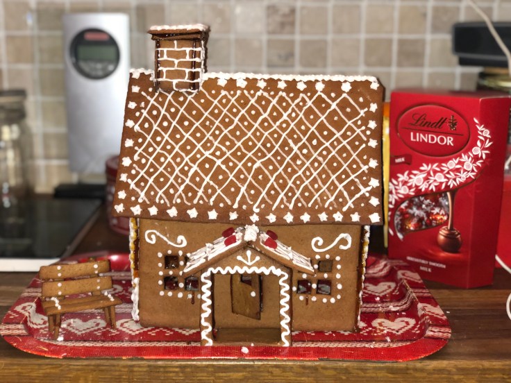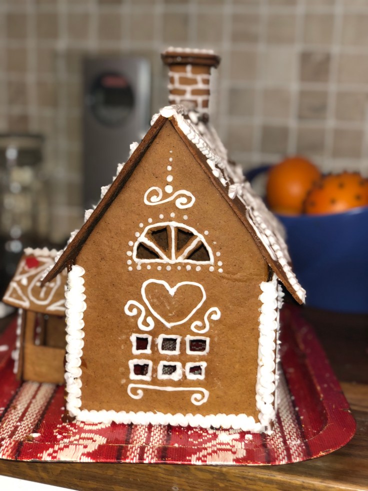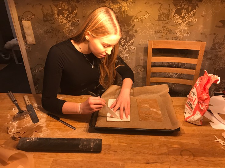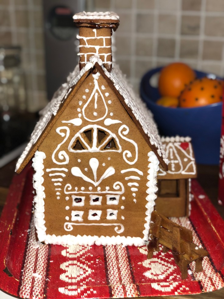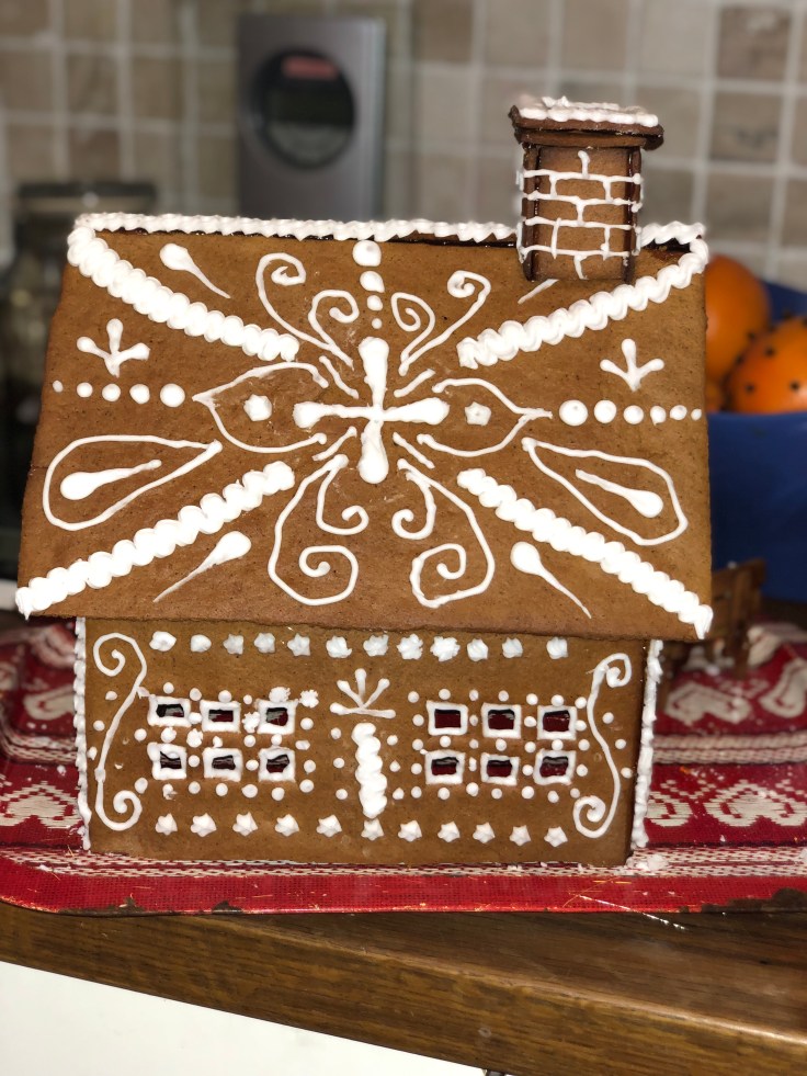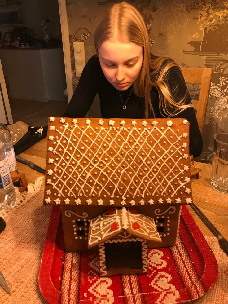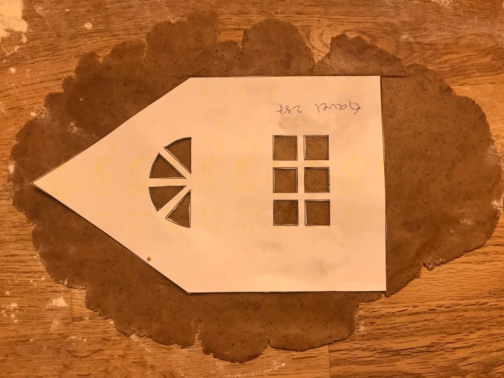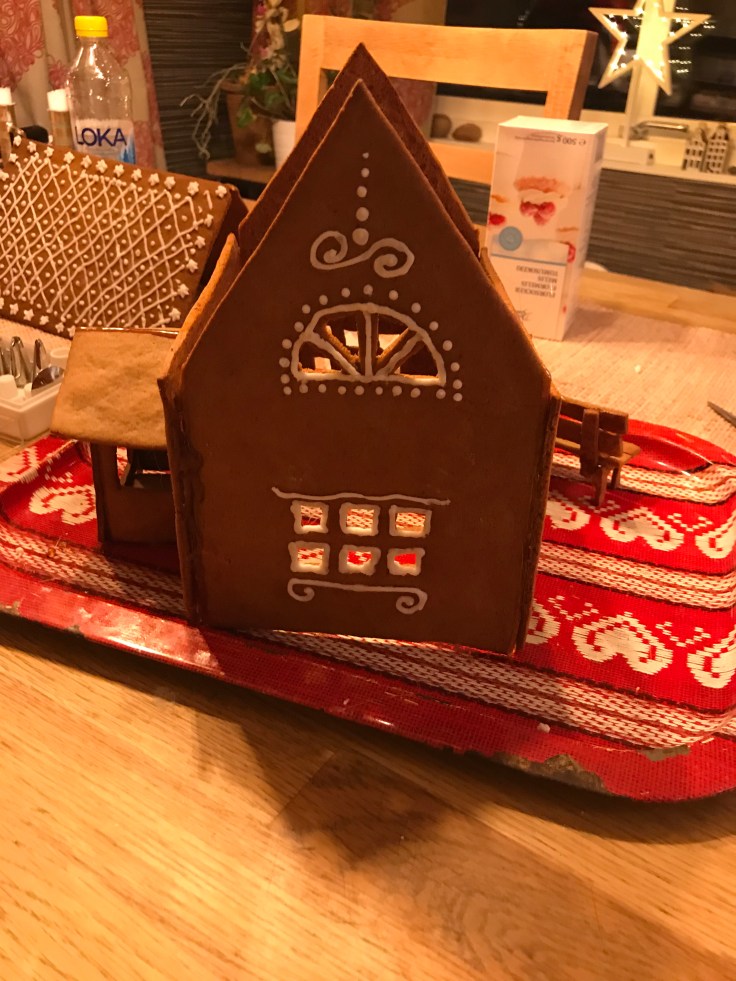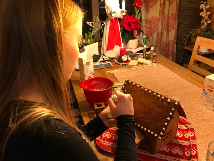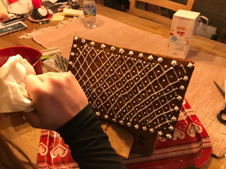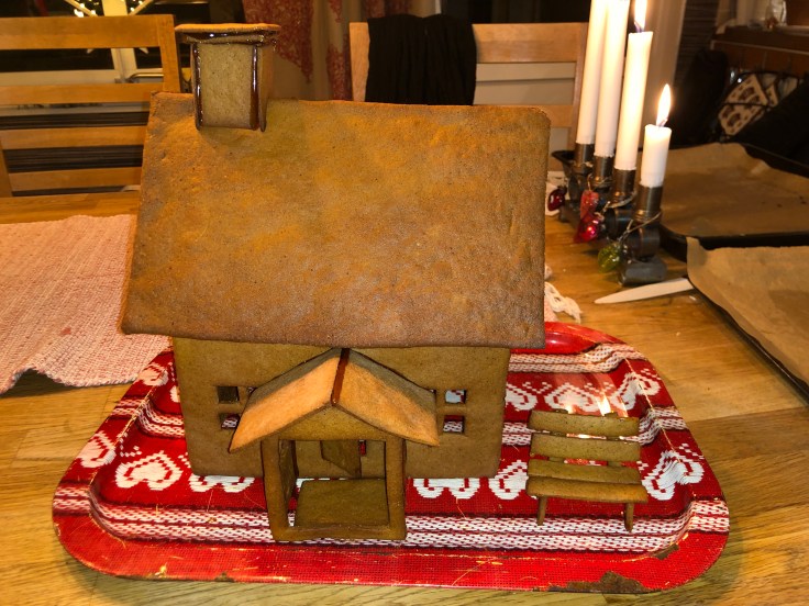 Tove och jag har bakat pepparkakshus ikväll, eller jag kan egentligen inte alls ta åt mig äran. Jag klippte några mallar och kavlade ut och skar några bitar, resten har Tove gjort!