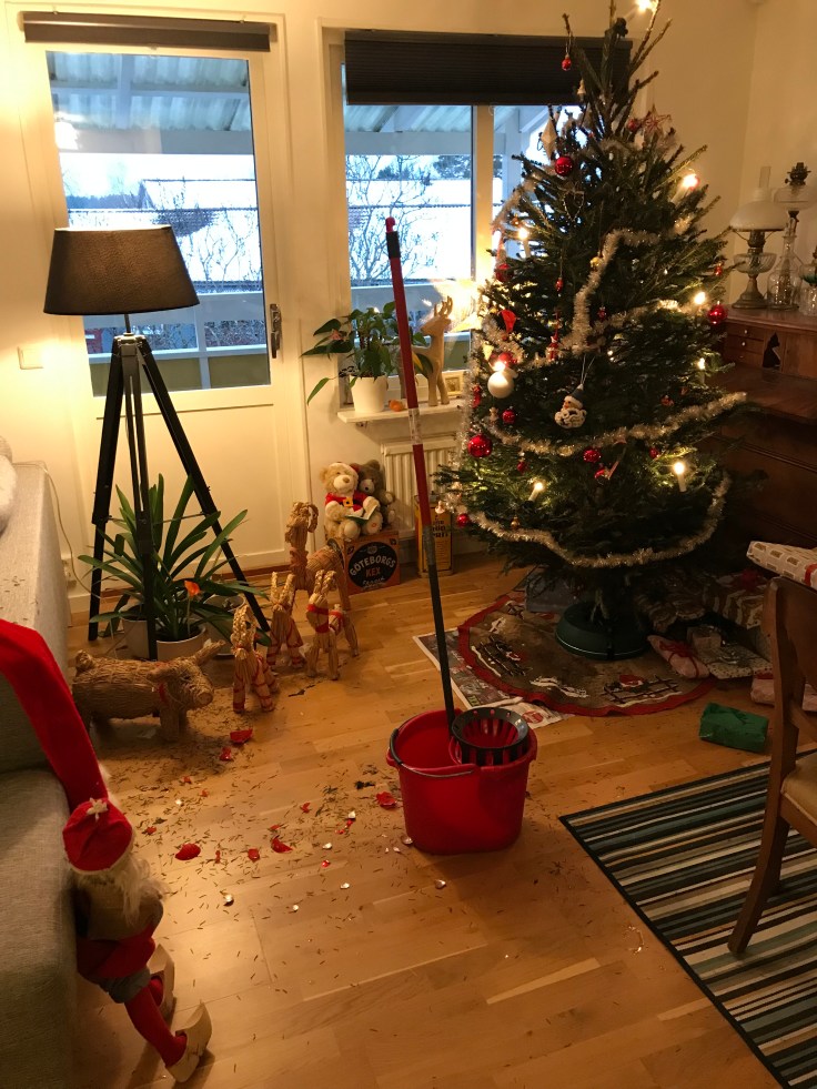 Just det, vet ni vad som hände imorse? Gissa om jag blev 😱 när jag satt helt fredligt i soffan och jobbade (hemifrån) och granen plötsligt rasade över mig! Hela granen inklusive fot välte, vilket också betyder att allt nypåfyllt vatten också rann ut…över alla julklappar😫 Alltså, hur är det möjligt? Tur ändå att jag satt hemma (med migrän, yay!)