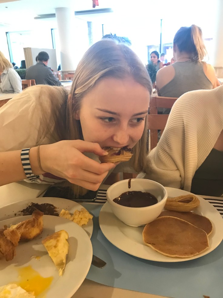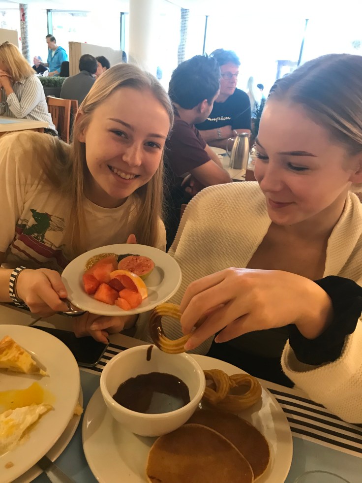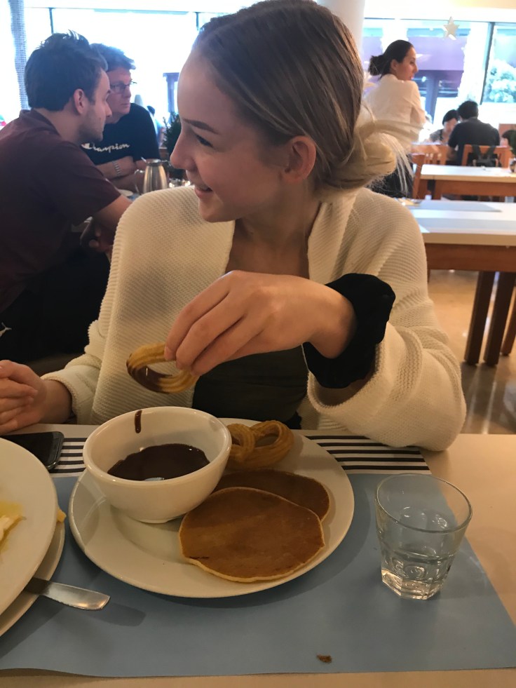 Först lite frukost. Här är Linas ideala (o)nyttiga frukosttallrik, choklad, churros och pannkakor 😊👍
