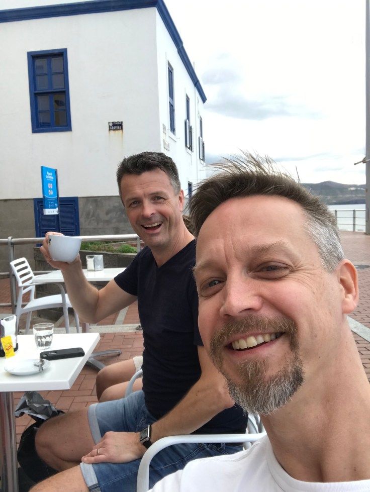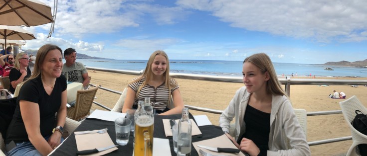 Vi tänkte först ta lokalbussen till Las Palmas, den skulle gå en gång i halvtimmen och ta ca 1 timme. När vi kom fram till hållplatsen stod det redan ganska många där och väntade, det visade sig att bussen innan bara hade åkt förbi eftersom den var fullsatt. Vår buss blev sen försenad 20 min och visade sig också vara fullsatt! Så, vi tog taxi istället, det tog 30 min, bra beslut!