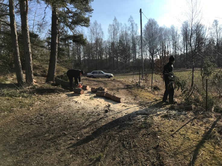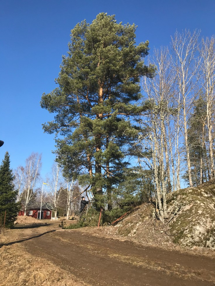 Uppdraget för idag är att ta ner den del av tallen som hänger ut lite över vägen så att lasset med nytt hus ska kunna ta sig in på tomten.