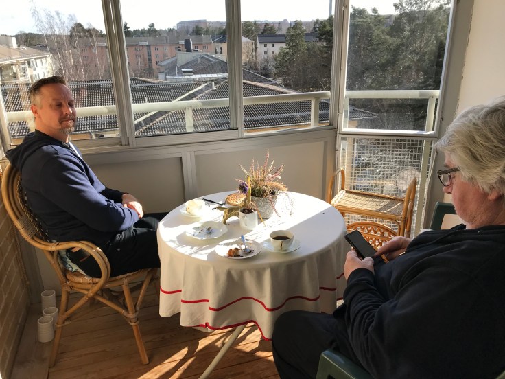 Dagen bjöd på strålande sol så Magnus passade på att få lite sol på sig på balkongen. Himla bra så här års med inglasad balkong och skjutbara rutor. När det är kallt ute så värmer solen inne på balkongen och så kan man öppna ett fönster så man får lite sol på sig, perfekt😊👍