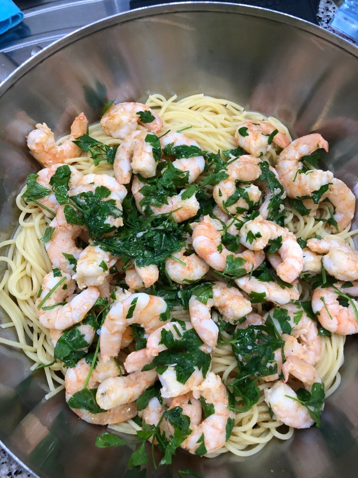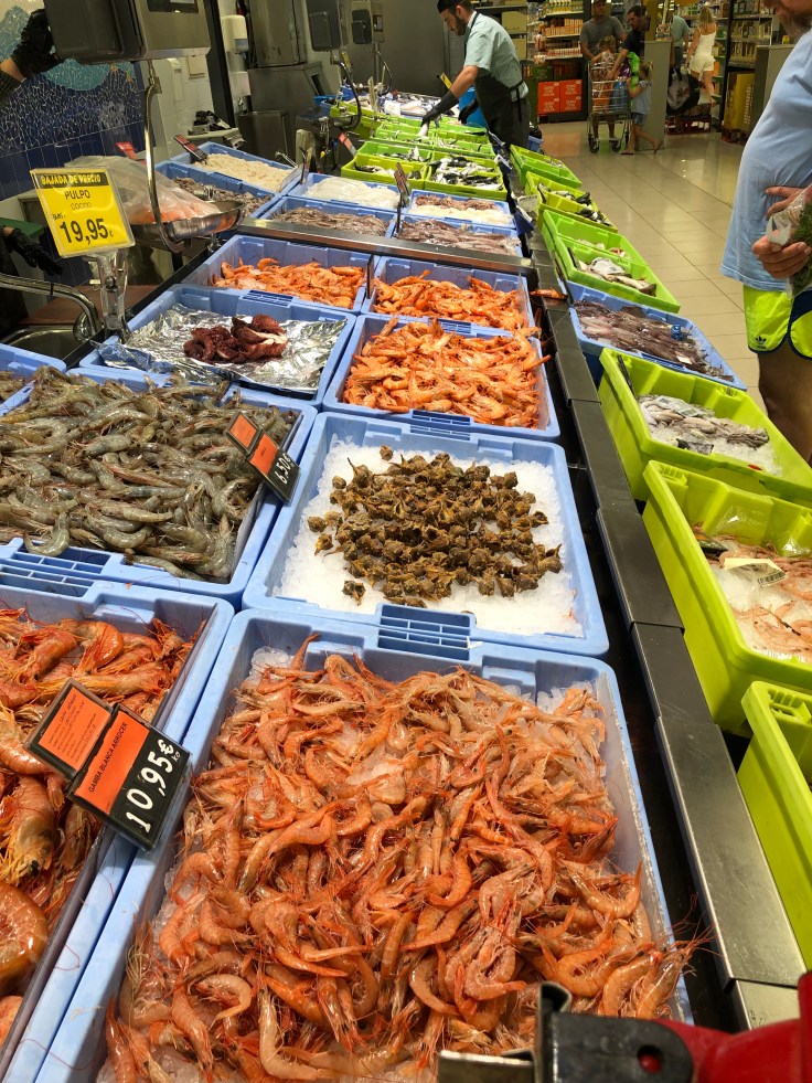 De hade också en stor fisk- och skaldjursdisk. Magnus köpte lite stora färska räkor där.