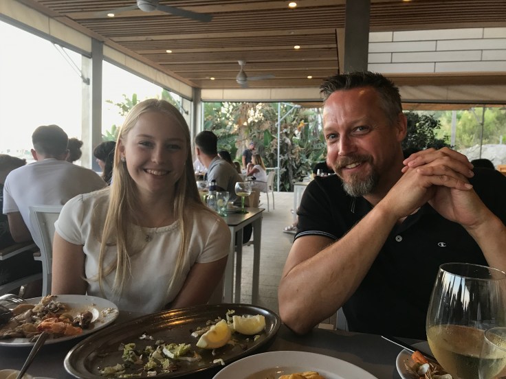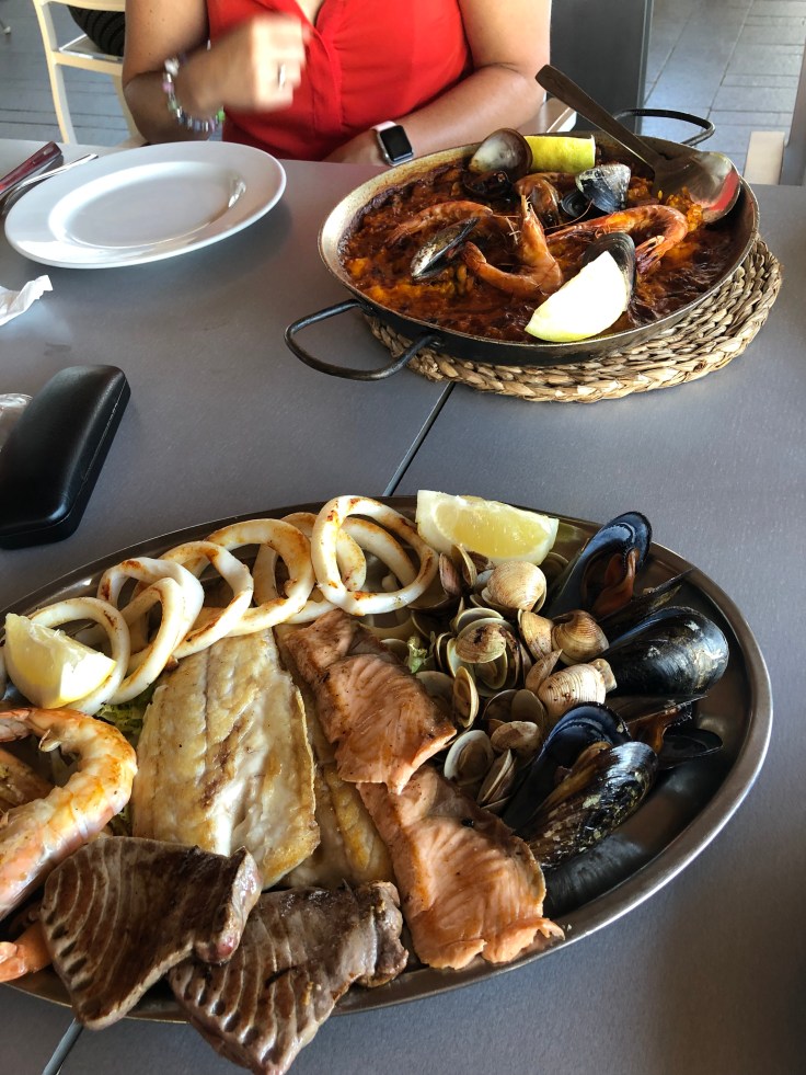 En stor fisk- och skaldjurstallrik och en Paella delade vi på och orkade knappt äta upp allt!