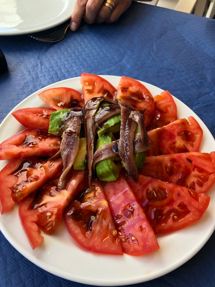 Förrätt: tomater med avokado och sardeller.
