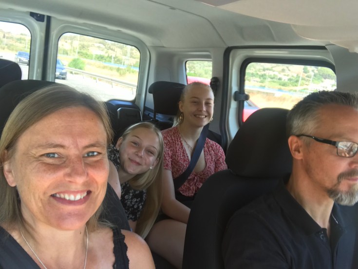 Hela fam Asplund i bilen, redo för dagens utflykt!