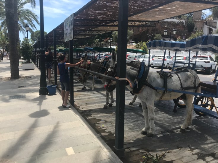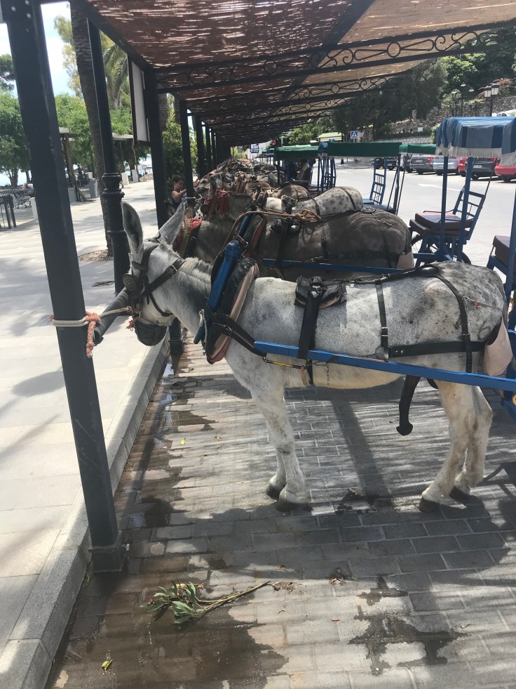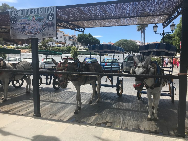 Carina har pratat mycket om de stackars åsnorna i Mijas och här är dom, ståendes på rad och väntar på att ta turister runt byn.