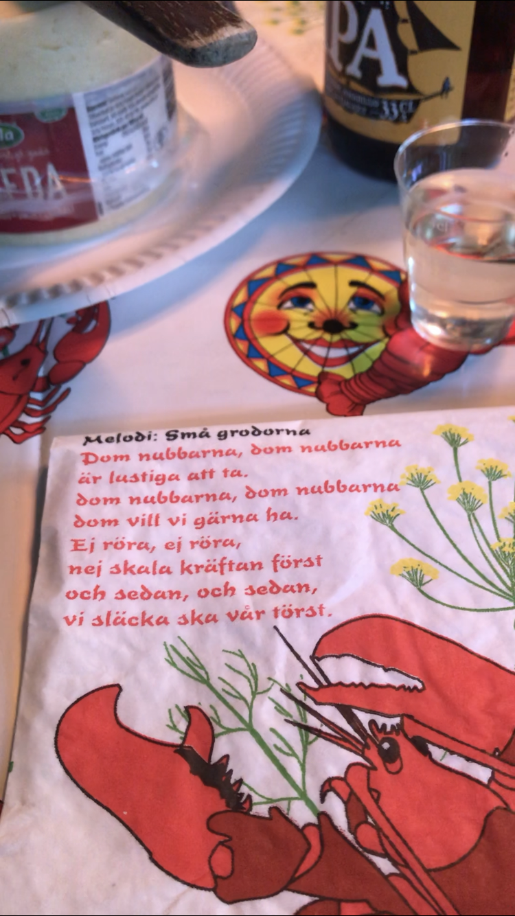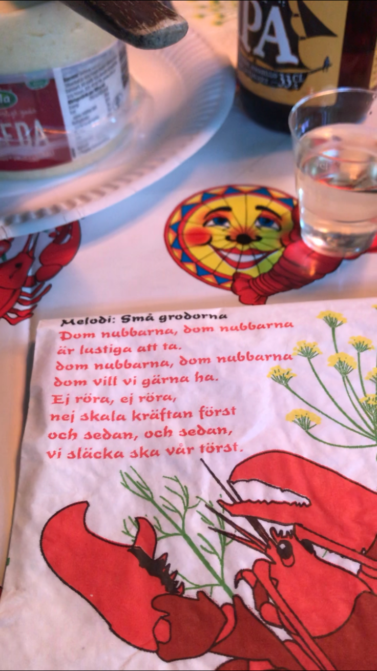 Ingela hade fixat servetter med snapsvisor på, och då var vi ju tvungna att sjunga!