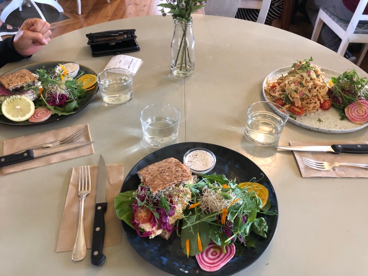 …åker vi och äter lunch och fikar på Open New Doors Bahnhof utanför Mjölby. Ett växtbaserat café som vi har hört talas om.