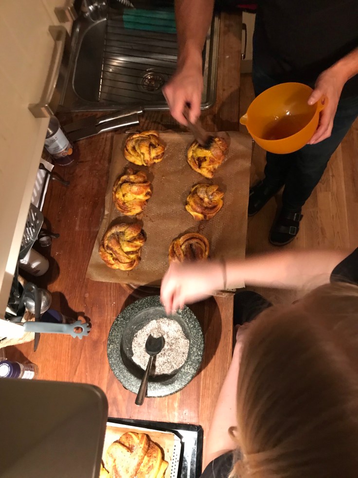 Nu ska dom först penslas med en blandning av sirap och varmt vatten och sen ska man igen strössla med kardemumma och strösocker.
