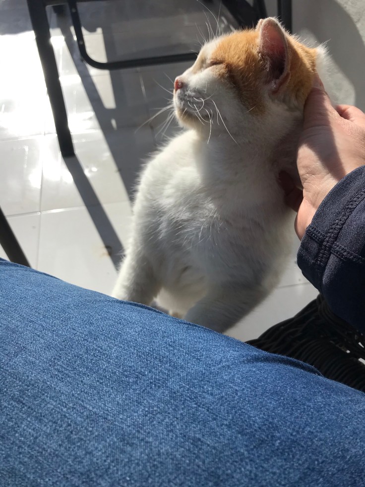 Tove satt på balkongen och lyssnade när jag snällt försökte avfärda kelattacken ”No, por favor lilla katt!” 😊