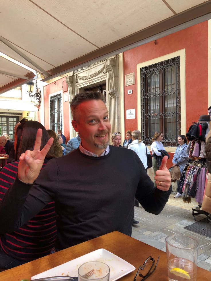 Efter ett mindre äventyr med att hitta en parkeringsplats (vi var bland annat inne och vände på den centrala gågatan😱), så hittade vi till slut en plats, efter lite hjälp från en hjältespanjor, som lämnade sin plats till oss🙏 Första målet nu är en liten Pinchos- och tapasbar, Casa Lola, som Tove och Magnus spanade in sist men aldrig testade eftersom de redan hade ätit då. Här tänkte vi äta lunch.