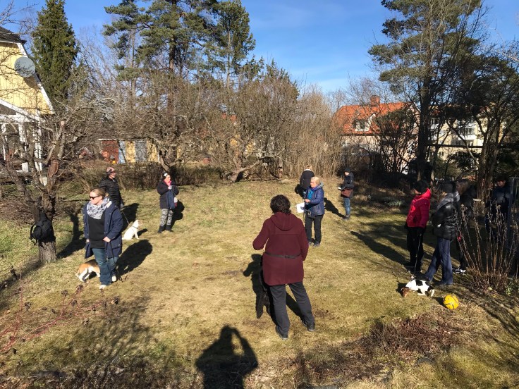 Samling i trädgården med avstånd till varandra medan vi väntar på att alla är på plats.