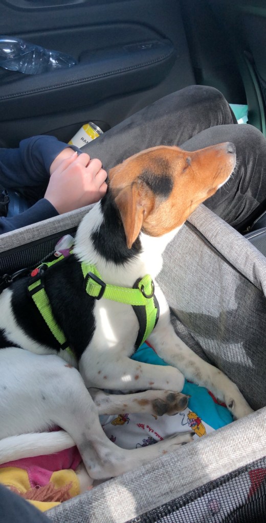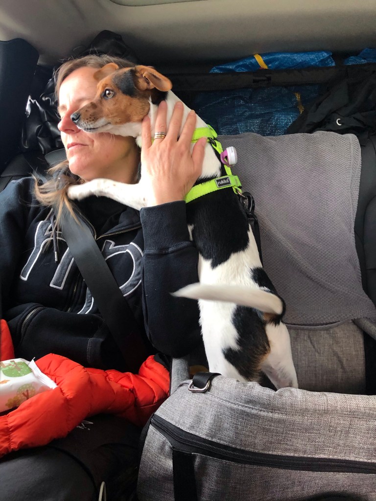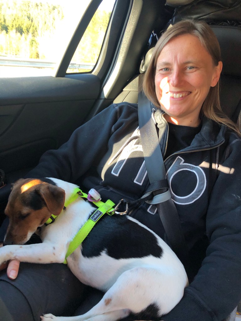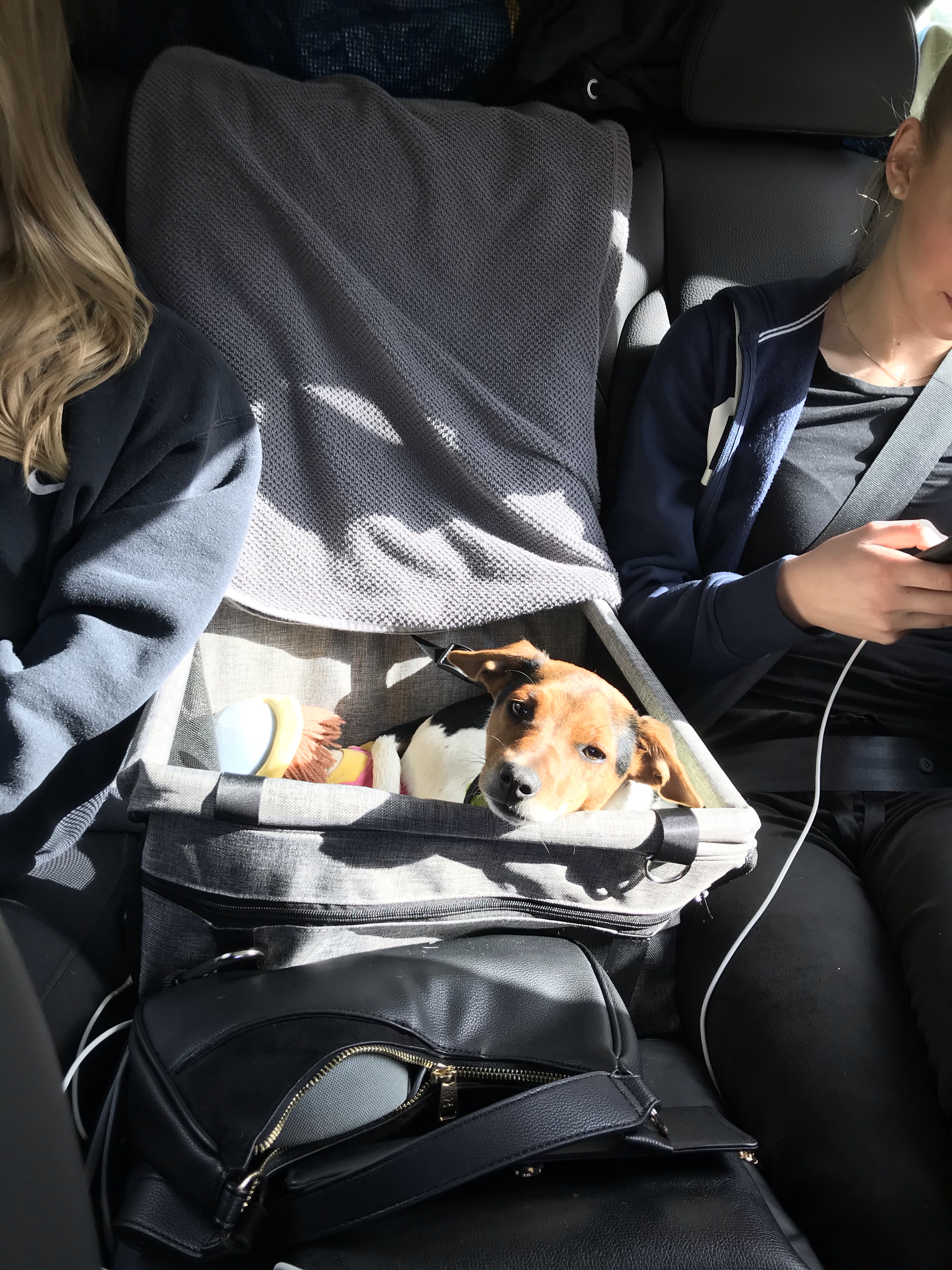 Det här blir Hugos första långresa i bil. Vi har övat men mest åkt fram och tillbaka till Linas skola och någon enstaka gång till mormor för distansfika. Den här gången satsar vi på hundbilstolen som vi köpte från Toves kompis. Den är lite smidigare än buren och i den kan han se ut lite bättre. Det visade sig vara en hit! Han gillade att ligga i den.