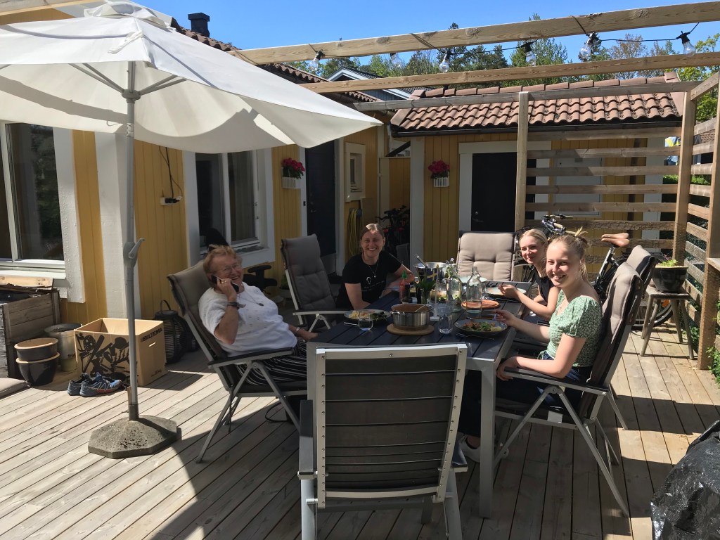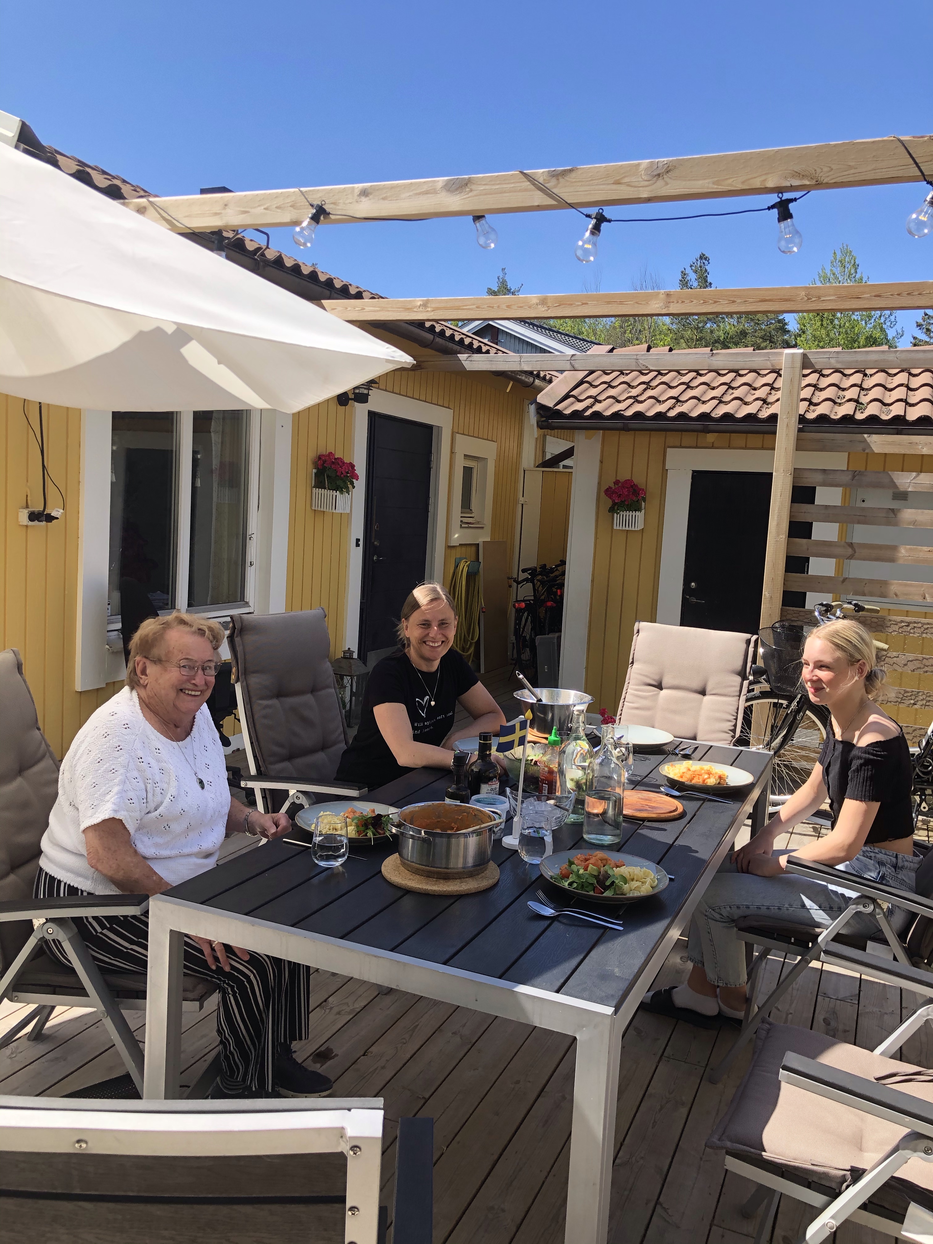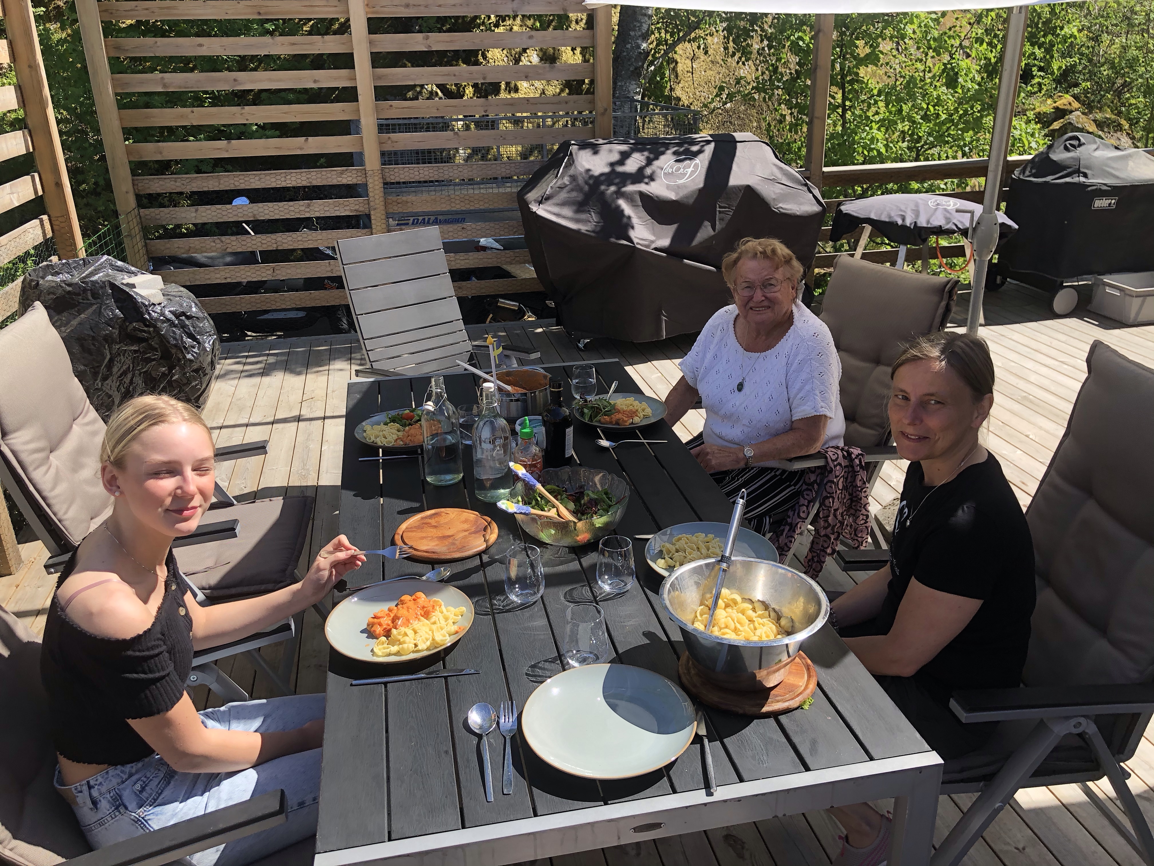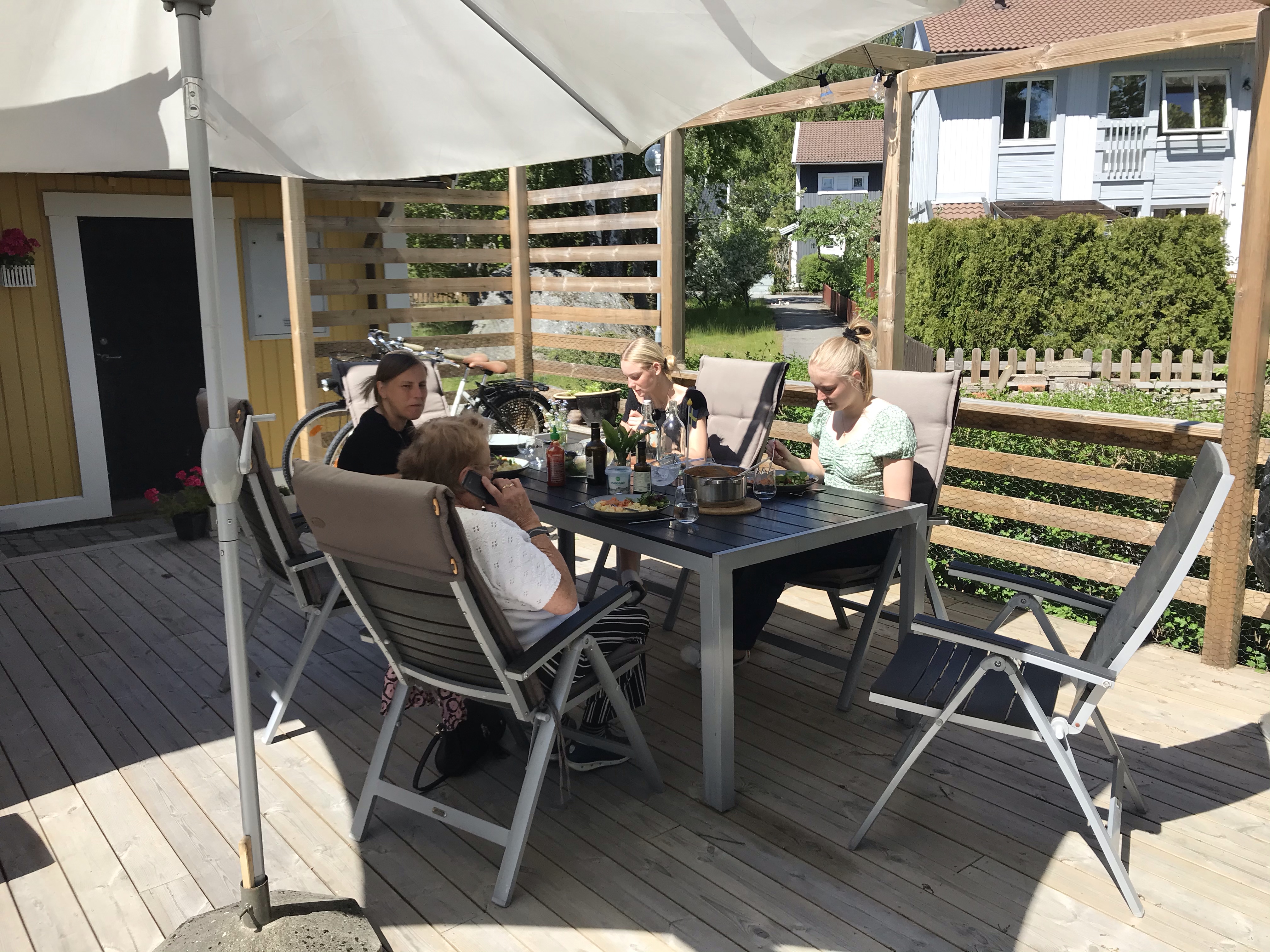 På eftermiddagen fick mamma smita iväg från sin Covid-19 isolering några timmar och kom över på lite lunch och fika i solen!