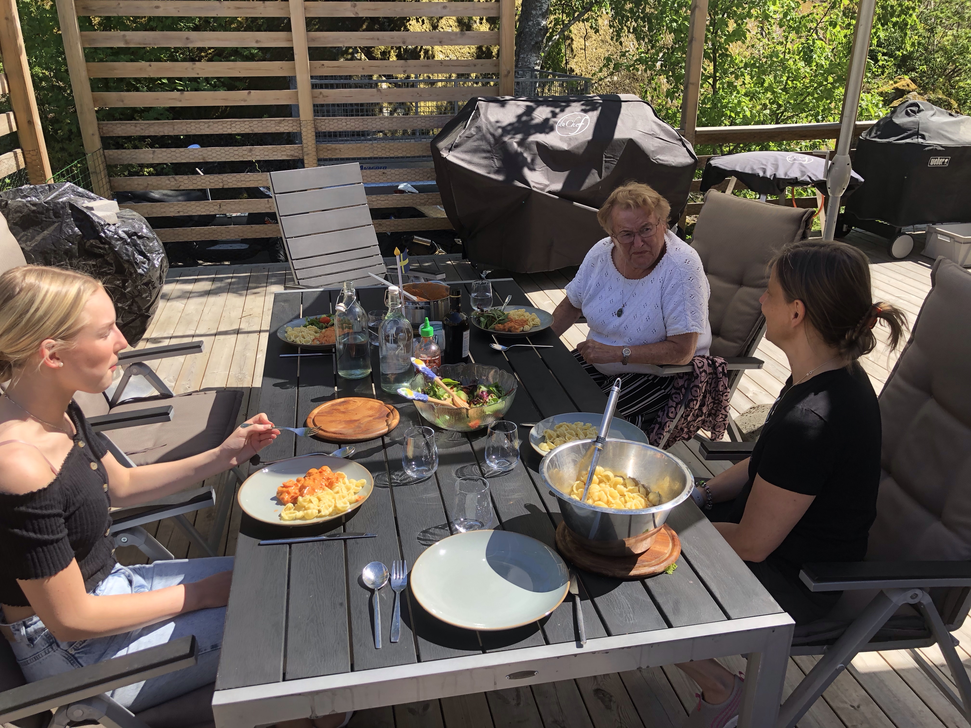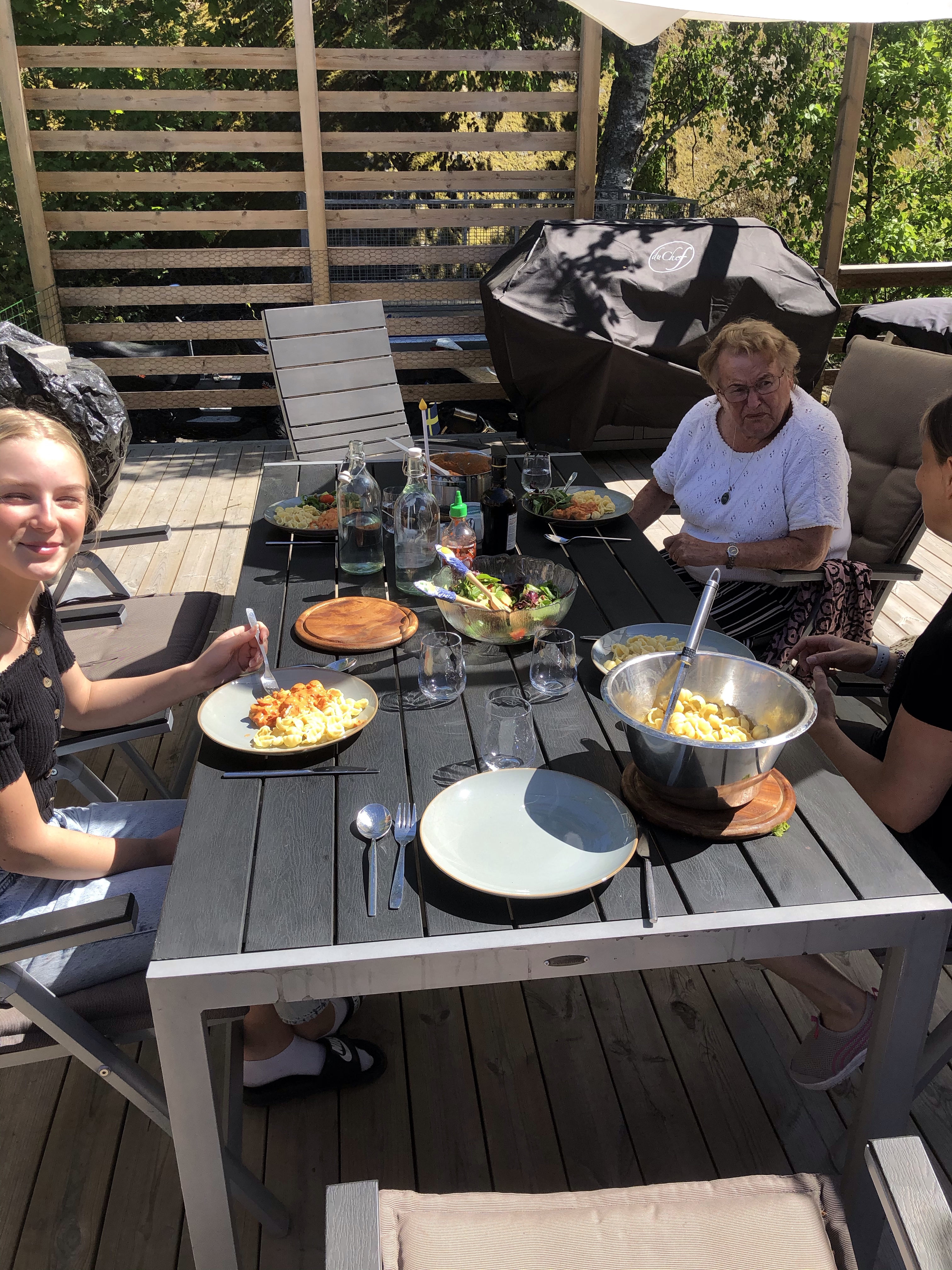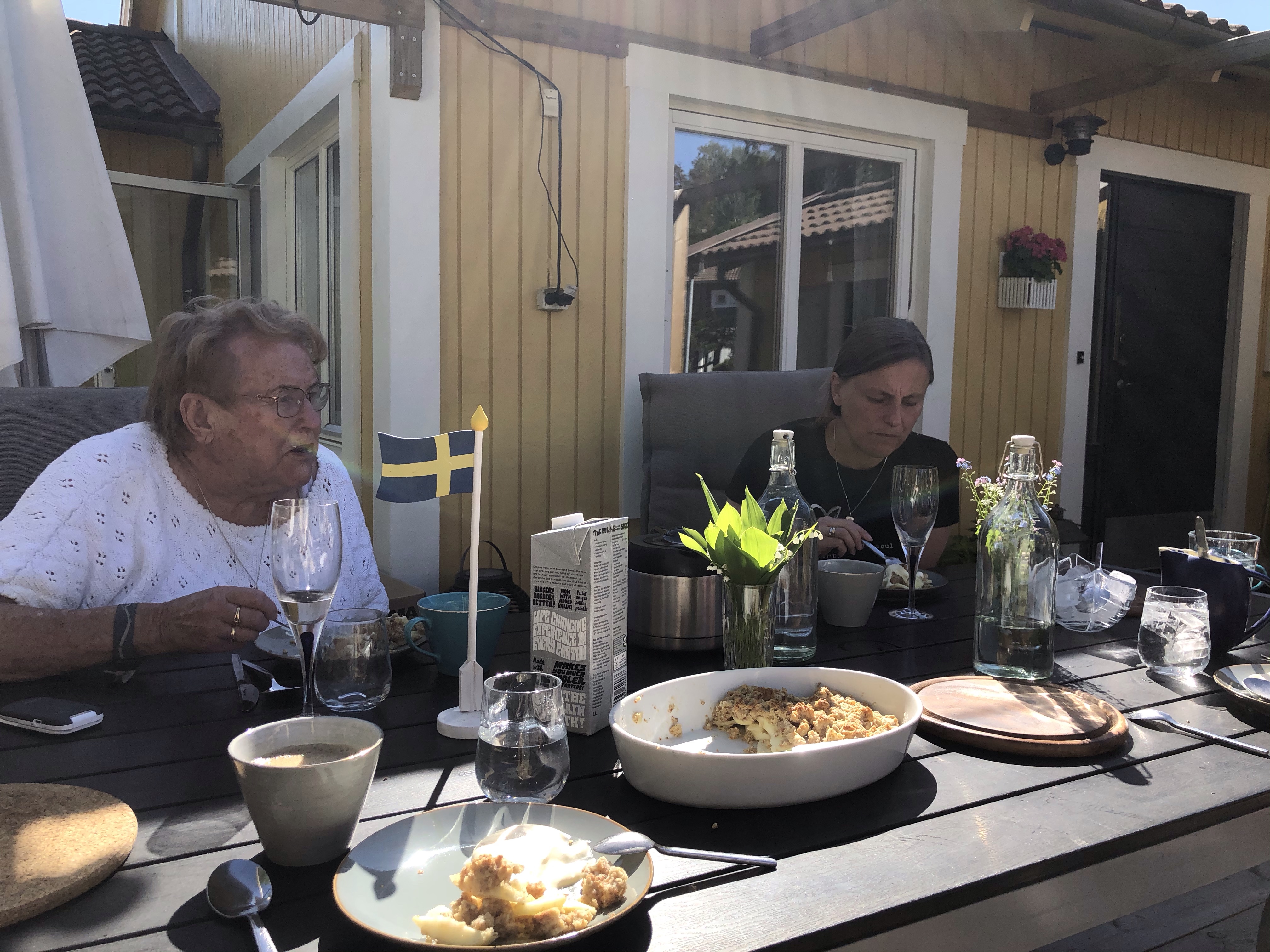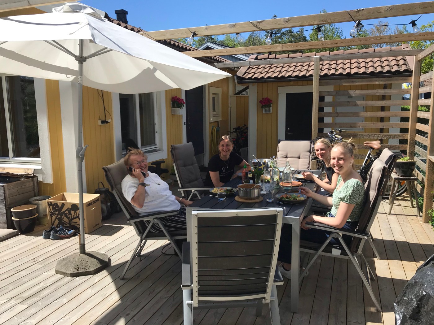 På eftermiddagen fick mamma smita iväg från sin Covid-19 isolering några timmar och kom över på lite lunch och fika i solen!