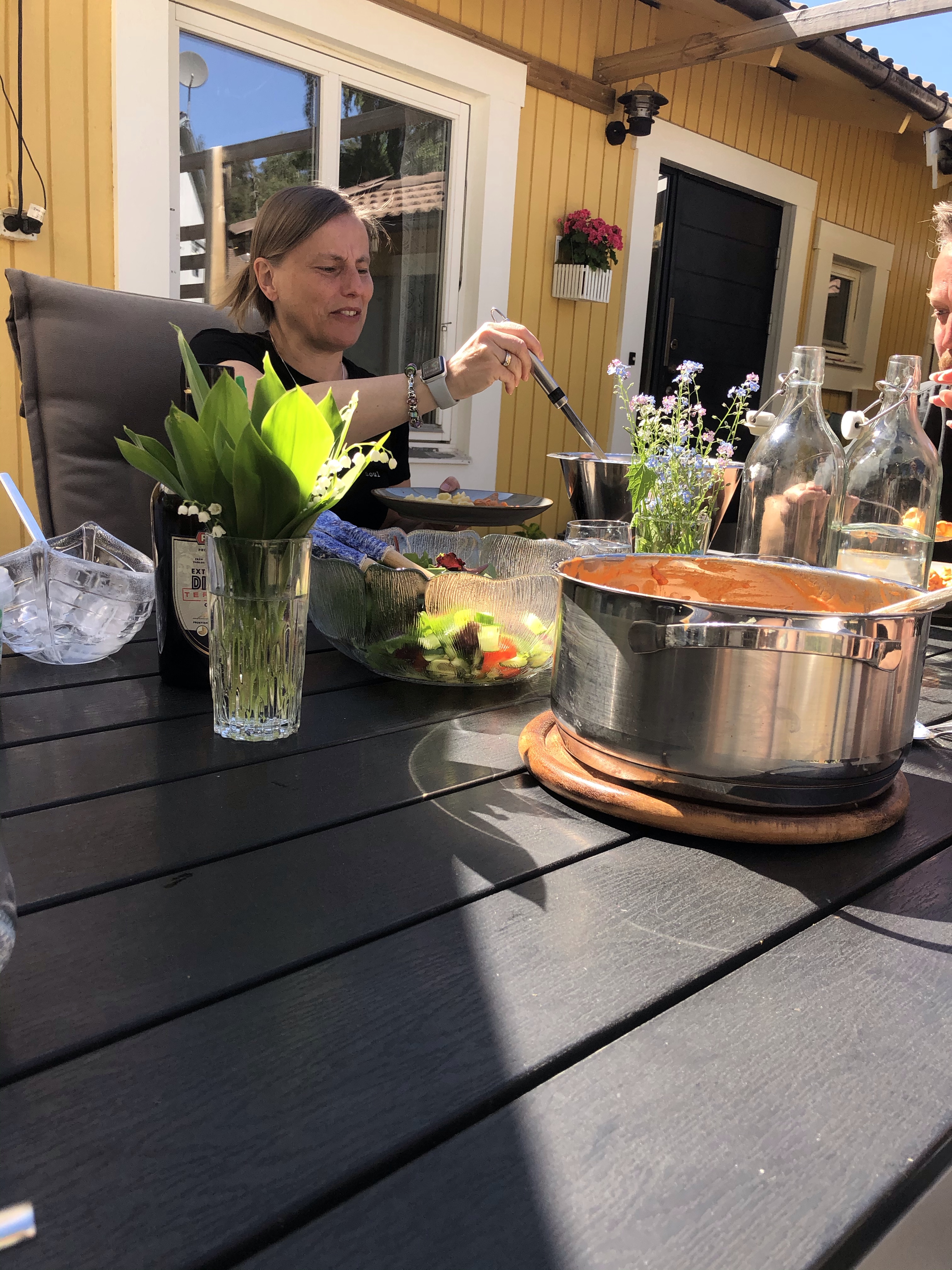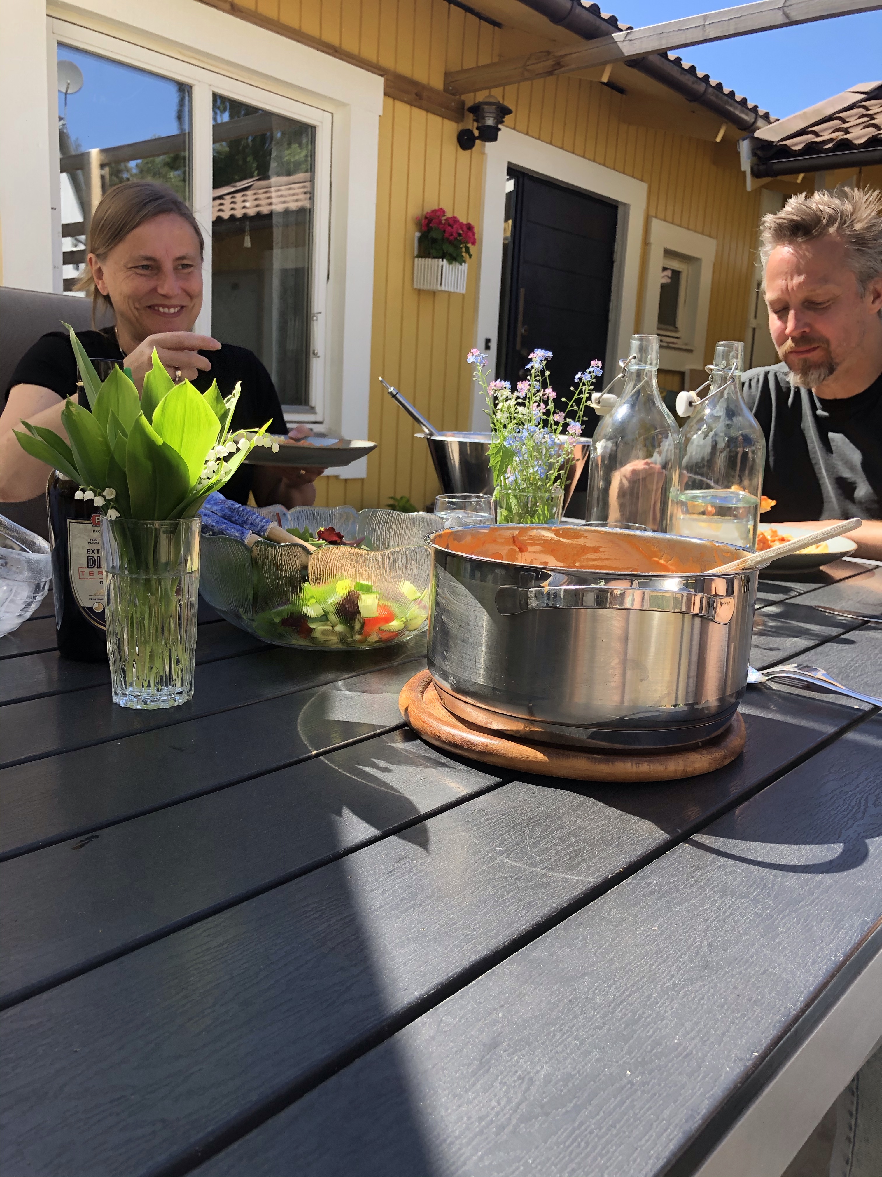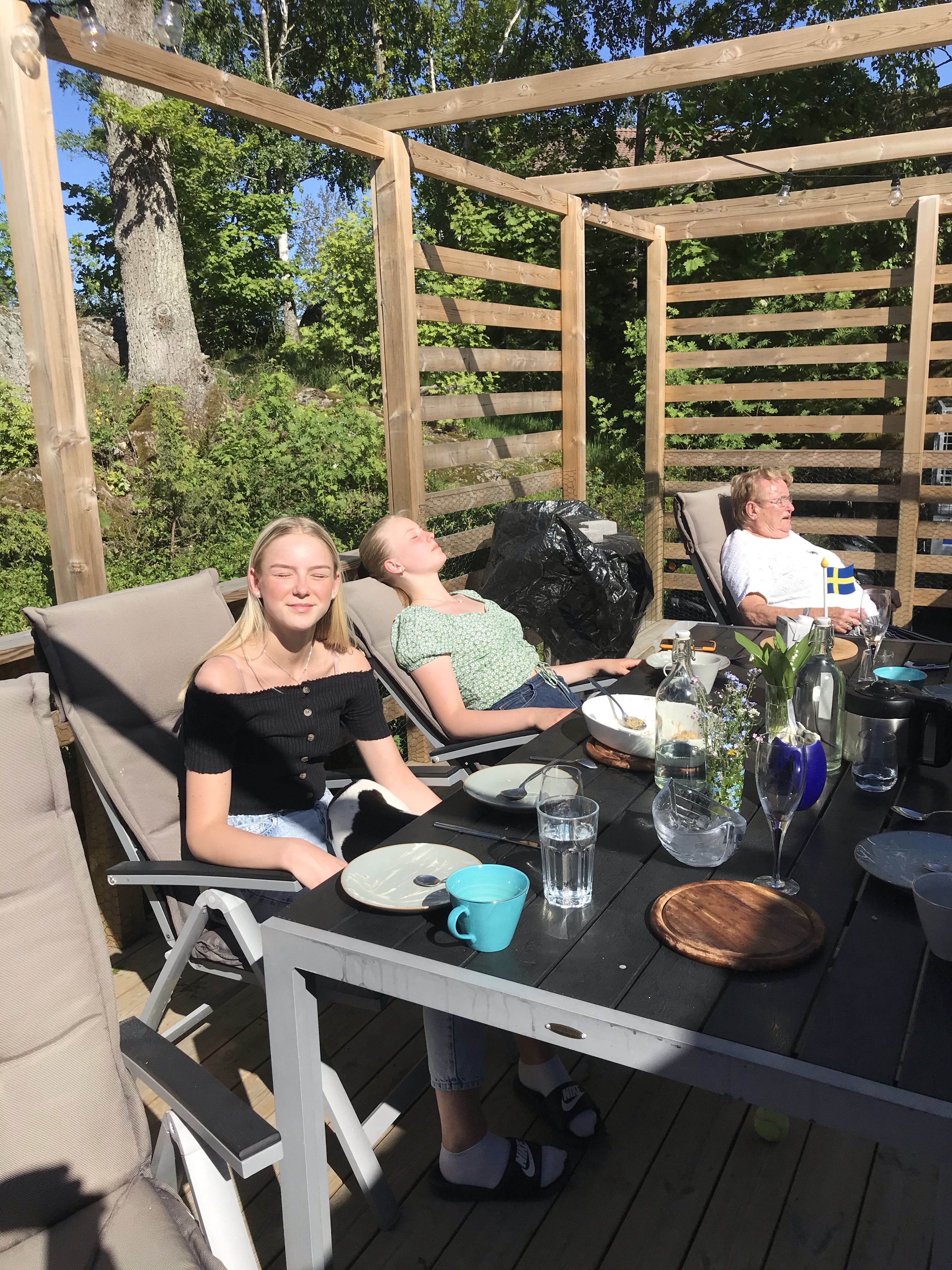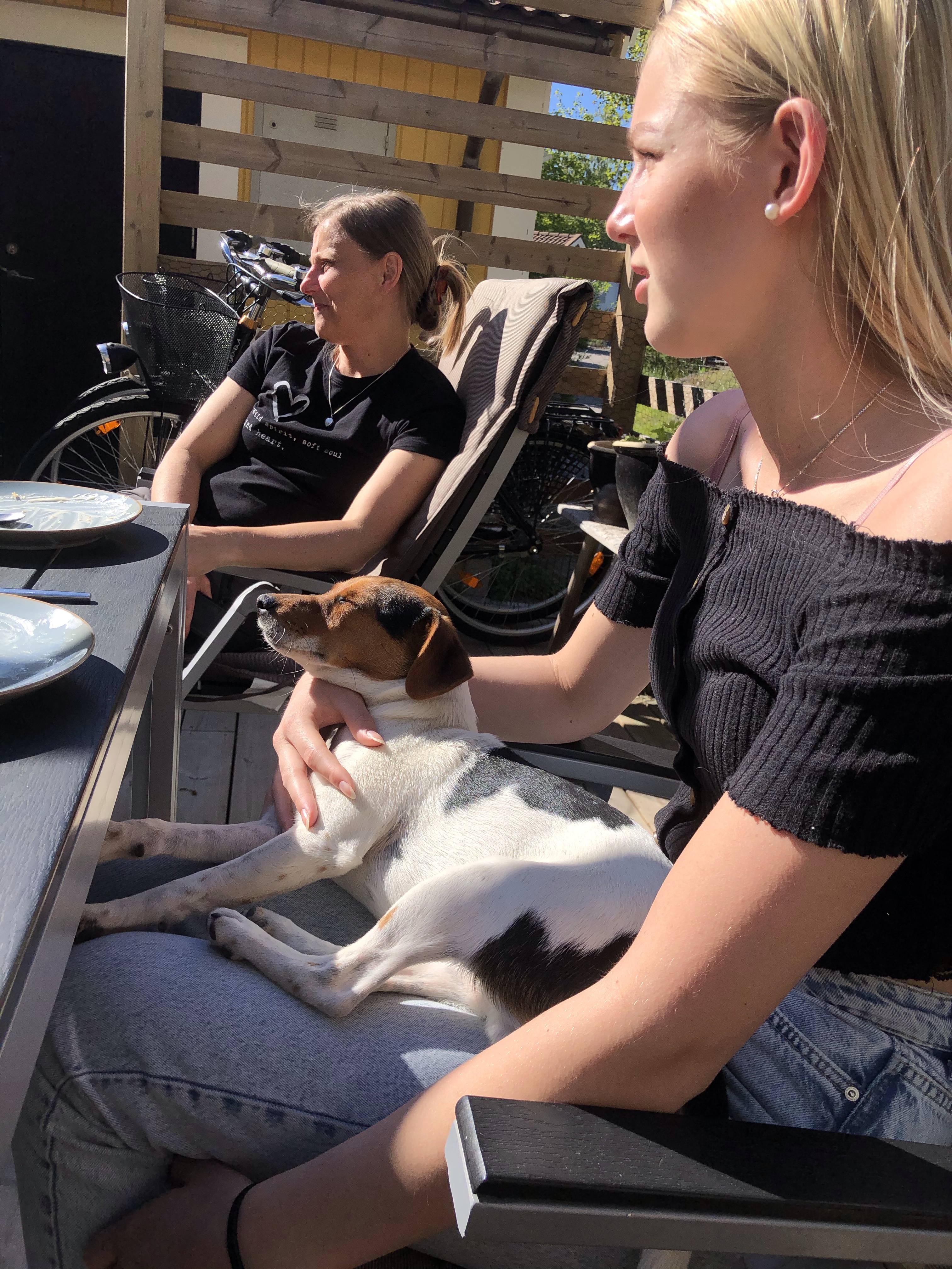 På eftermiddagen fick mamma smita iväg från sin Covid-19 isolering några timmar och kom över på lite lunch och fika i solen!