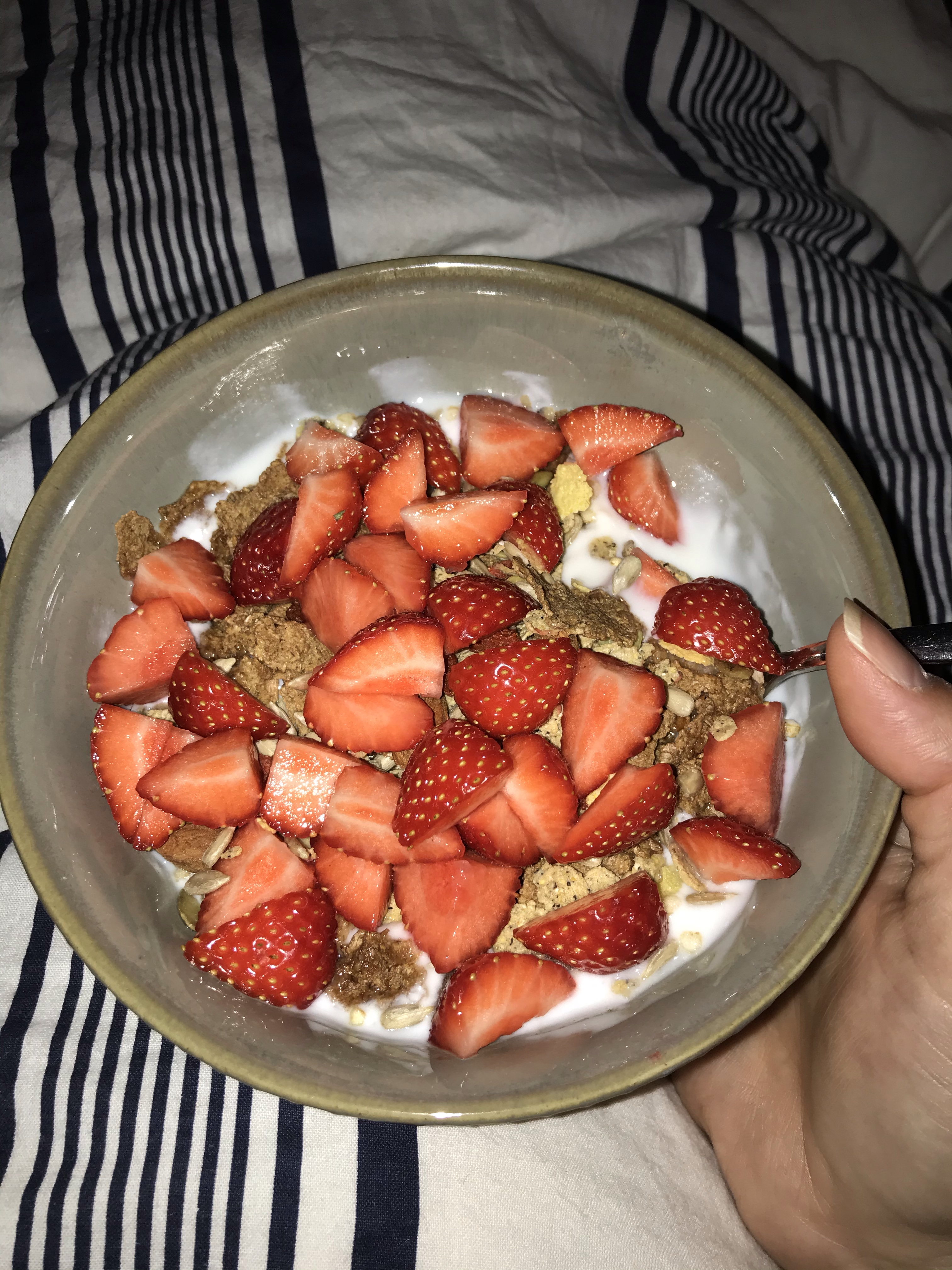 Jag fick frukost på sängen med fil, flingor och färska jordgubbar. Dessutom nyplockade sommarblommor 🙏 Så gulligt❤️
