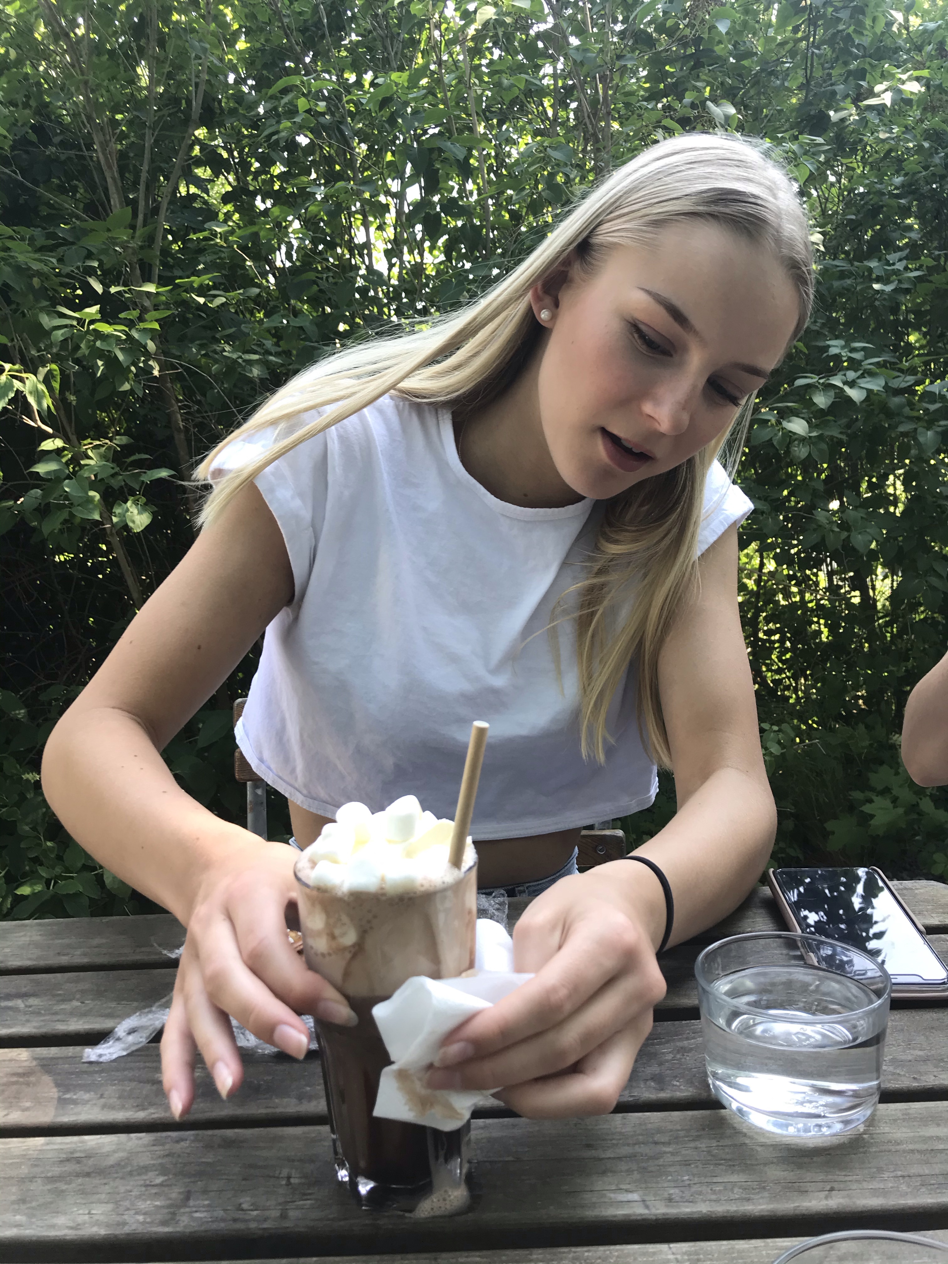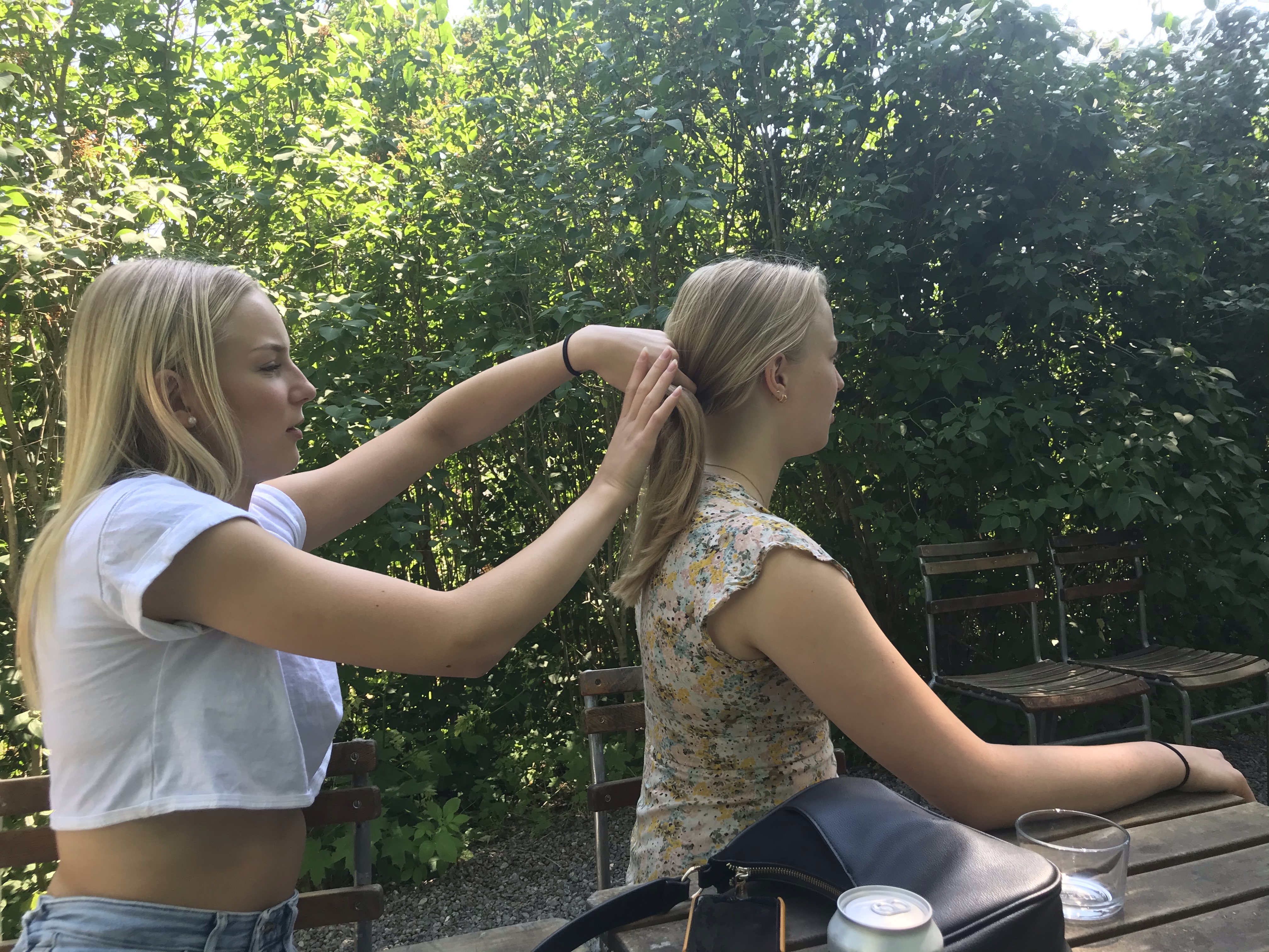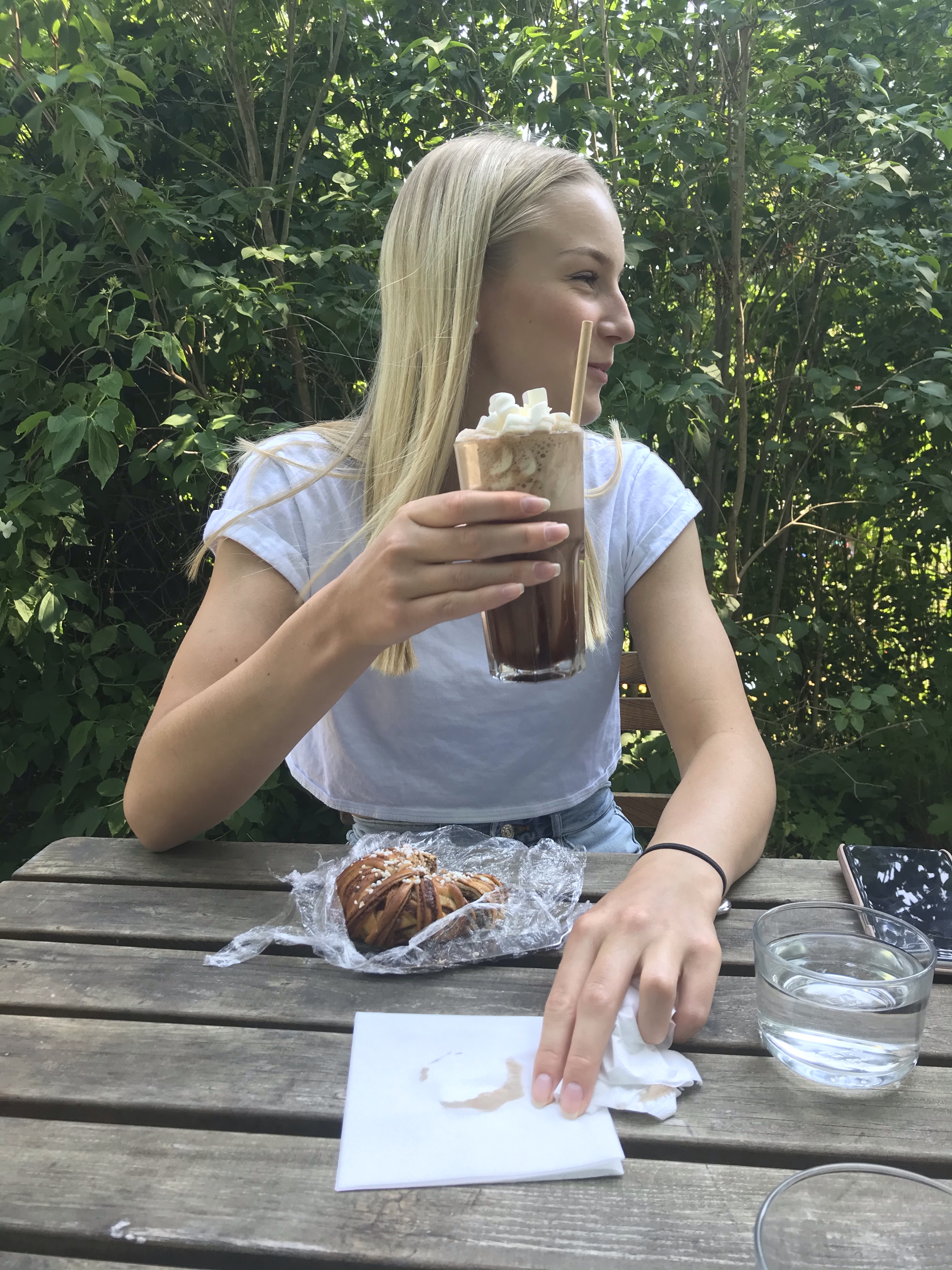 På eftermiddagen åt vi en sen lunch på Herrängens gård. Vi hade riktigt tur med både väder och plats. Så mysigt ställe, en liten oas mitt i ett bostadsområde, precis nere vid Långsjön. När vi kom hem gjorde hon sig iordning för att fira vidare med sina kompisar.
