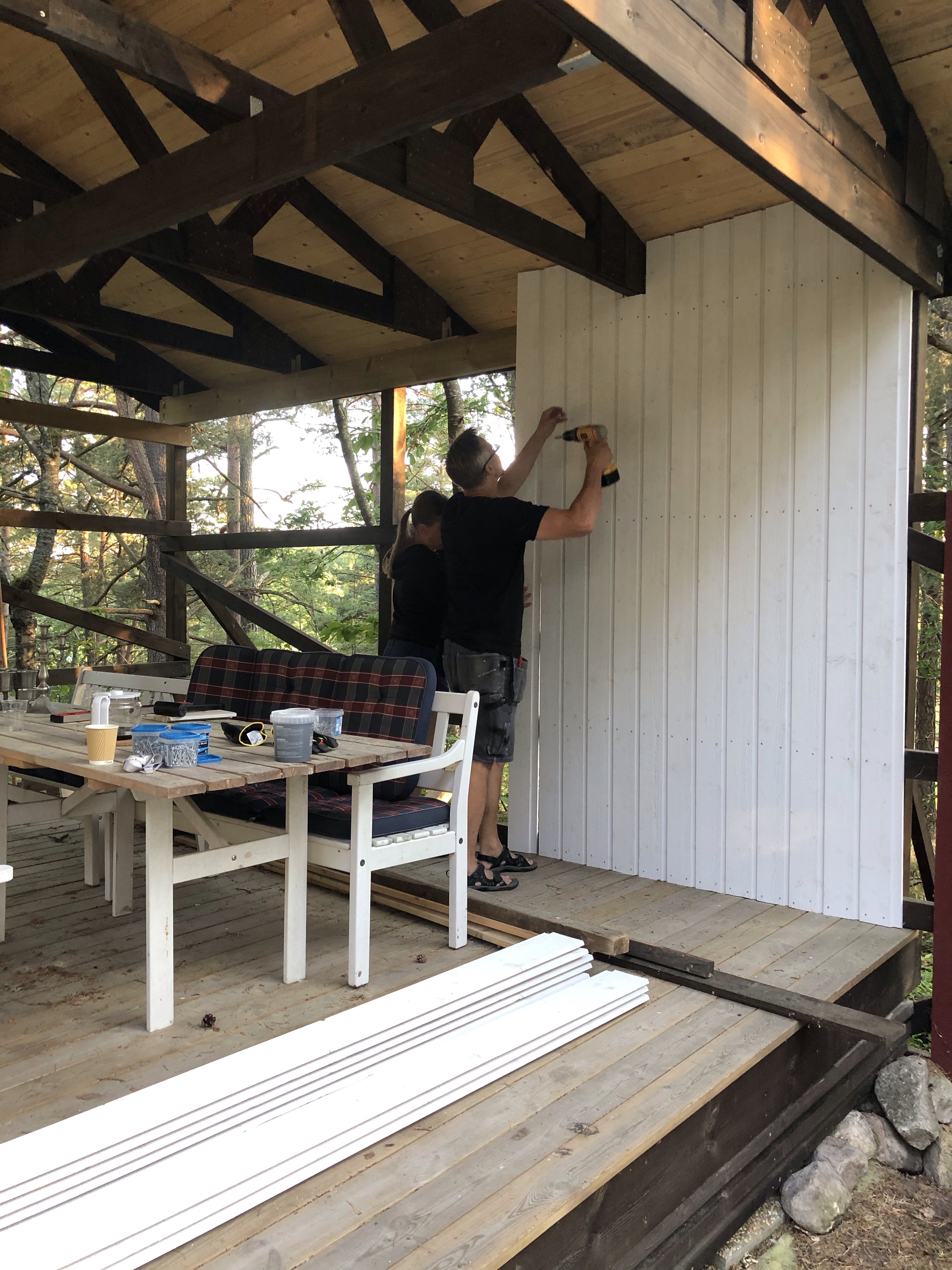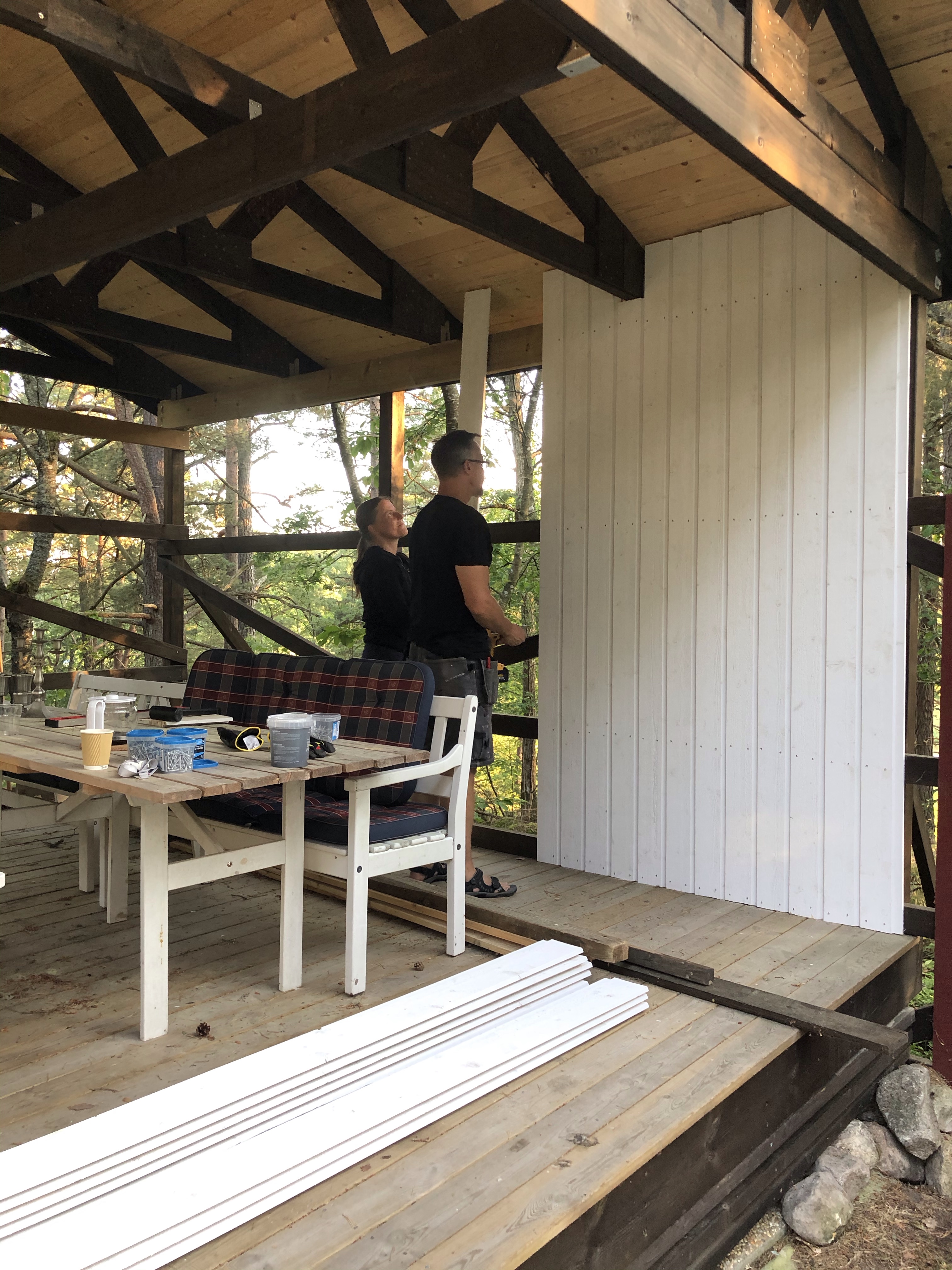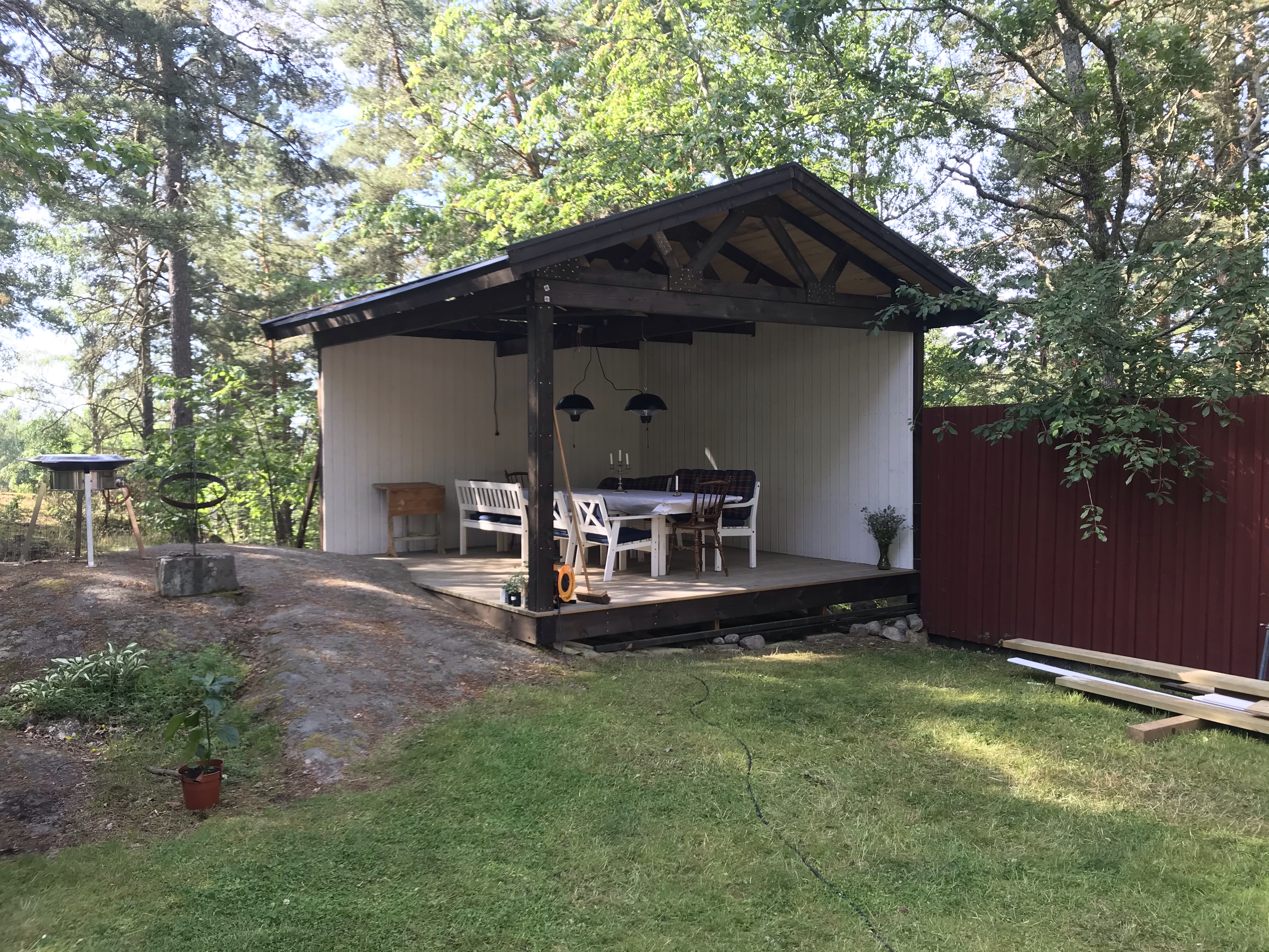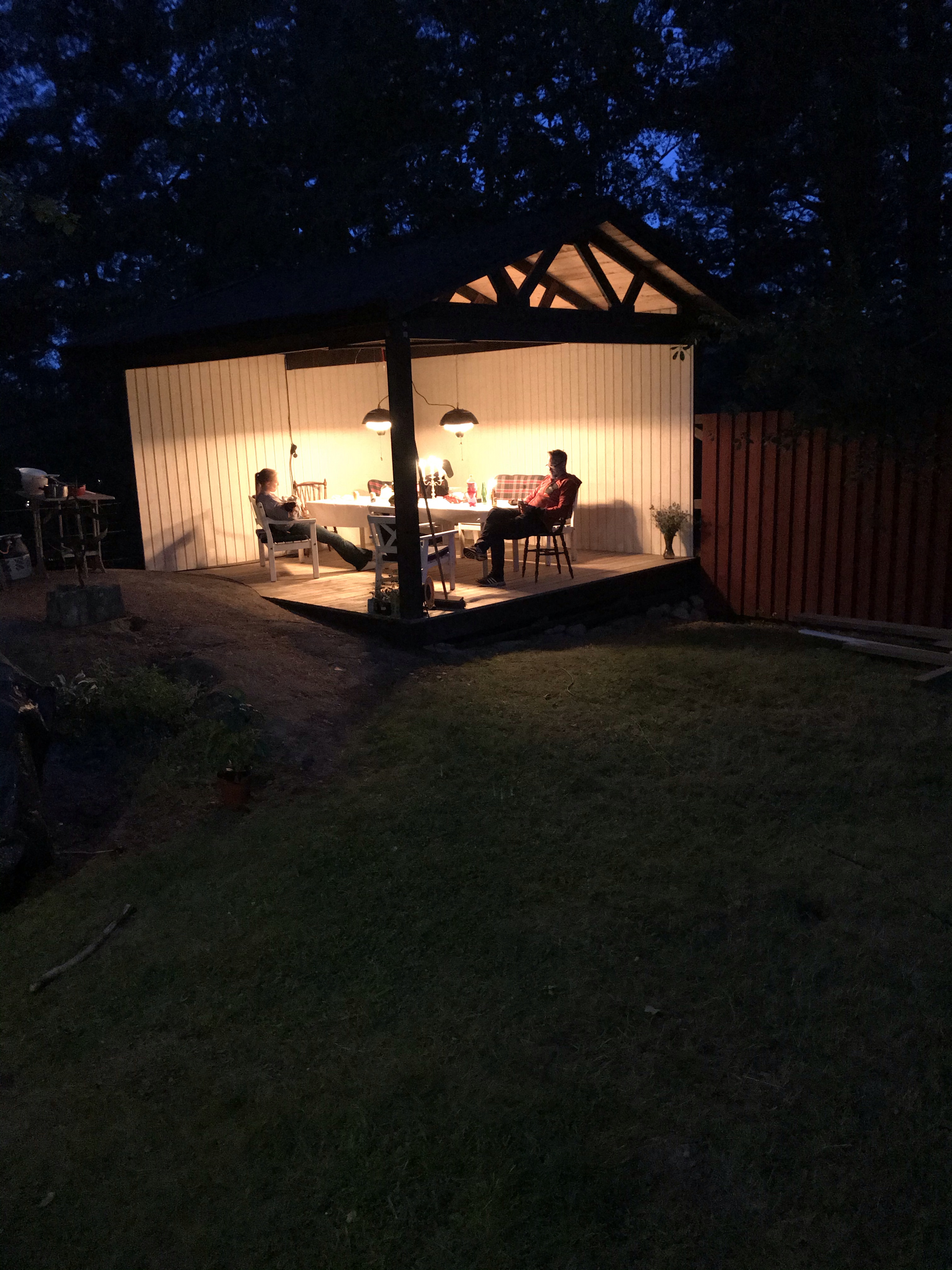 Vi har också byggd klart väggarna på uterummet, terassen, altanen, salongen eller vad vi nu ska kalla det😊 Det blev jättemysigt! Som ett extra rum där man kan vara oavsett om det regnar. Vi har också hängt upp två värmelampor så på kvällen behöver man inte ens frysa😊👍