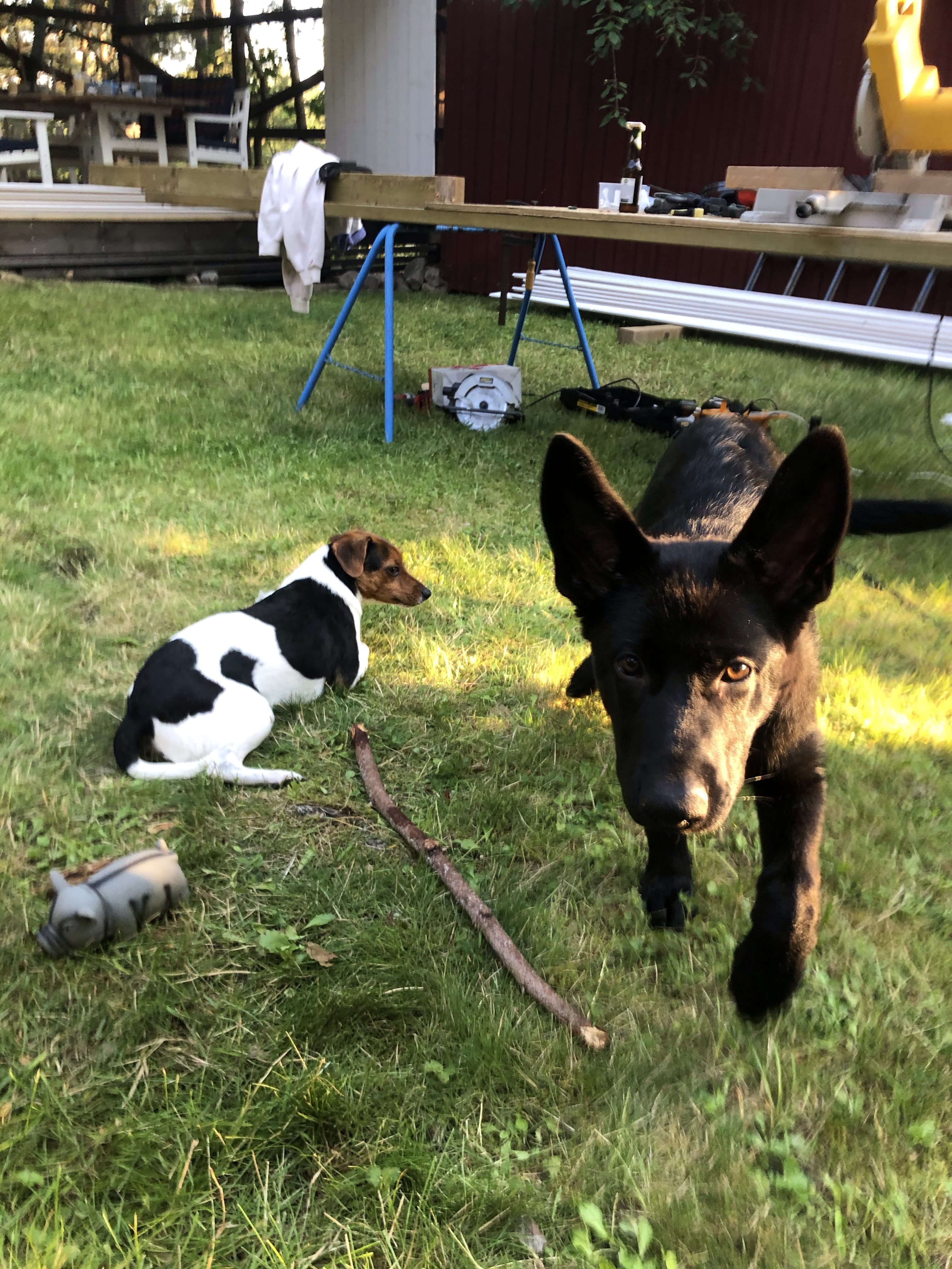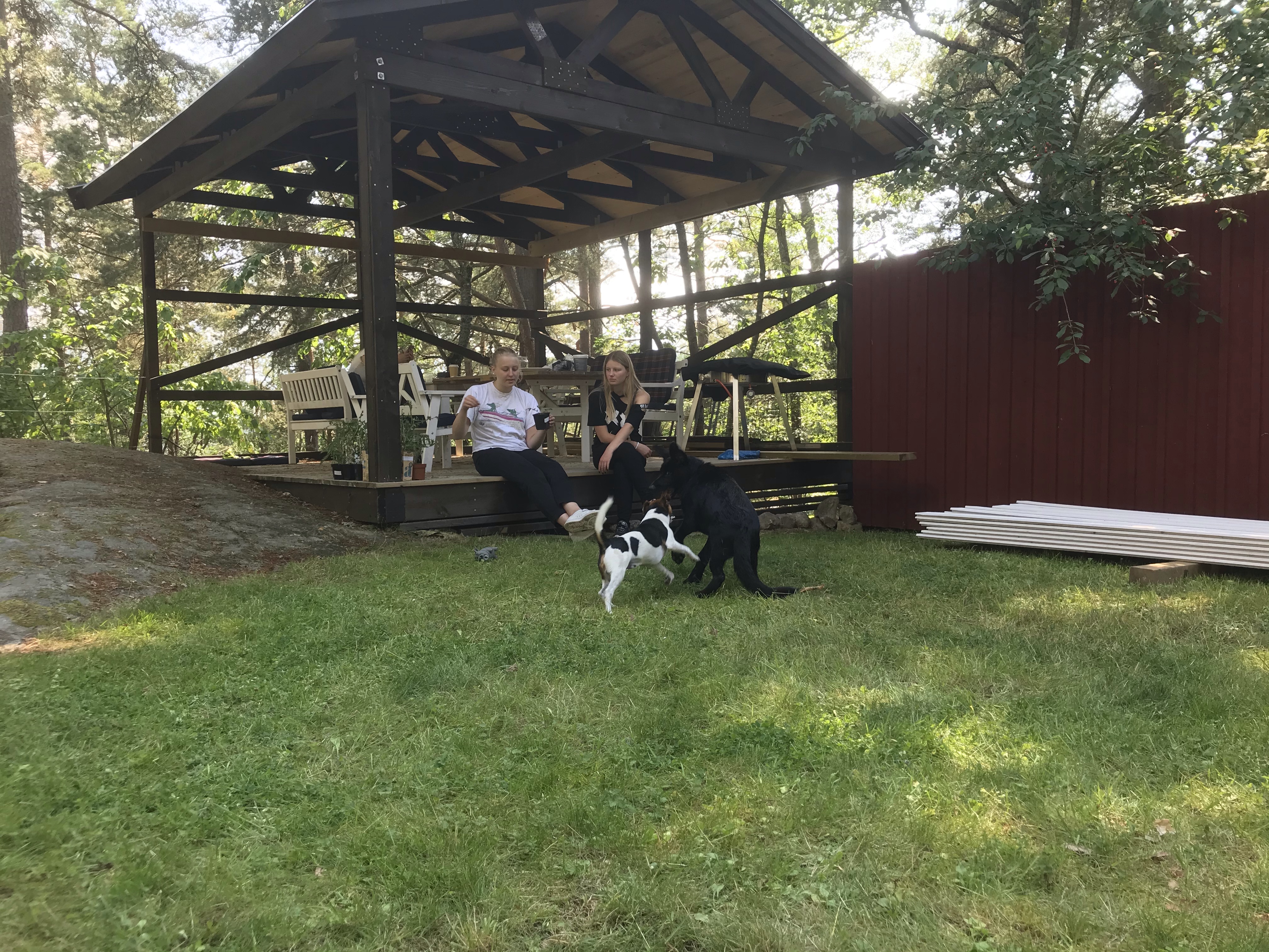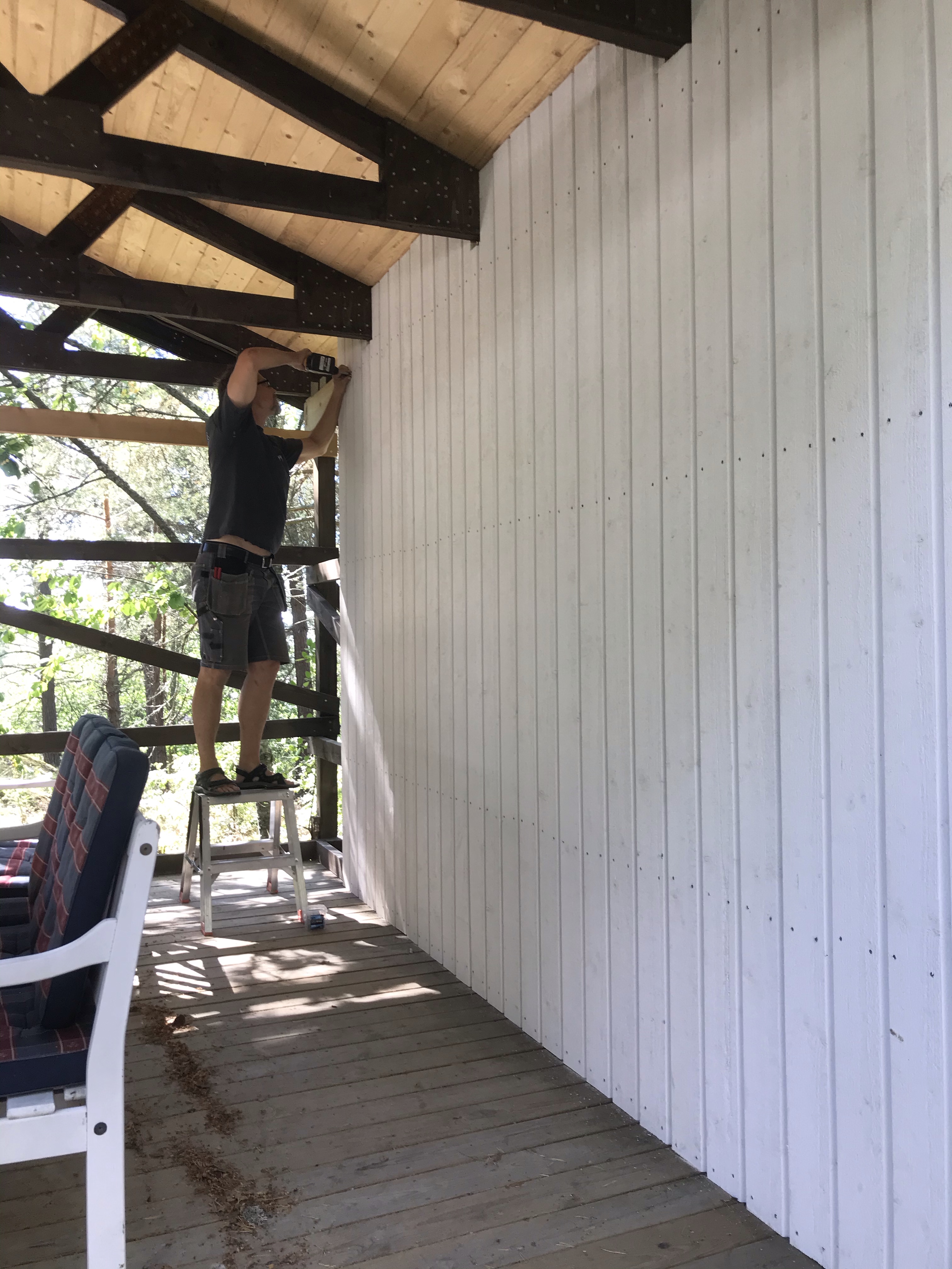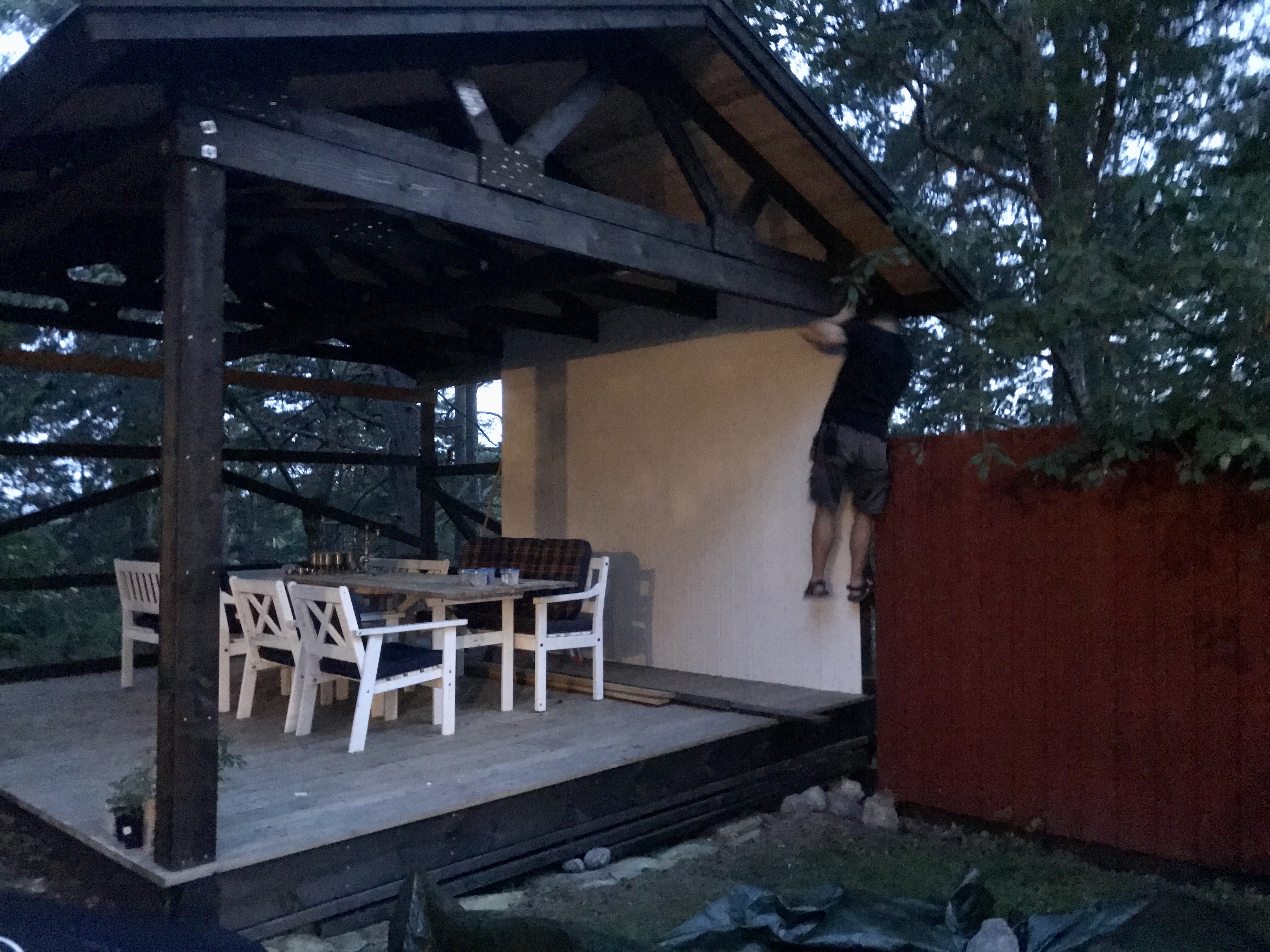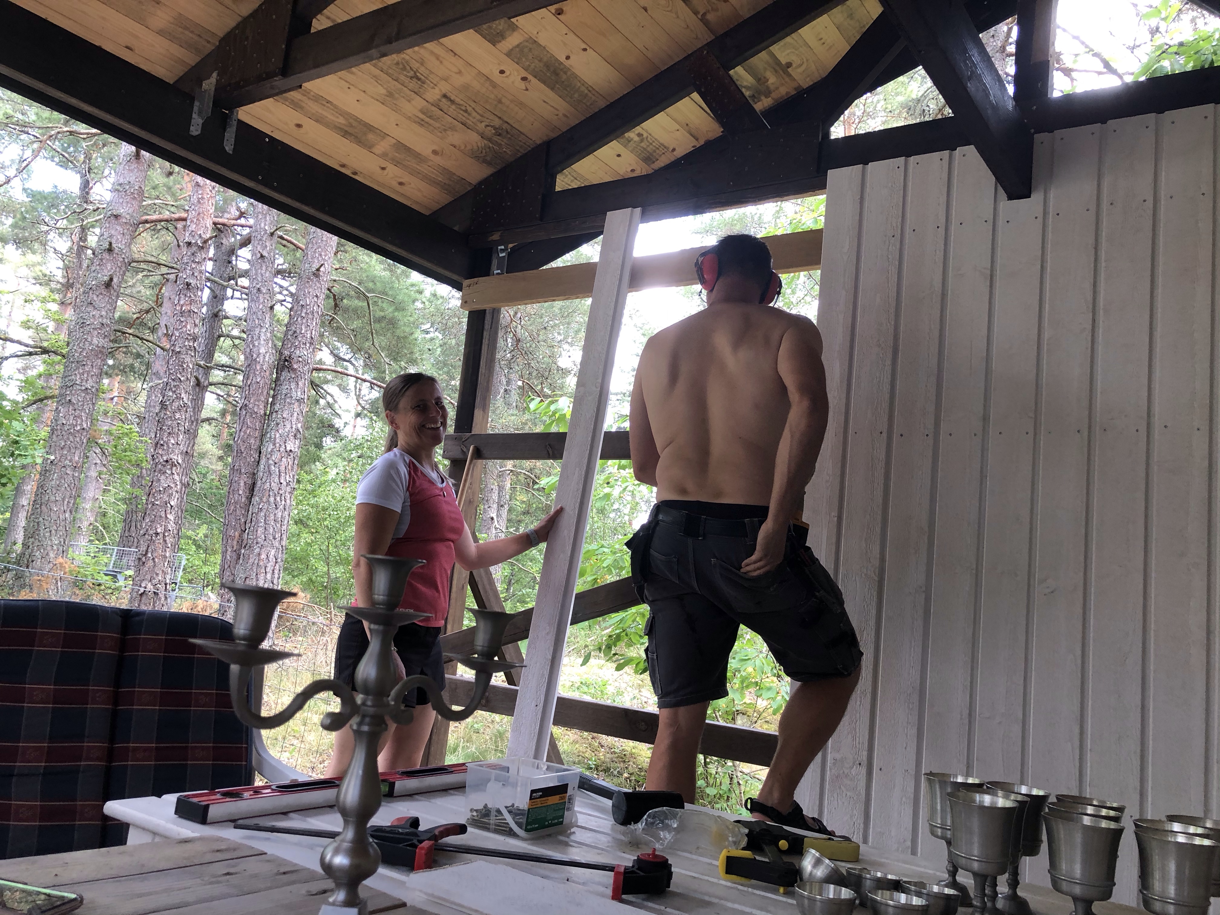 Vi har också byggd klart väggarna på uterummet, terassen, altanen, salongen eller vad vi nu ska kalla det😊 Det blev jättemysigt! Som ett extra rum där man kan vara oavsett om det regnar. Vi har också hängt upp två värmelampor så på kvällen behöver man inte ens frysa😊👍