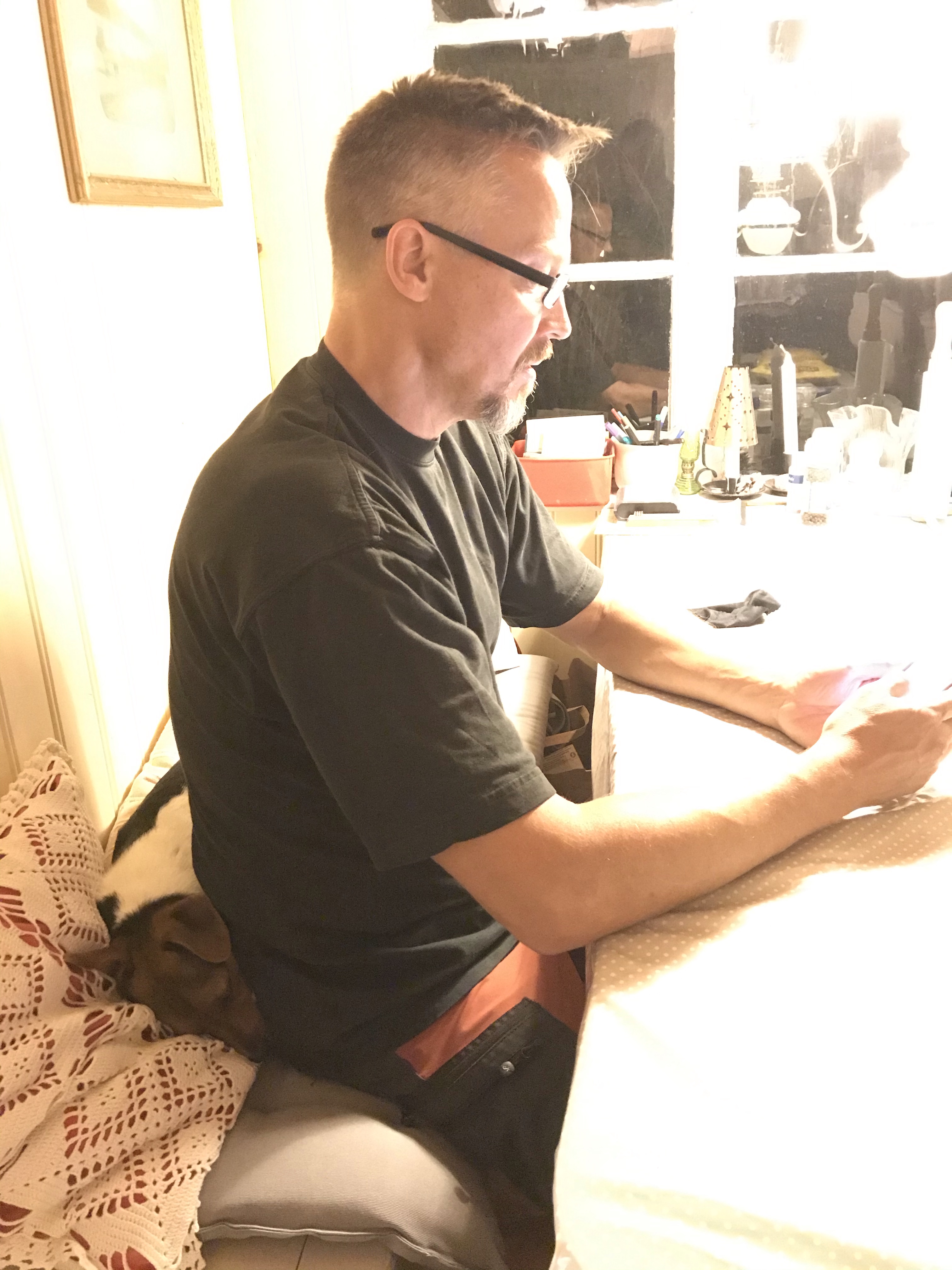 Framme på landet fredagkväll. Hugo hittade en trygg plats bakom husse❤️
