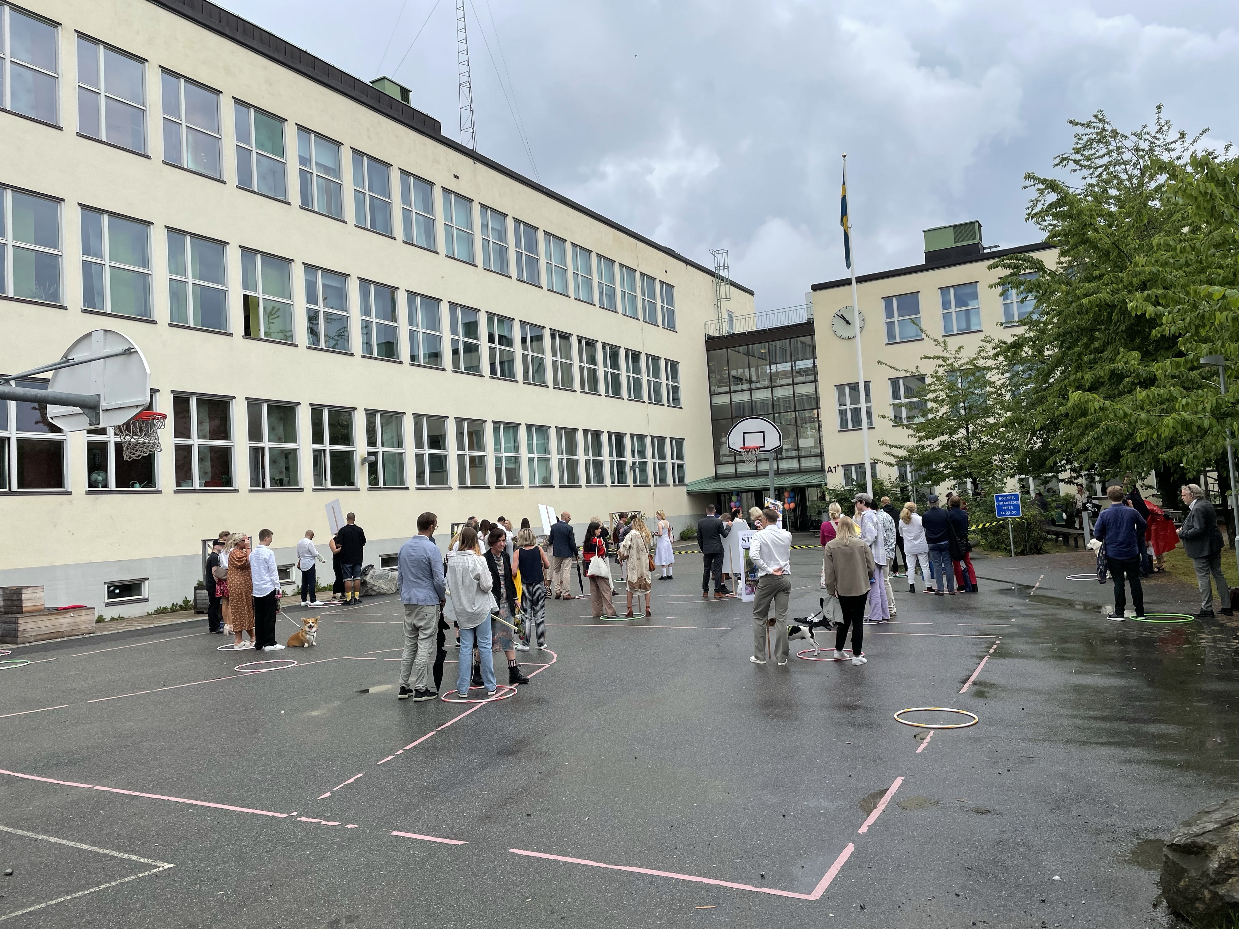 I fick stÄ pÄ skolgÄrden med ena foten i en rockring för att hÄlla avstÄnd.