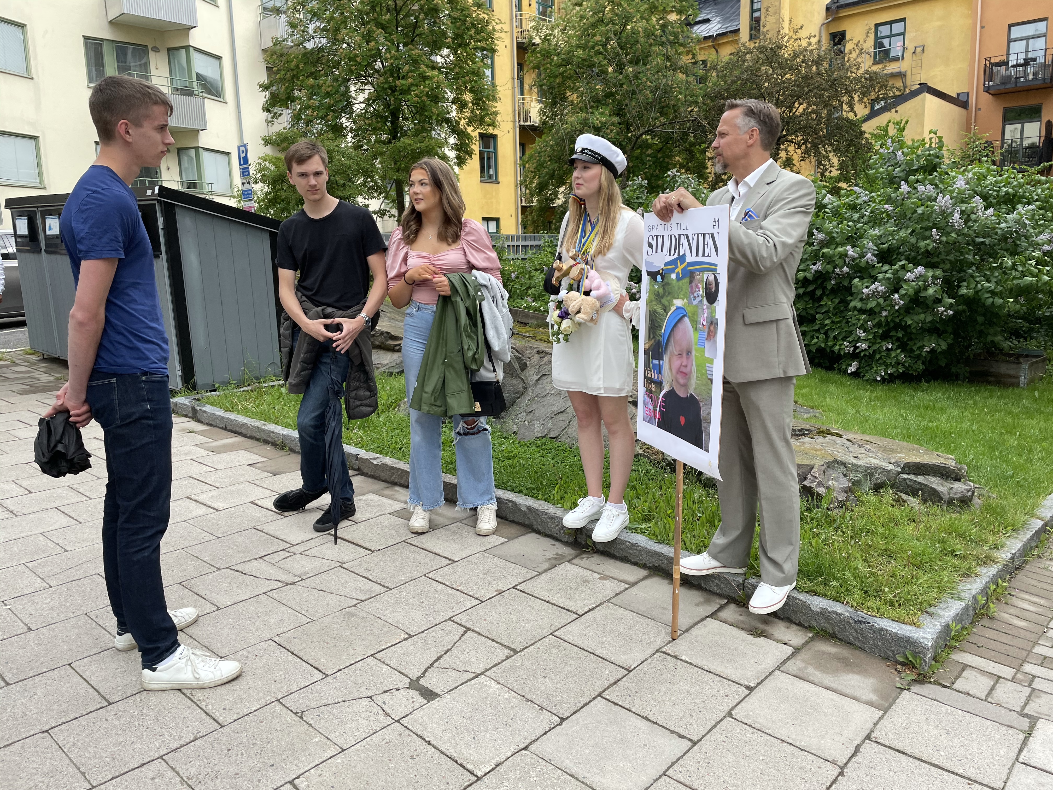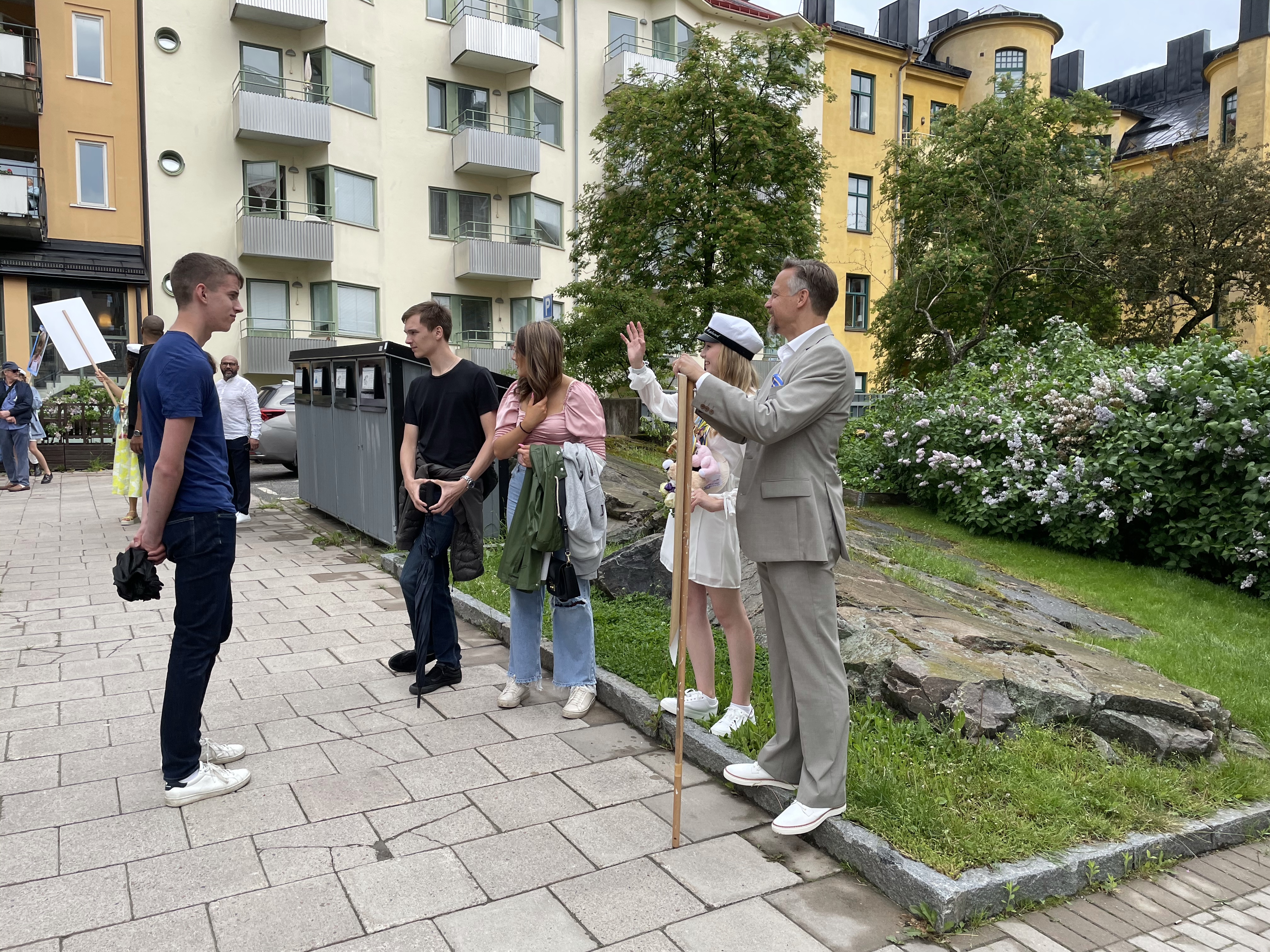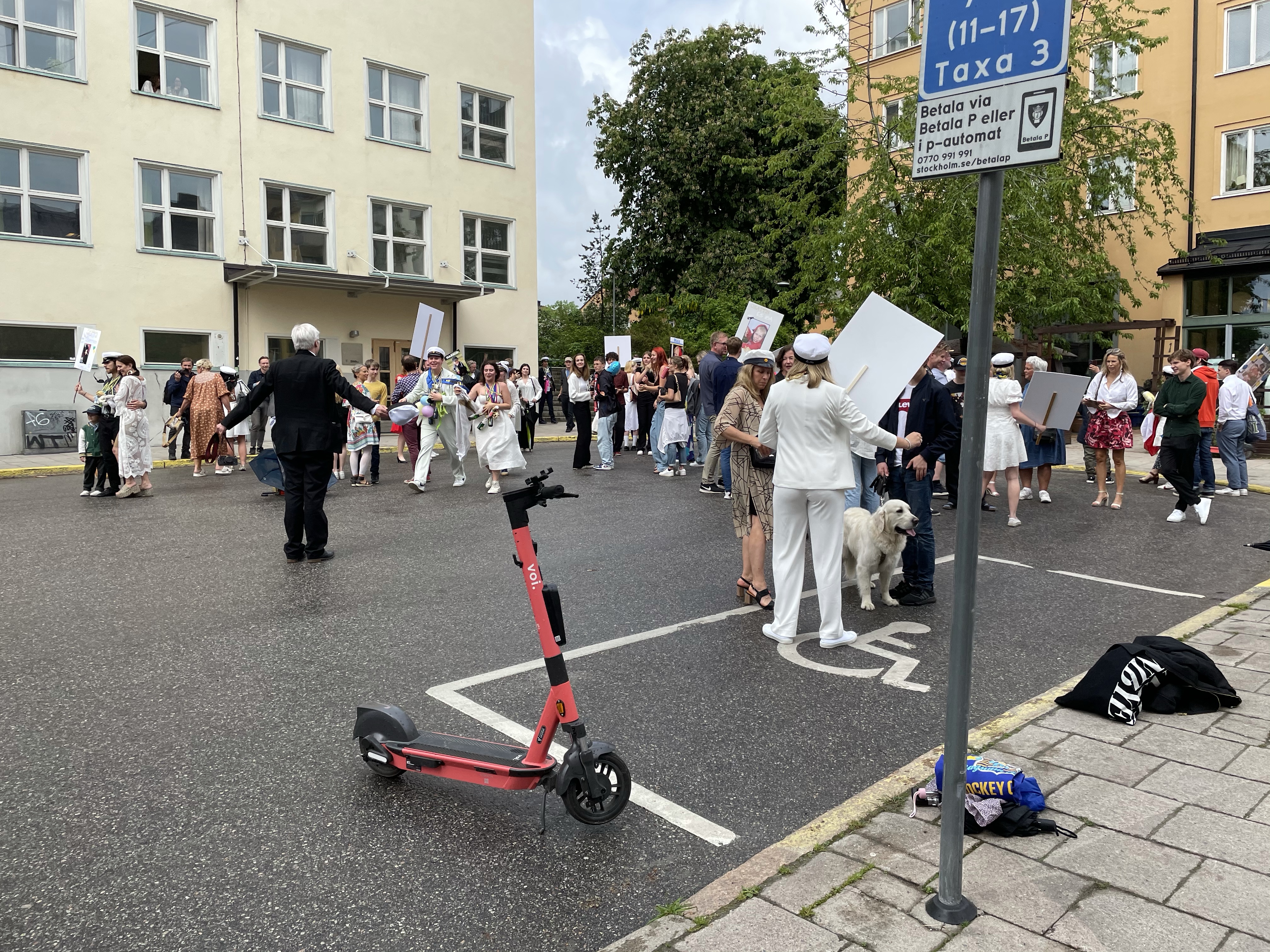 Jag och Hugo höll oss lite i bakgrunden. Han har ju aldrig sett sĂ„ hĂ€r mĂ„nga mĂ€nniskor tidigaređ