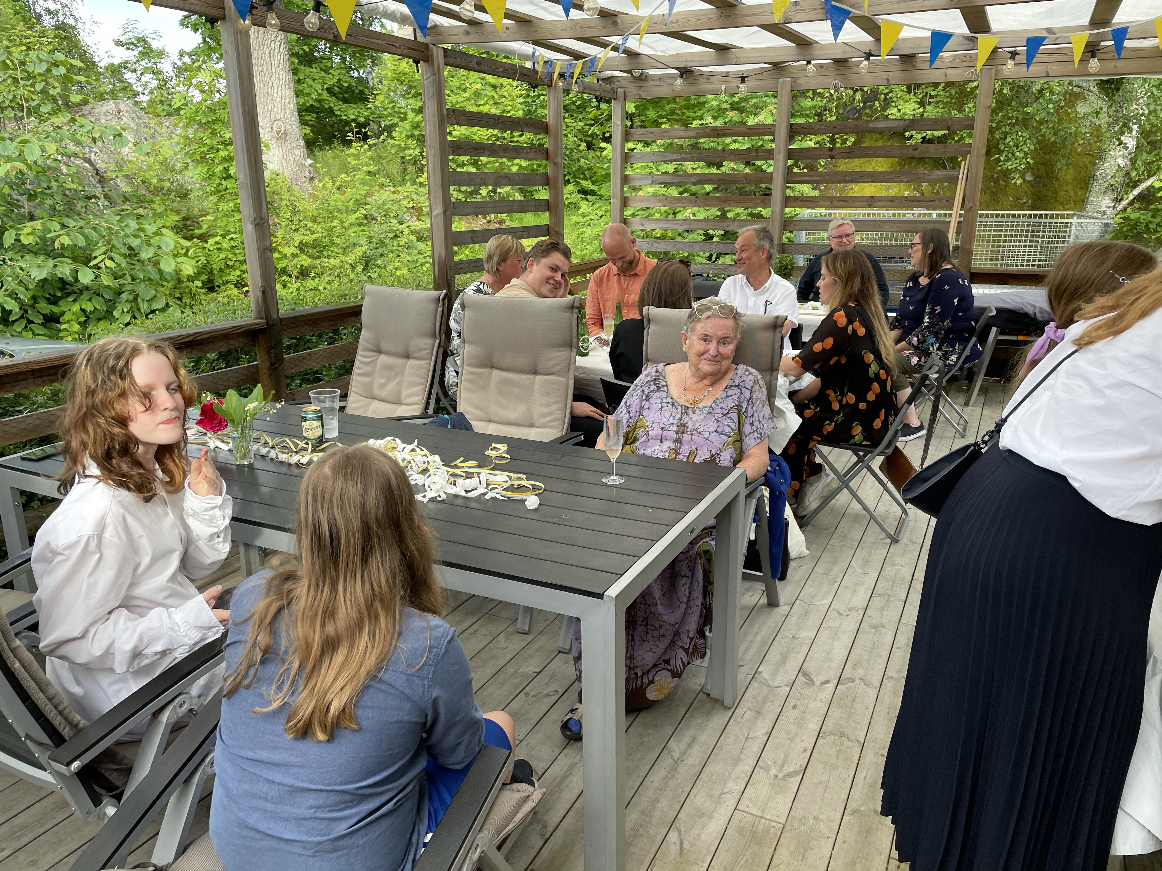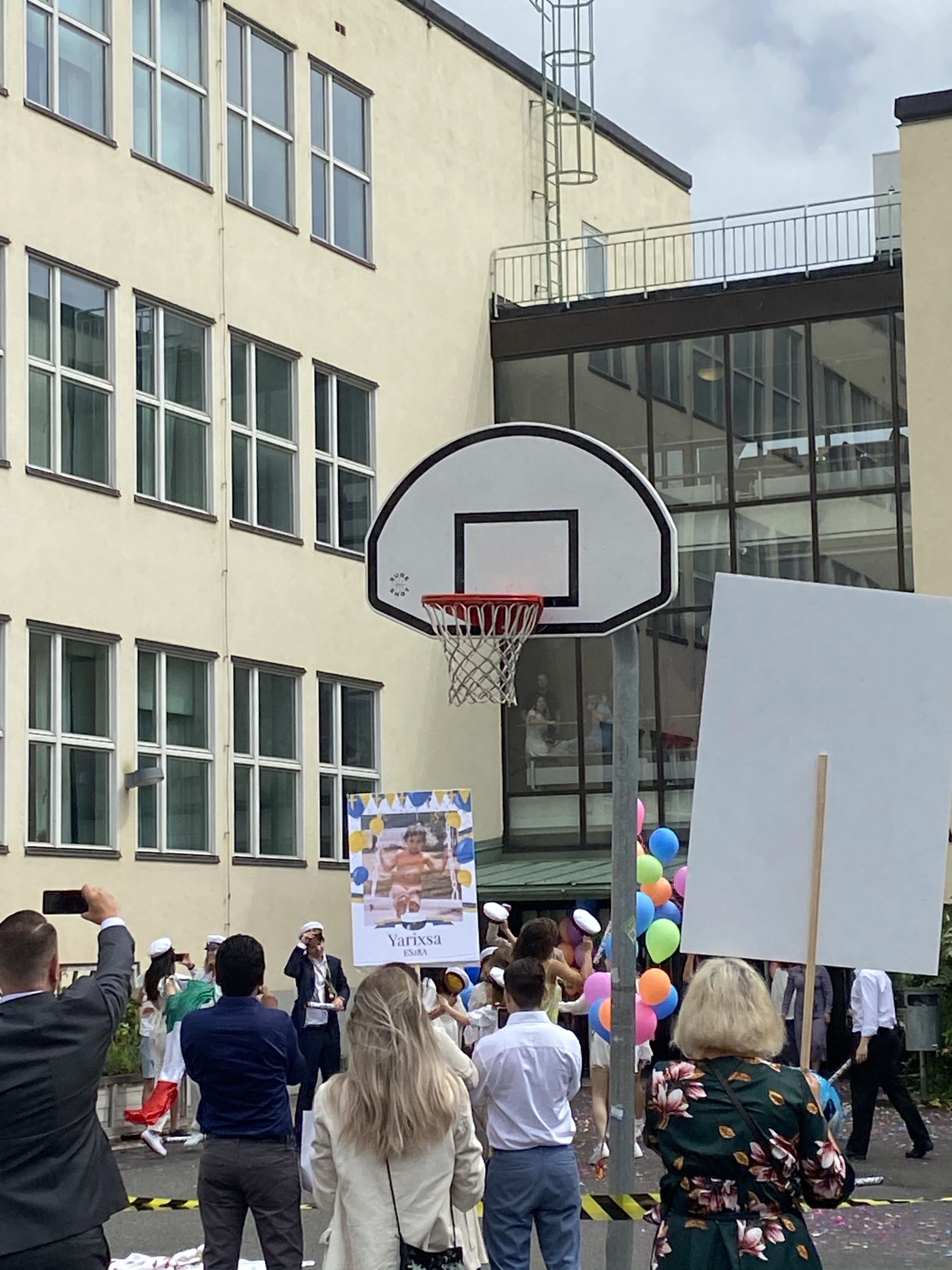 Medan Tove var ivĂ€g pĂ„ frukosten sĂ„ fortsatte vi att rodda med mat och pynt hemma, allt medan regnet fullkomligt vrĂ€kte ner! Precis innan vi skulle Ă„ka gick jag ut och skulle torka av lĂ„neborden sĂ„ att dom inte skulle bli förstörda av det instĂ€nkande regnet nĂ€r jag hörde ett knak över huvudet! NĂ€r jag tittar upp har vattnet samlats i vĂ„rt fiffigt uppsatta presenningstak men plankor upplagda mellan de uppsatta pergolareglarna. Dom reglarna var böjda som bananer under tyngden frĂ„n vattnet och plankorna var böjda i bĂ„gar! Jag rusade in till Magnus och skrek att vi mĂ„ste fĂ„ bort vattnet innan hela taket rasar ihop NU!!! Sen stod Magnus, Lina och jag och kĂ€mpade med att leda eller liksom skjuta över vattnet frĂ„n en fĂ„lla till nĂ€sta tills vi hade fĂ„tt det över kanten! Det vĂ€gde som en halv elefant och risken att taket skulle ge vika hĂ€ngde bokstavligen över ossđ± Till slut hade vi fĂ„tt bort det vĂ€rsta och kunde slĂ€nga oss ivĂ€g! PĂ„ vĂ€gen ringde vi in grannen som takvakt medan vi var borta! Lagom stressade kör vi mot Hornsgatanđ nĂ€r vi kommer fram till Liljeholmsbron gĂ„r bommarna ner precis framför oss och det blir till att vĂ€nta in en broöppning!!đ€Żđ€Ź VĂ€l över hittar vi en plats att parkera pĂ„ lĂ€ngs Hornsgatan och skyndar upp till skolan och kommer fram I TIDđ„”, YES!!đȘ