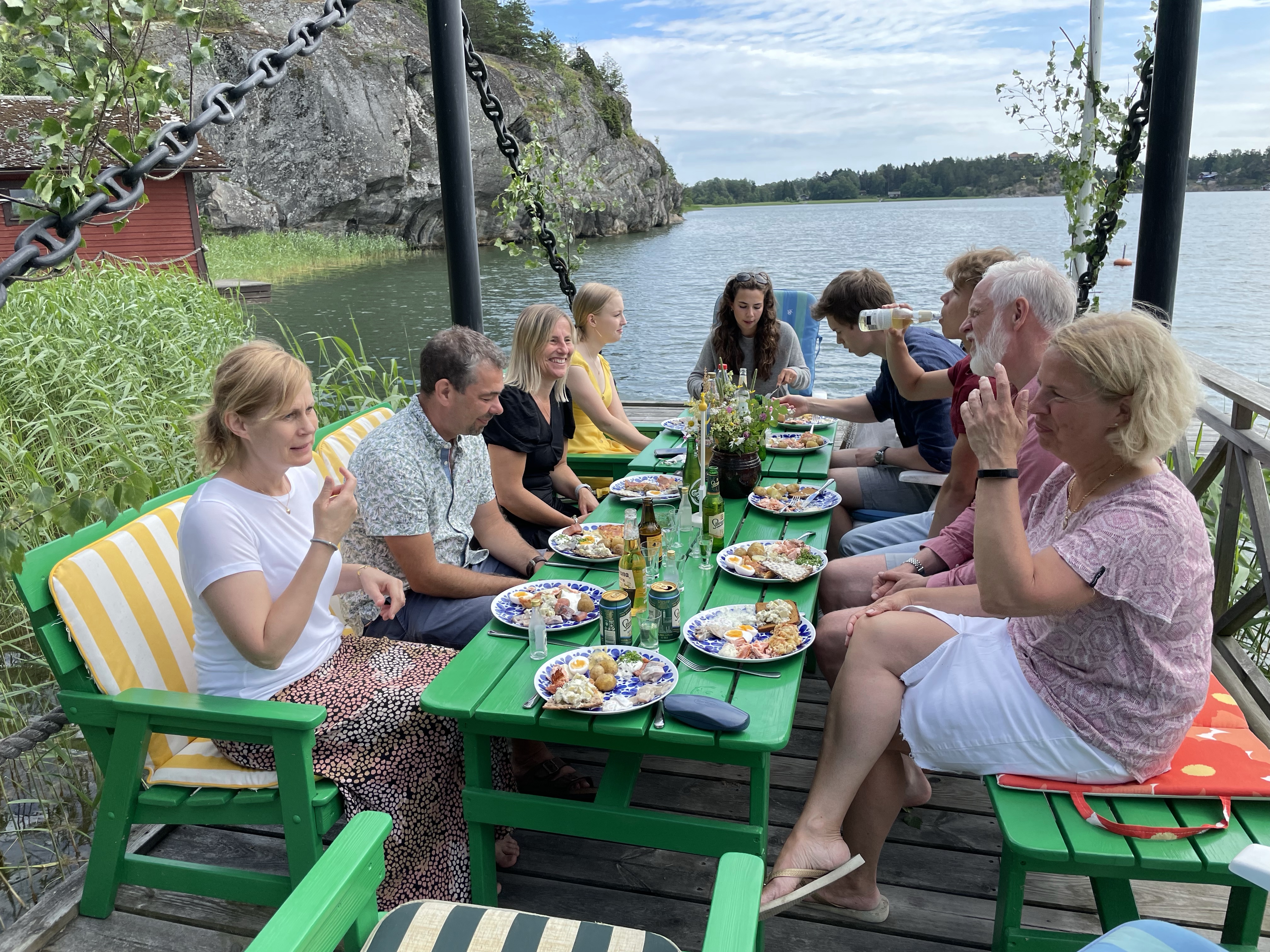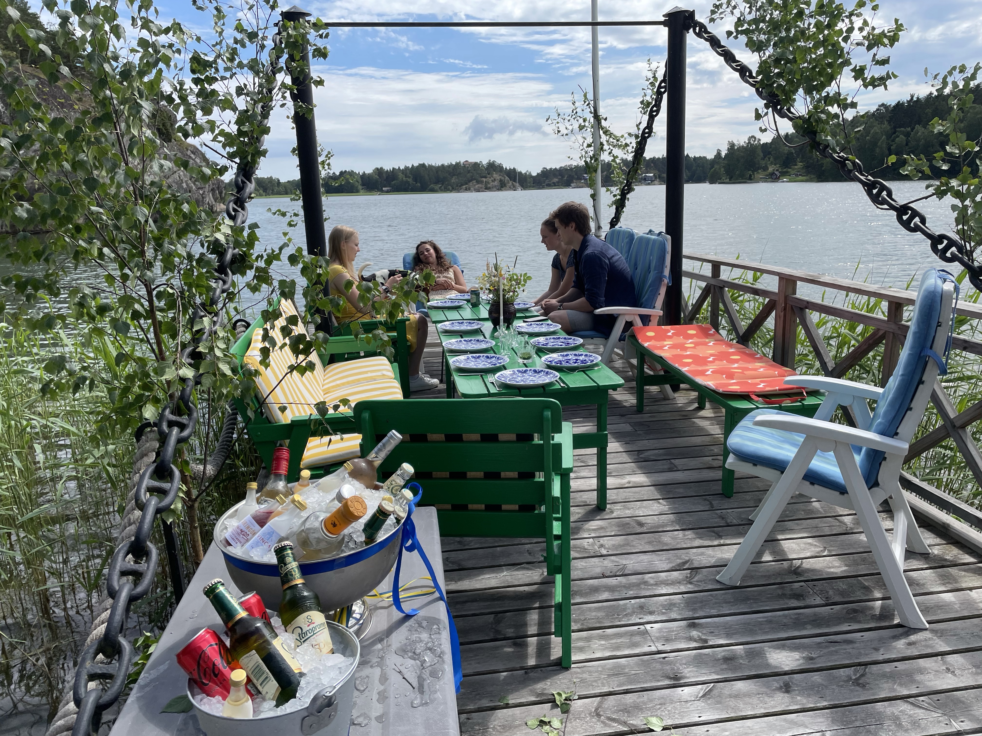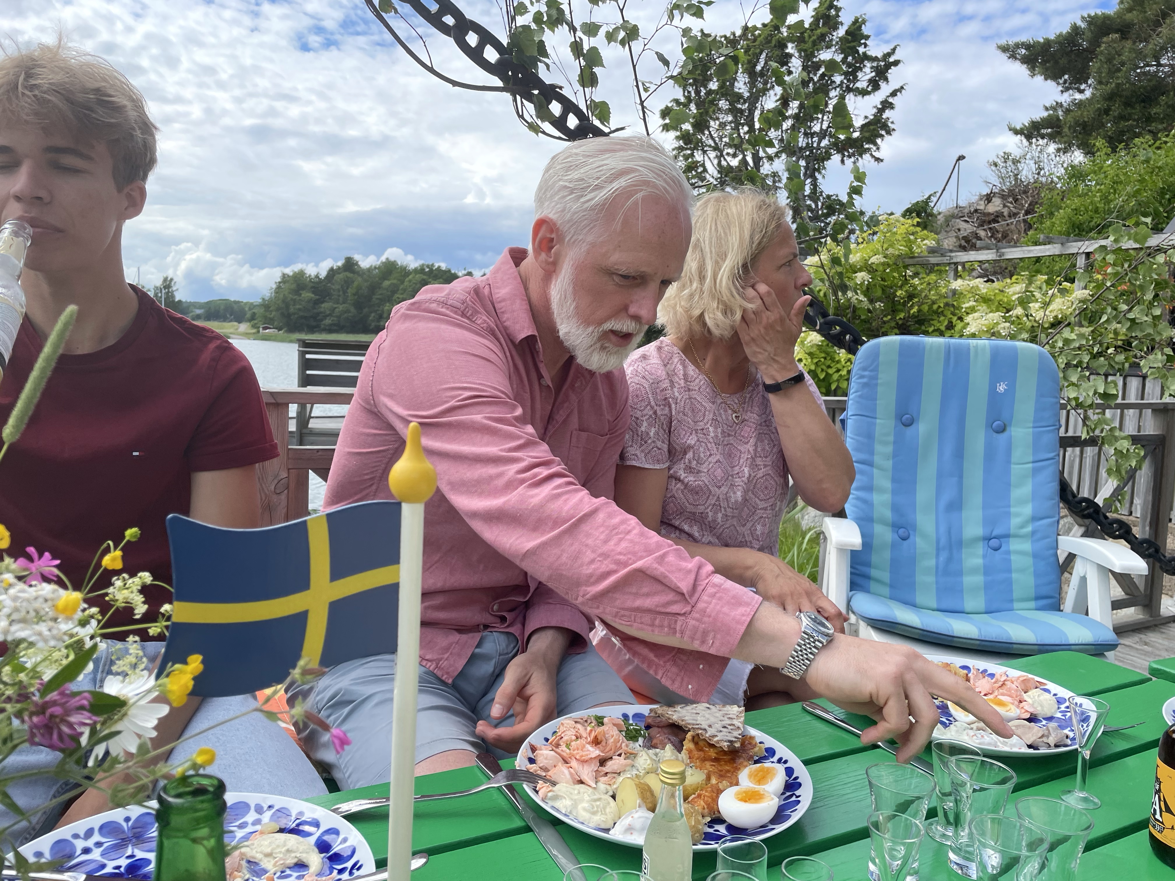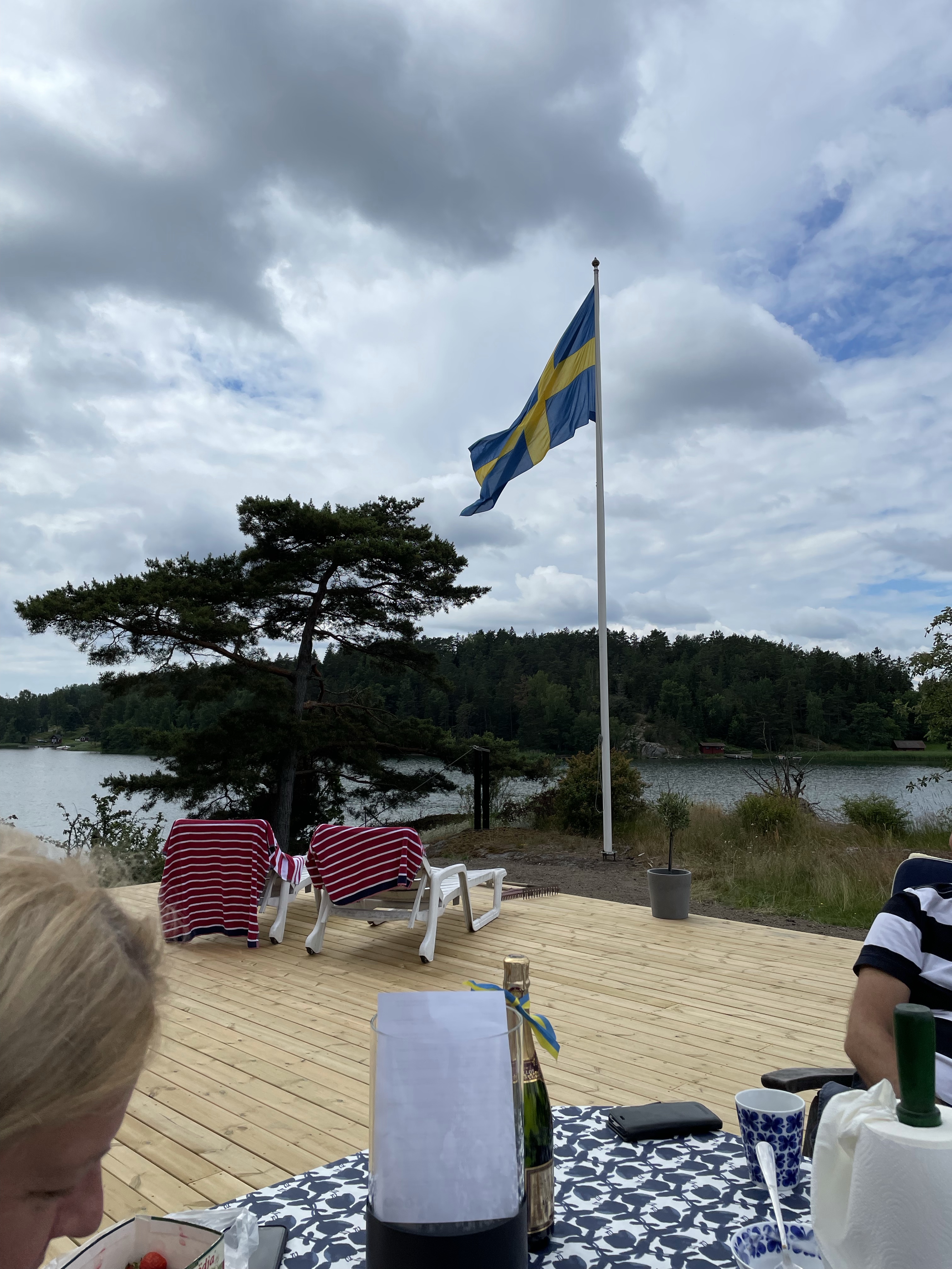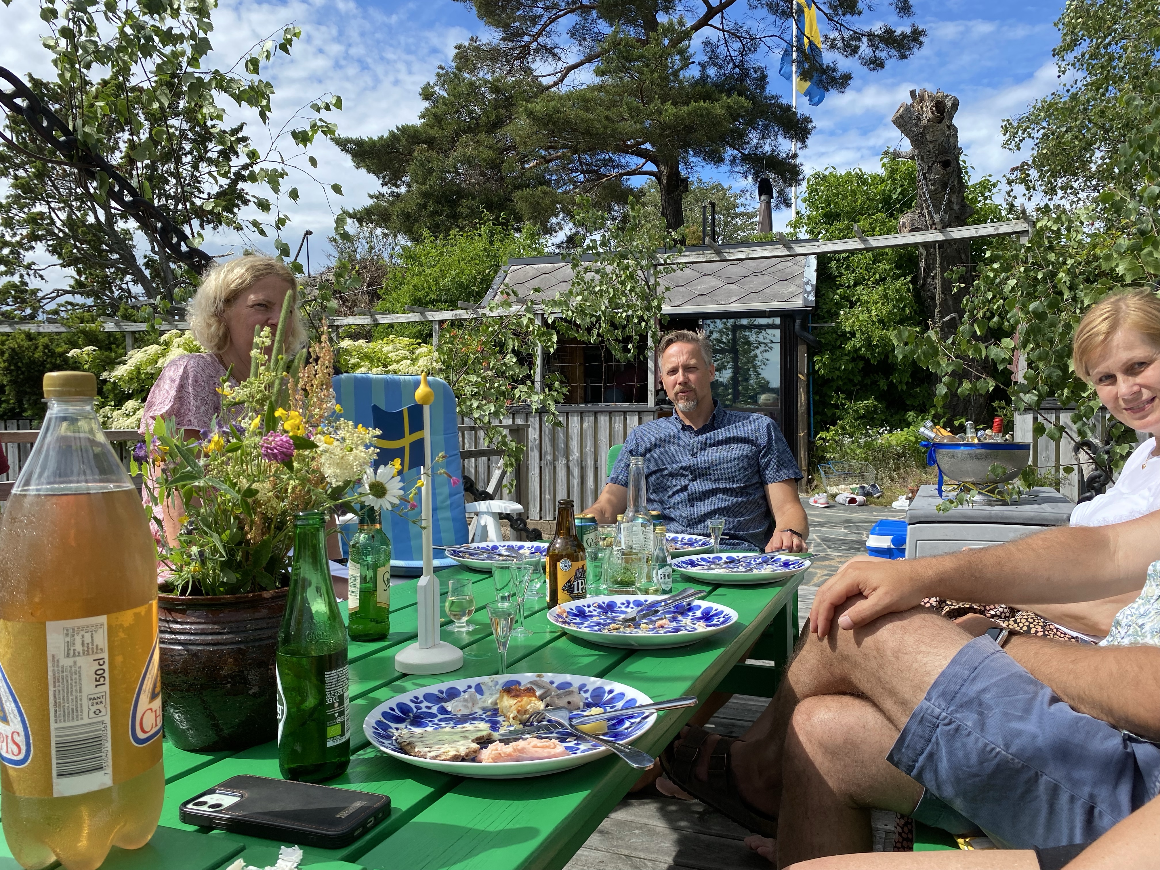 Framåt lunch hade det slutat regna och vi packade vi in oss i bilen och åkte ut till Muskö för att fira midsommar med vänner, och där var det ännu finare väder! Tove hängde med ut i egen bil , dvs MIN bil☝️🤨, just saying…, och åt sillunch med oss innan hon åkte vidare för att fira midsommar med kompisarna. Lina stannade hemma och skulle också fira med kompisar. Nya tider nu😐