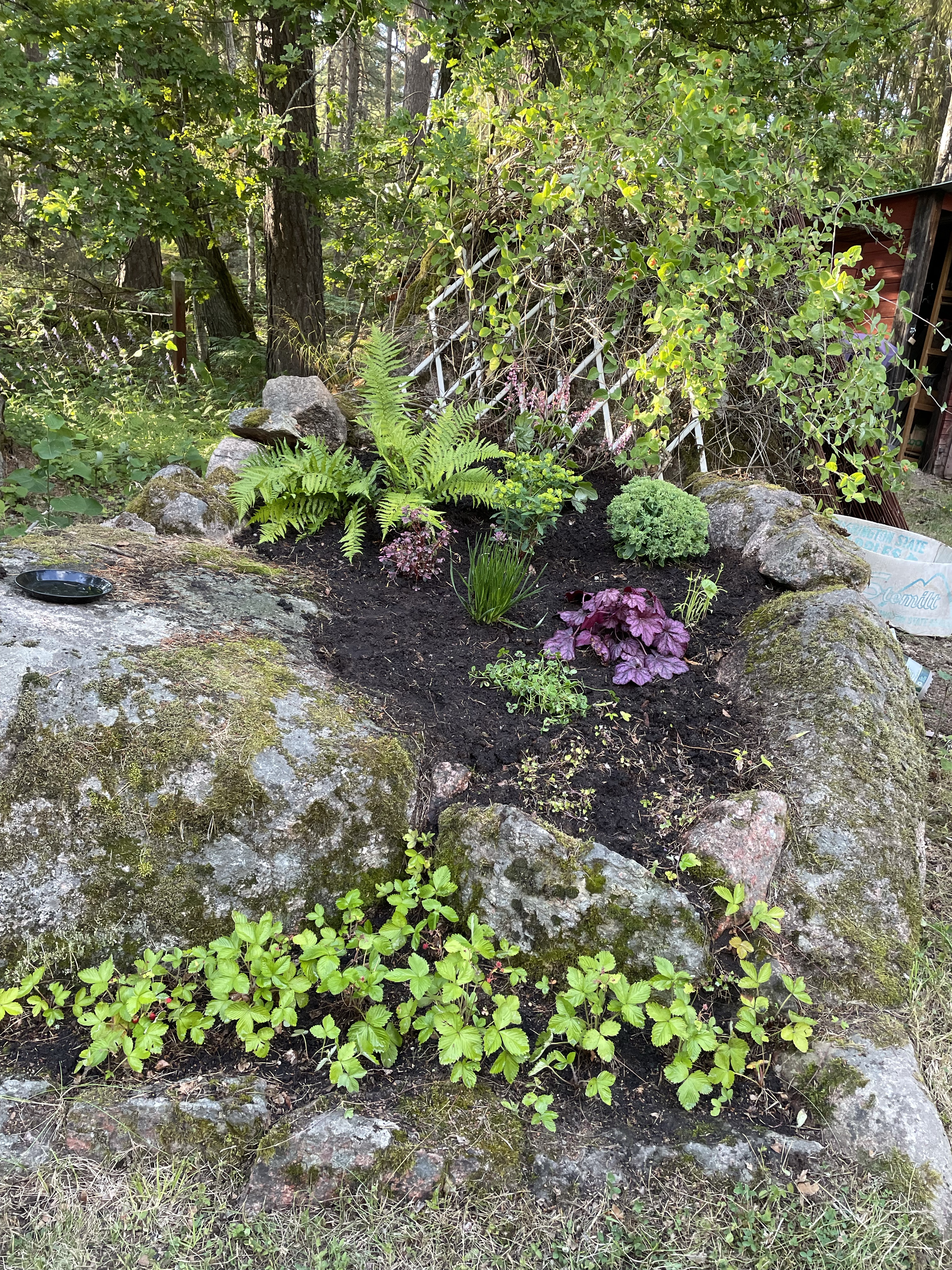 Till och med smultronplantorna fick komma fram ur ogräset. Plus en liiiten växt vi köpte på en gård här nere, den tittar fram lite mellan smultron och de nya blommorna. De såg inte så mycket ut för världen men dom får också vara kvar!