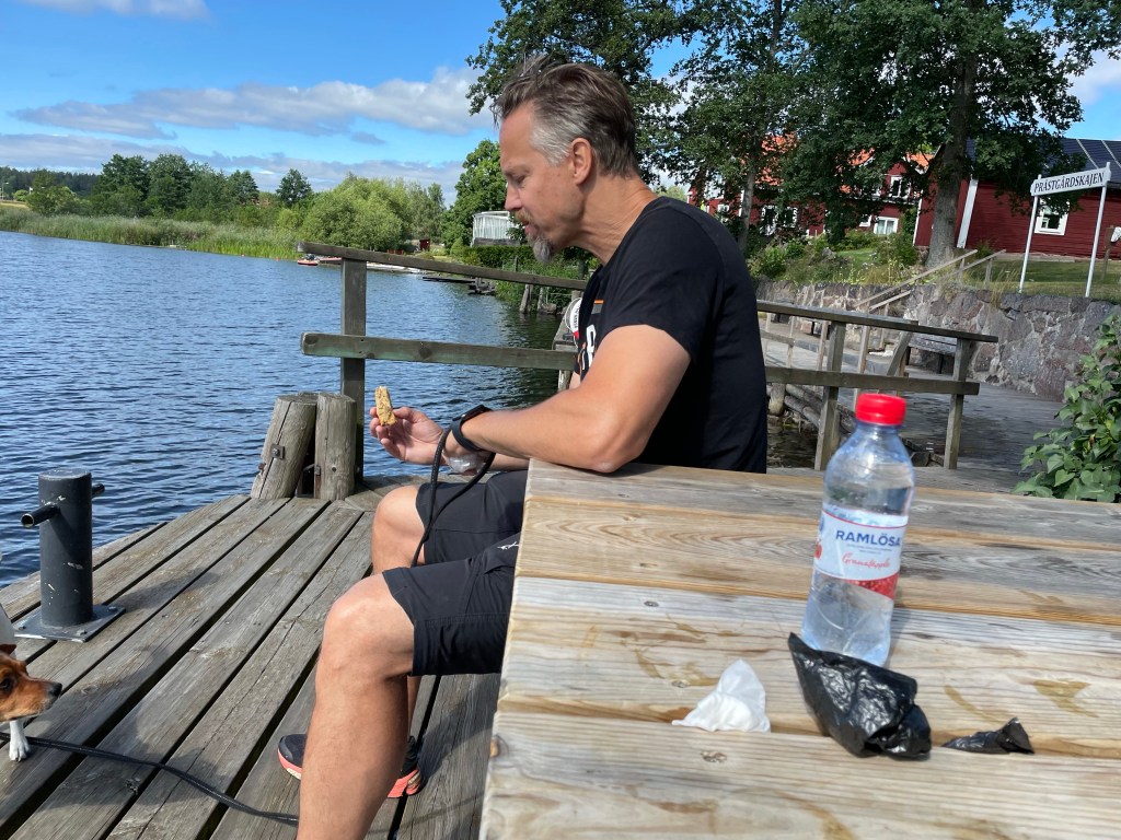Nu har vi alltsÄ hittat PrÀstgÄrdskajen, dit har vi ocksÄ gÄtt pÄ vÄr morgonpromenad nÄgra mornar. Magnus och jag har tagit med oss en macka och lite kaffe, och mat till Hugo, och sÄ sitter vi dÀr vid vattnet och morgonfikar en stund, innan vi gÄr hem och Àter frukost med tjejerna, jÀttemysigt!