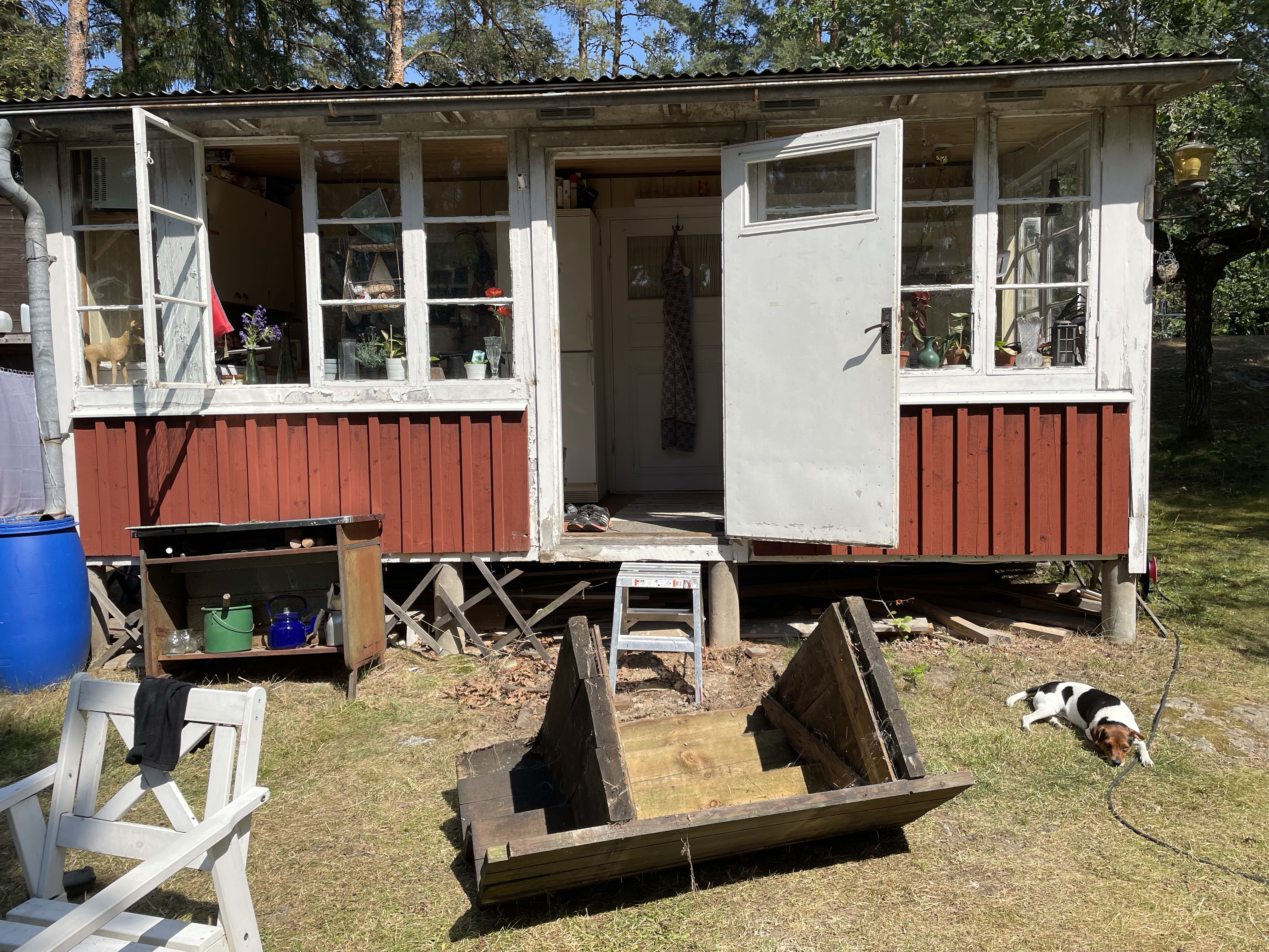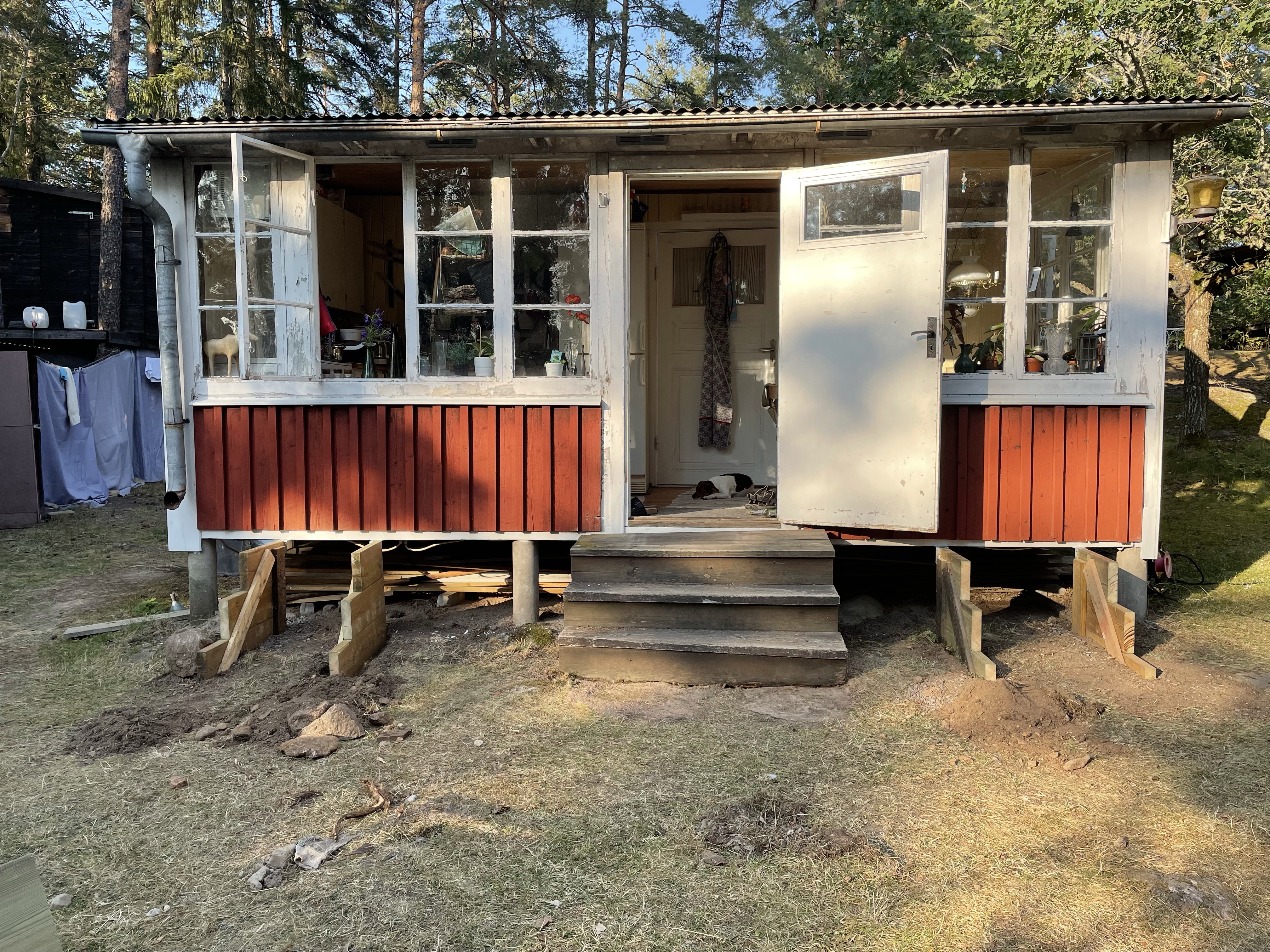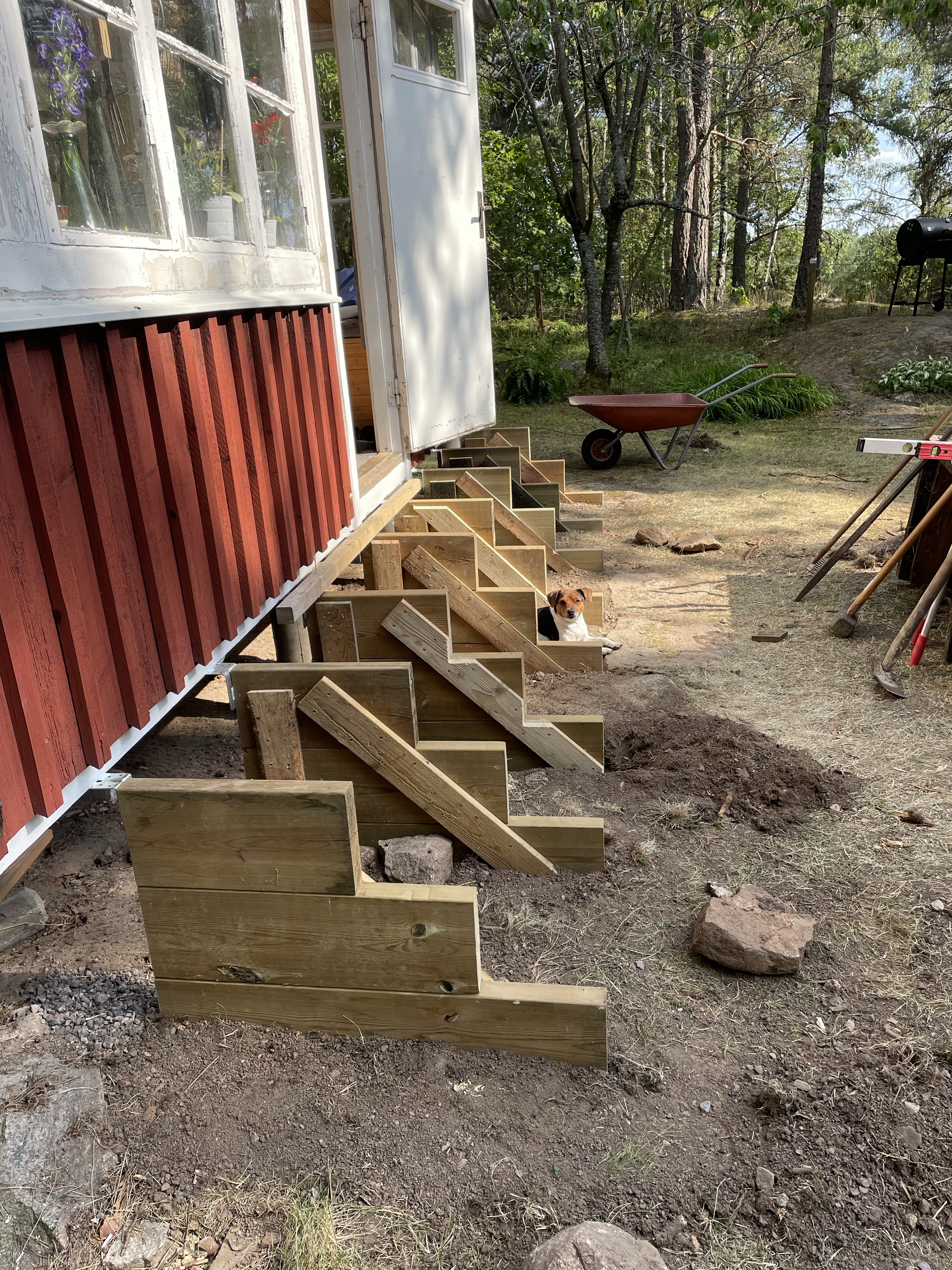 Den gamla trappan fick faktiskt komma tillbaka ett tag för det var för krångligt för Hugo att ta sig in och ut😊.