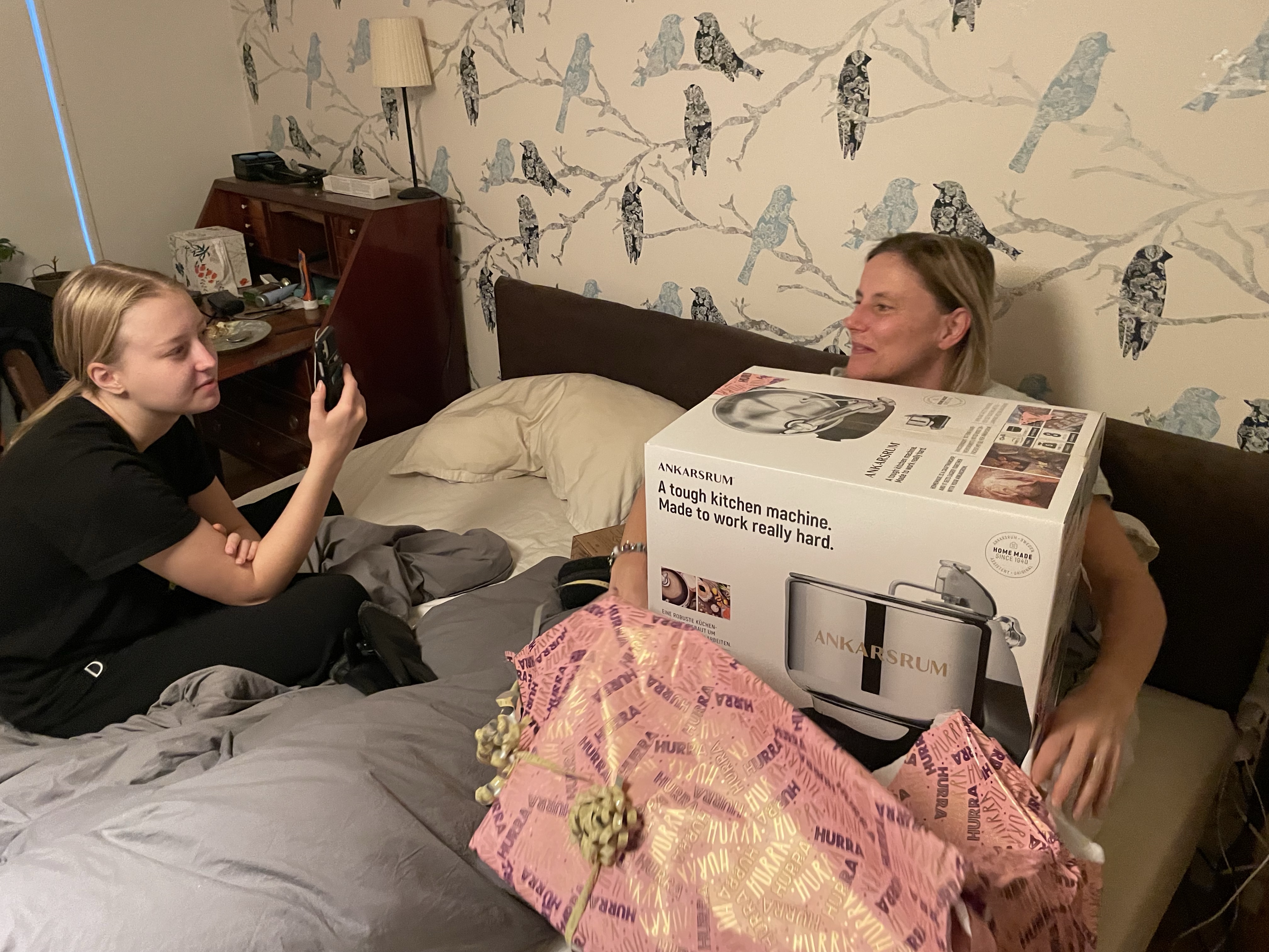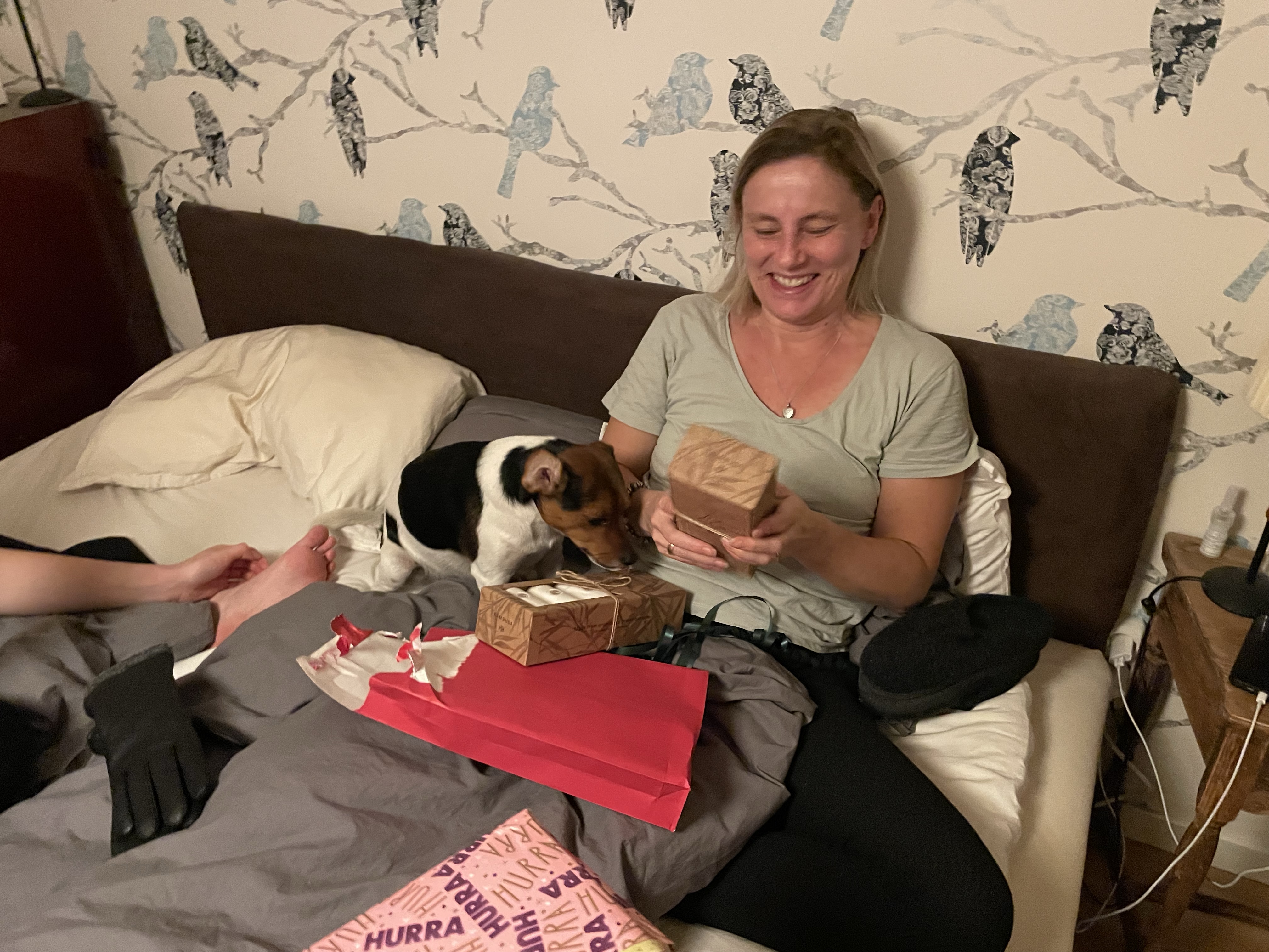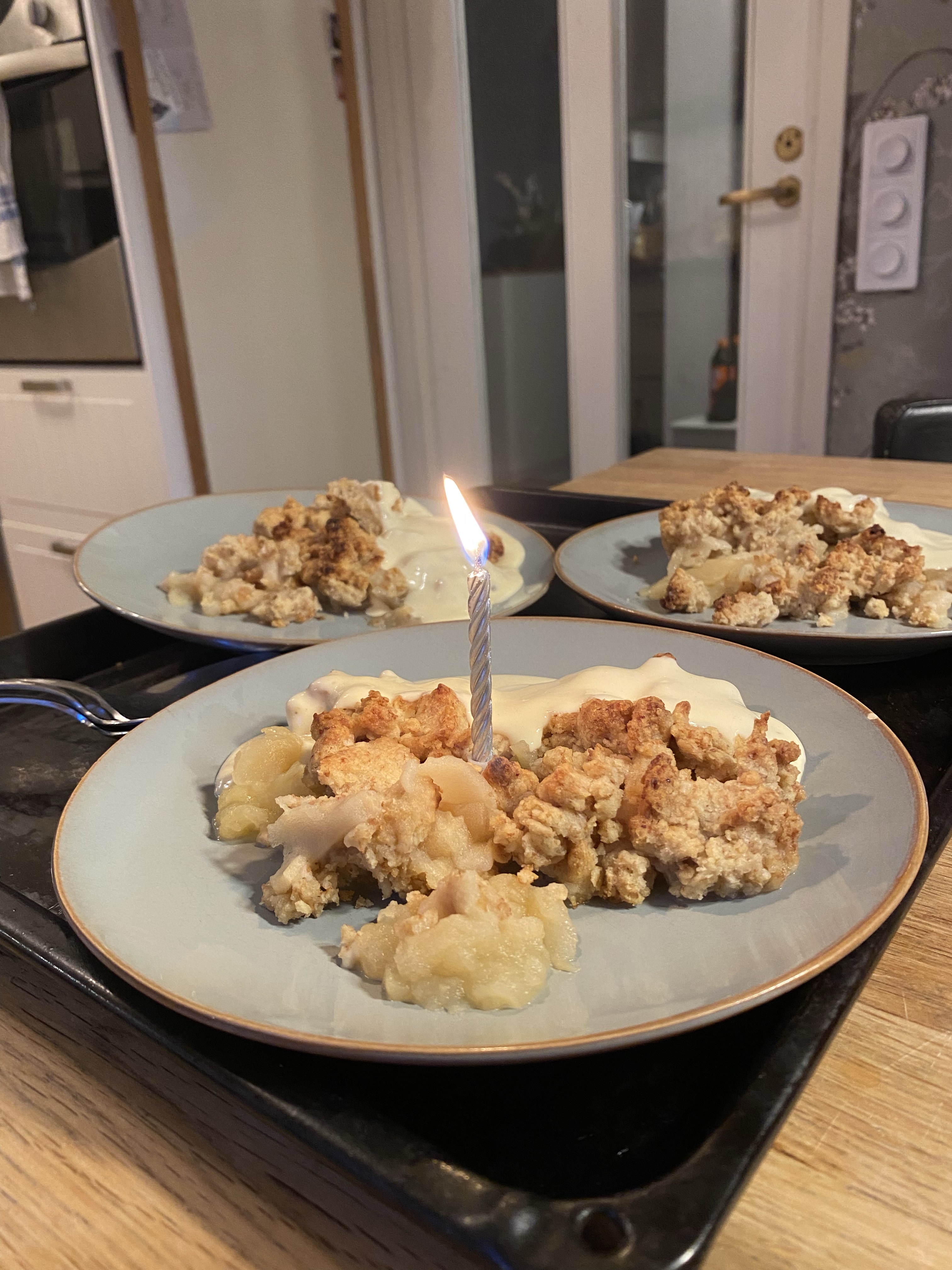 På morgonen 07.30 blev jag firad med Toves hemgjorda äppelpaj med vaniljsås som hon tydligen hade gjort mellan när jag hade gått och lagt mig och när gästerna kom😮 Ingen sovmorgon där alltså för Lina skulle ju vara med på FaceTime från Spanien innan hon skulle gå till skolan😊