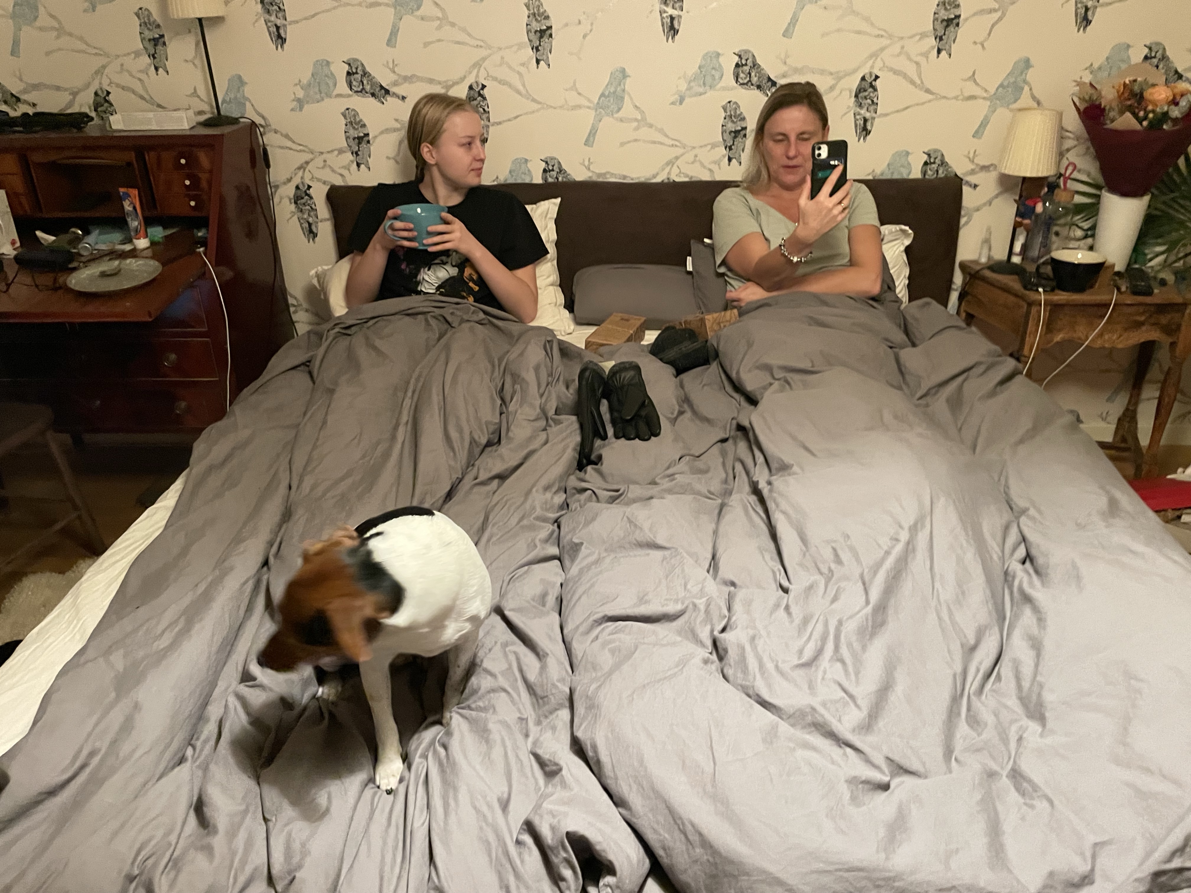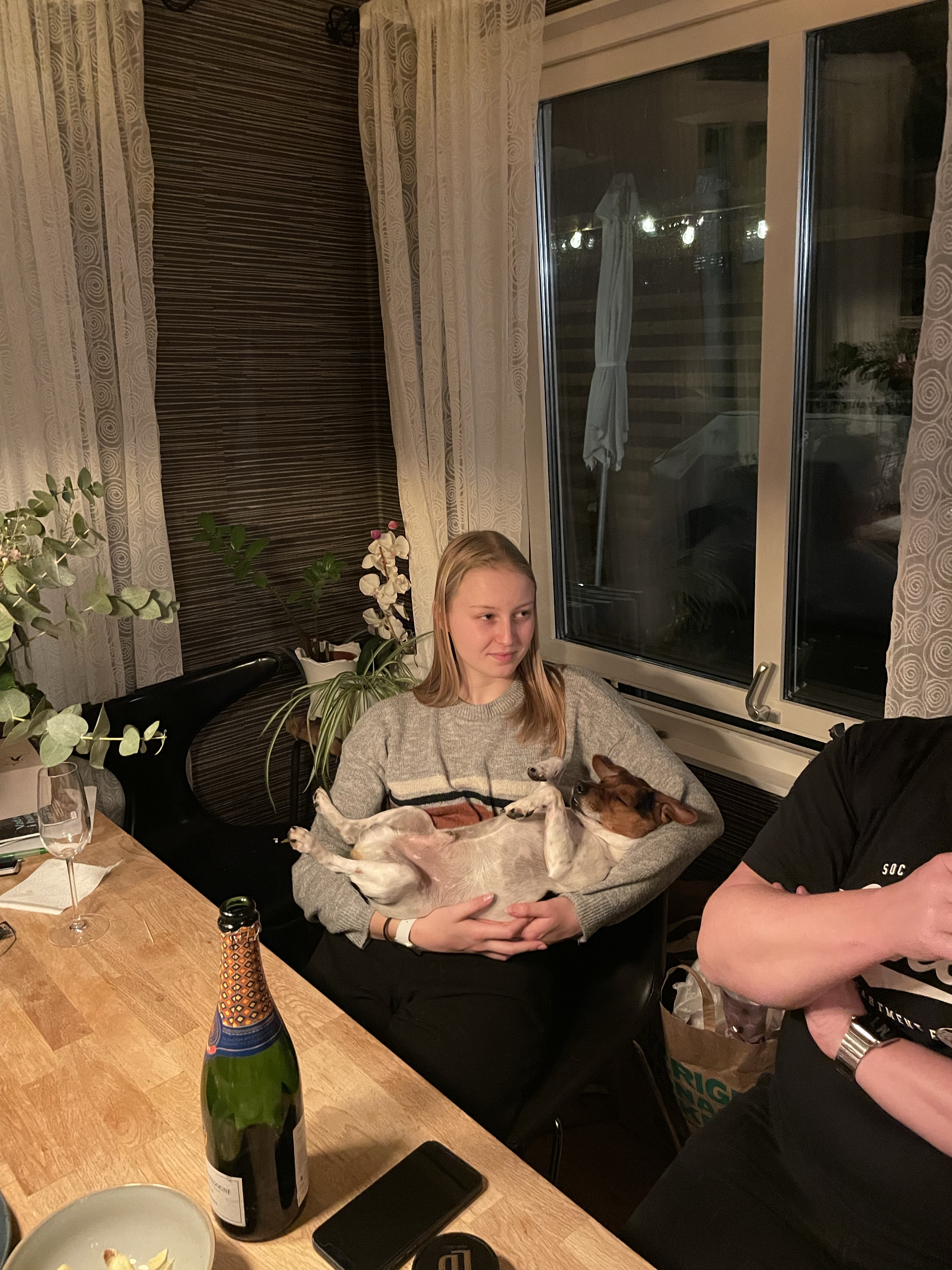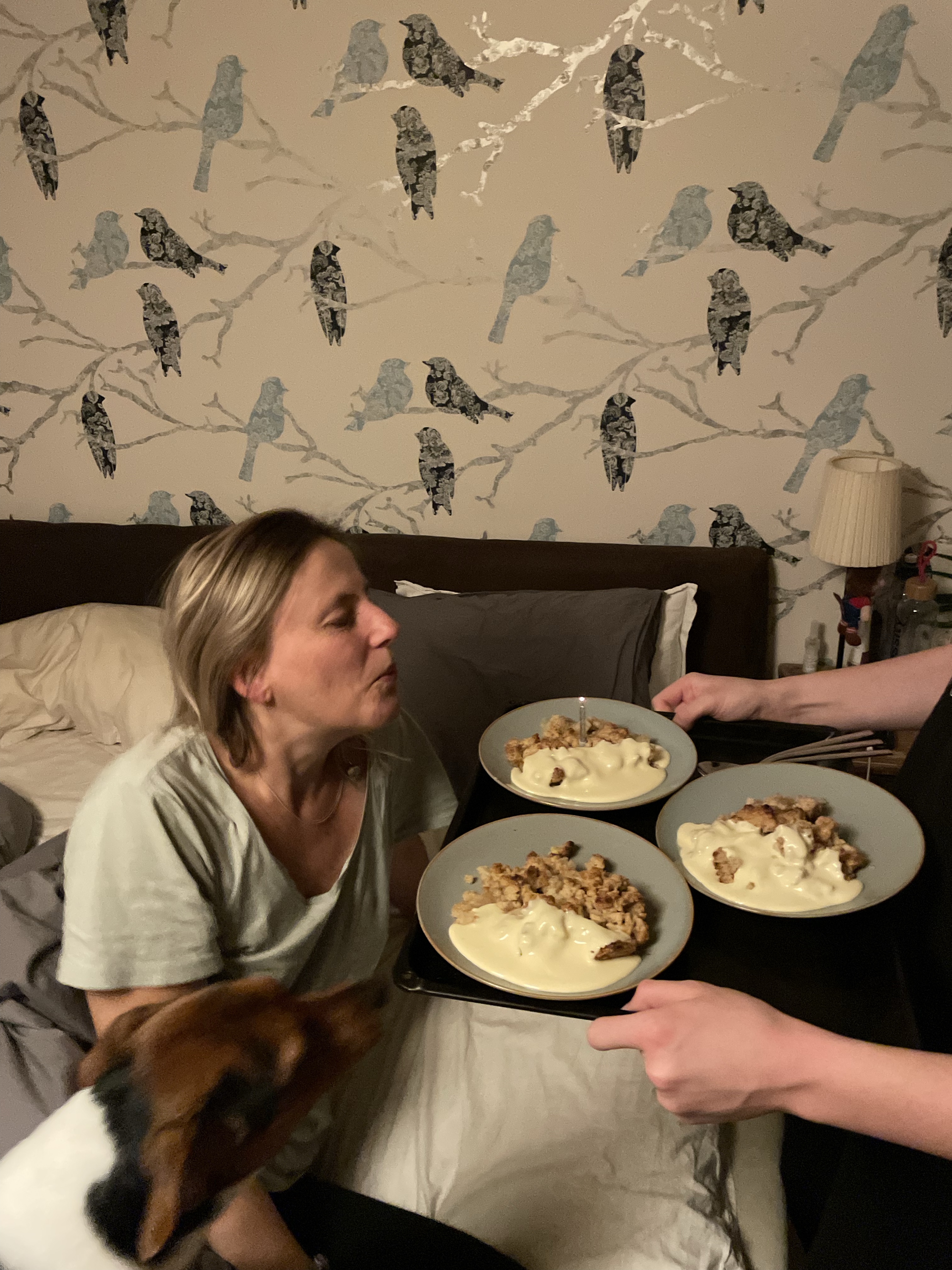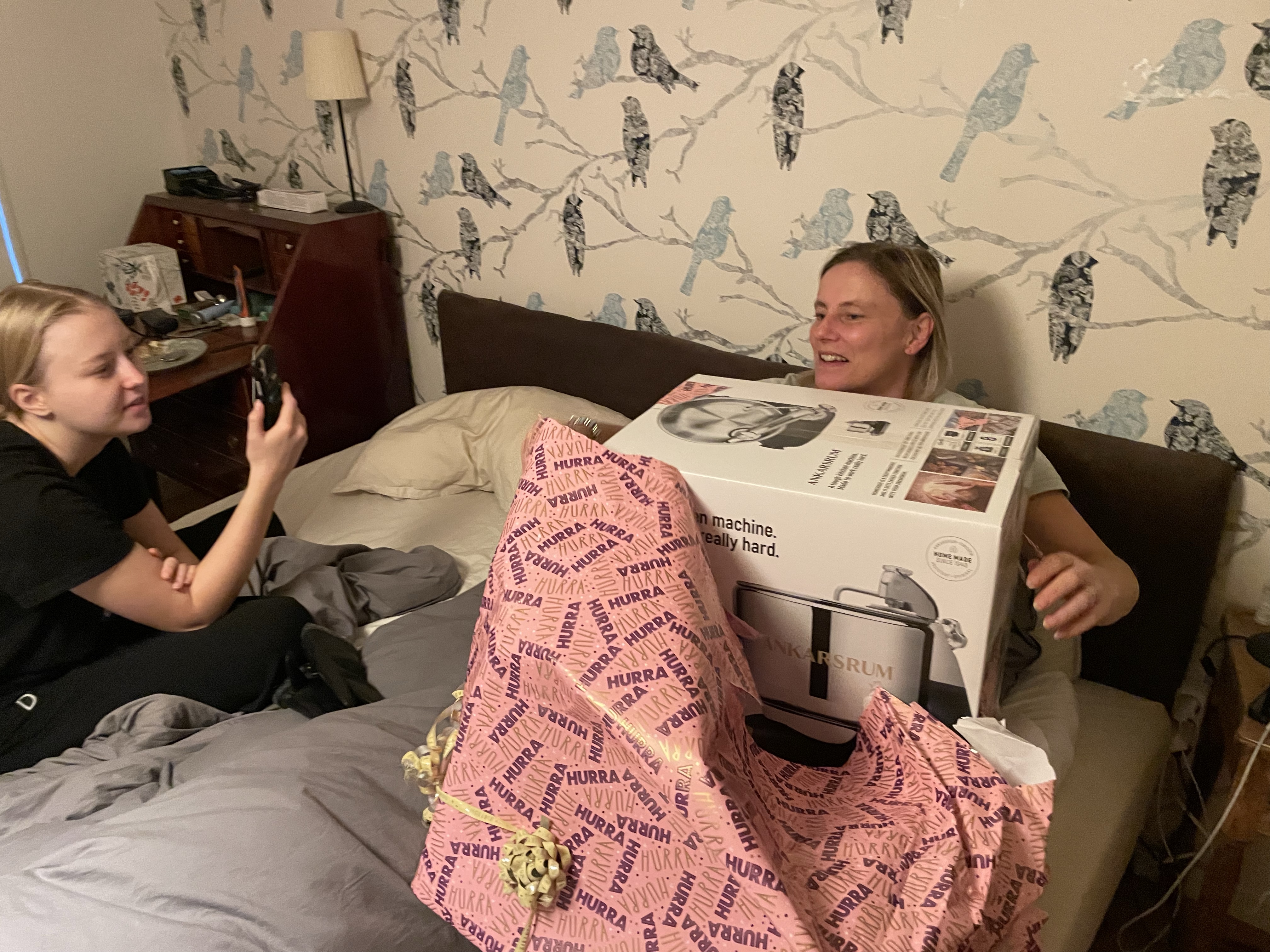 På morgonen 07.30 blev jag firad med Toves hemgjorda äppelpaj med vaniljsås som hon tydligen hade gjort mellan när jag hade gått och lagt mig och när gästerna kom😮 Ingen sovmorgon där alltså för Lina skulle ju vara med på FaceTime från Spanien innan hon skulle gå till skolan😊