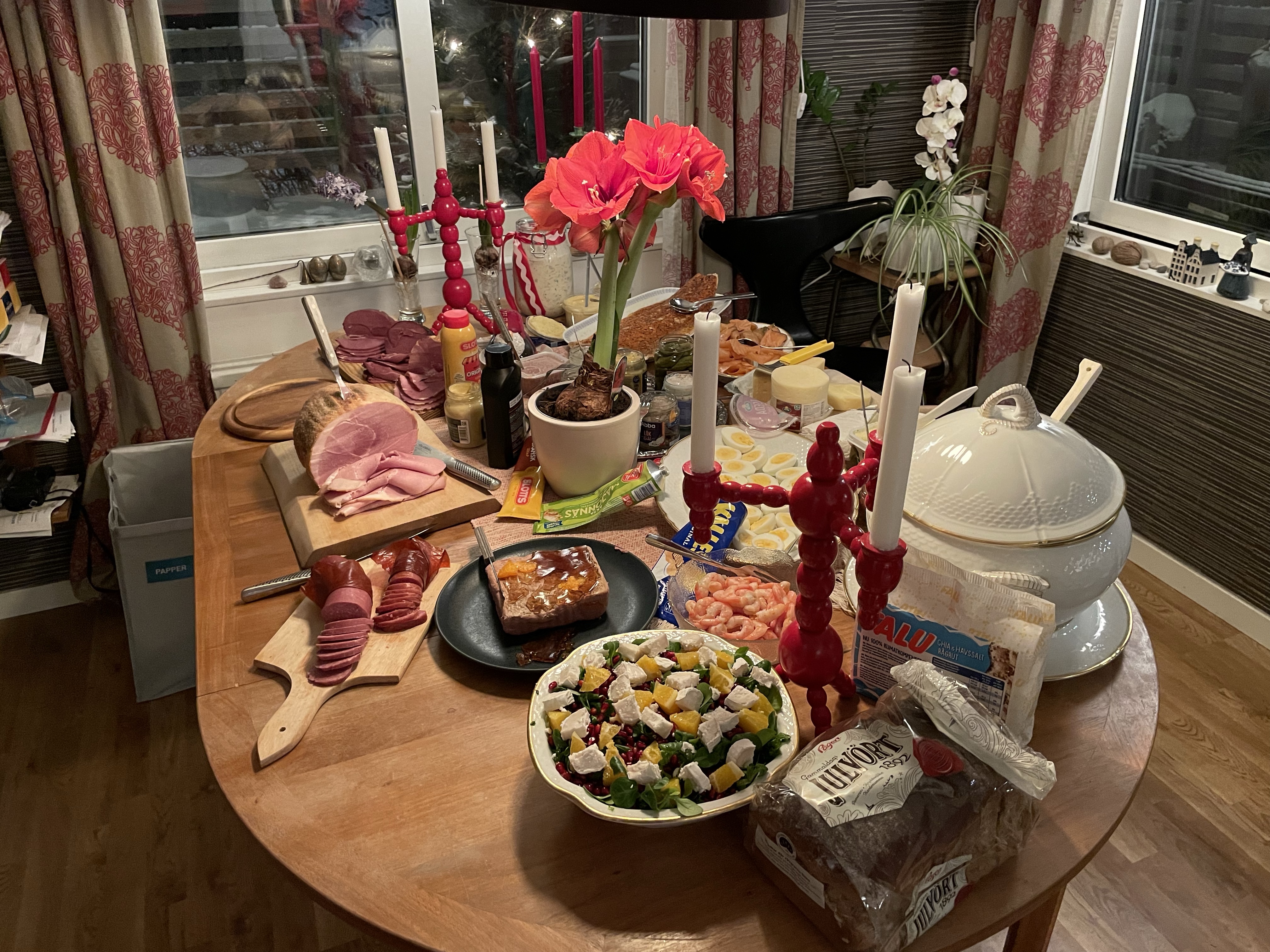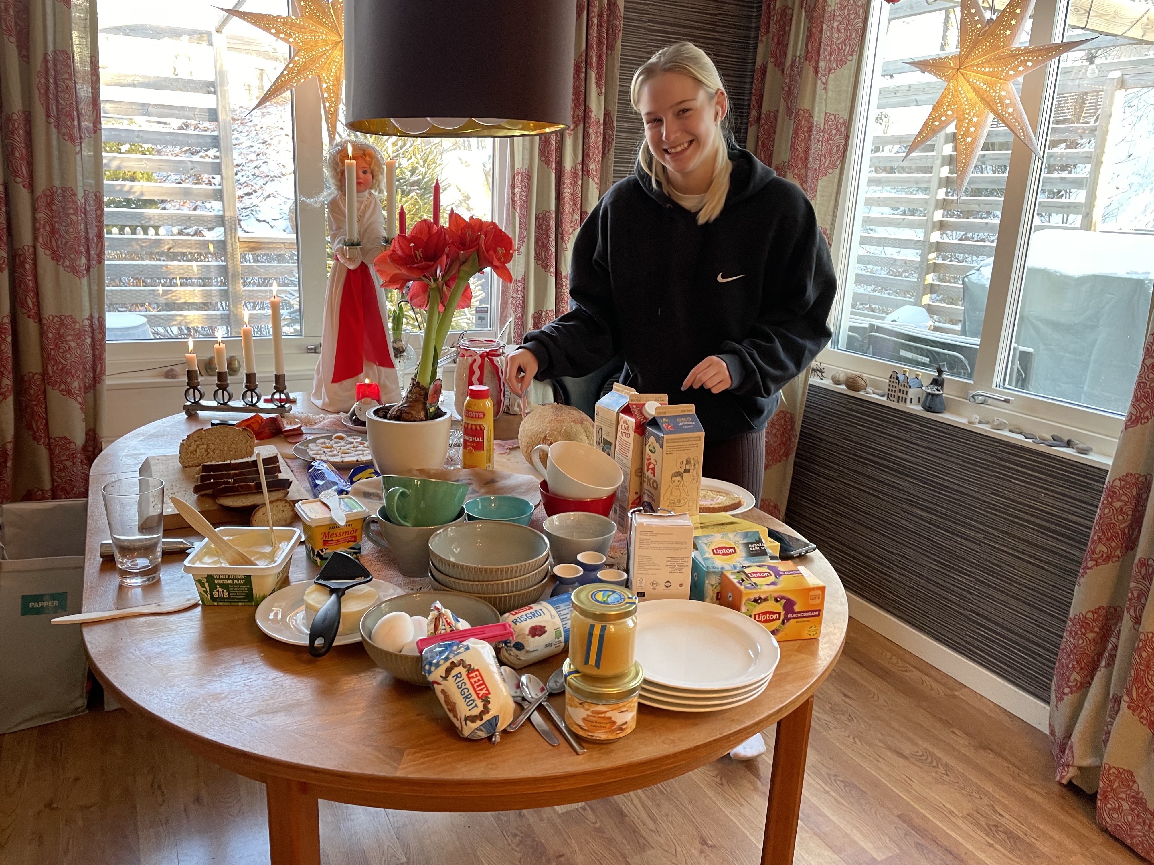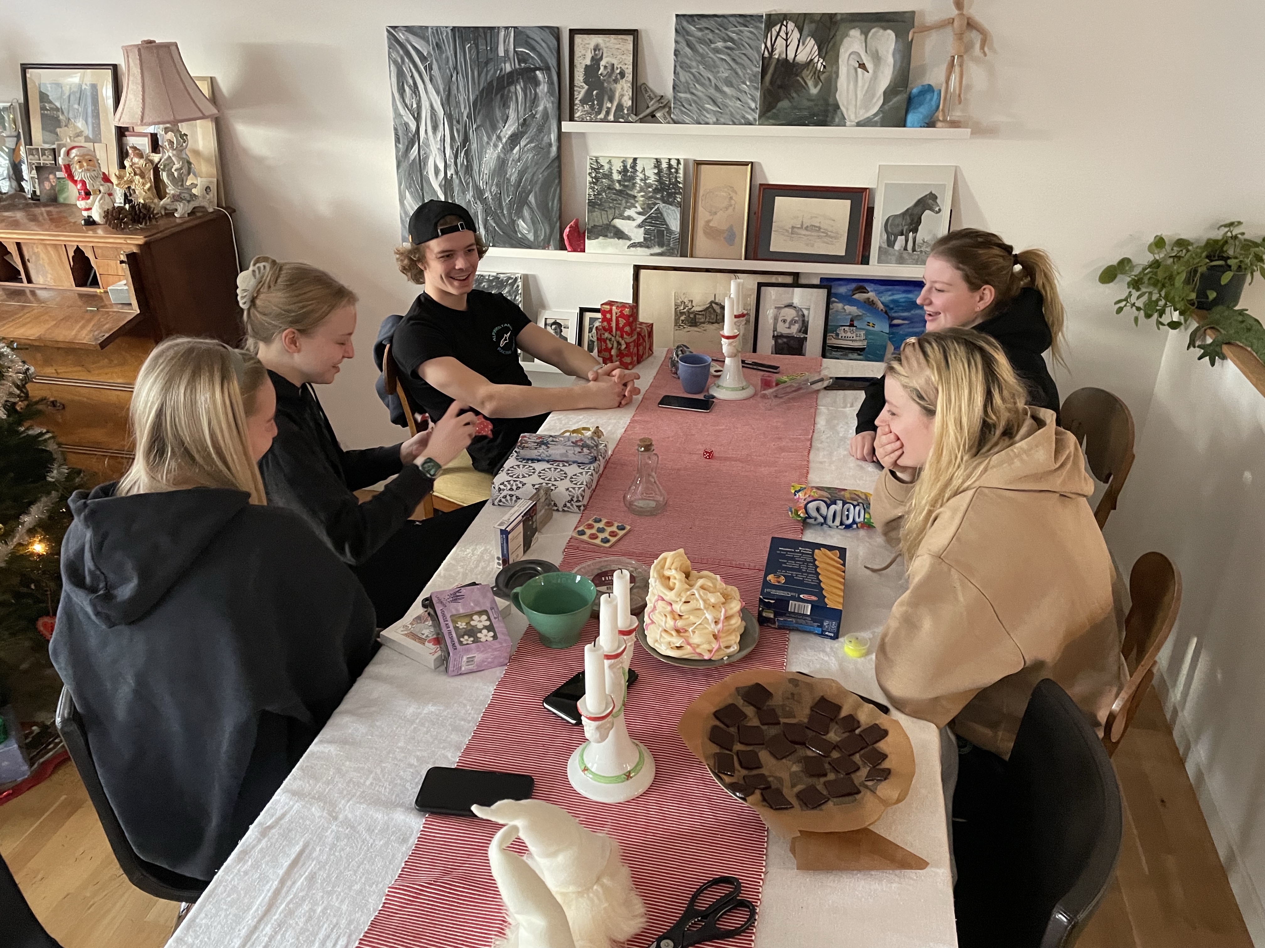 Men det gick faktiskt över förväntan! Syster Nina hade som backup erbjudit sig att vara hundvakt om det skulle bli för stökigt men det behövde vi inte utnyttja.Nu är vi redo för julen!🙏🥳🎄Julaftonsmorgon med frukost Lina med fina jultröjan på😁Alla samlade för Kalle AnkaNotera min fint blinkande tröja😁Till och med Hugo gillade Kalle😂Efter Kalle dukade vi upp matenSillsalladen i år i ny(gammal) fin skål❤️Hela gänget, Henke, Ingela, jag, Lina, Sonny, Isabella, Tove, Jonna och Magnus!Efter maten kom…😮tomten🤗Tomten hade dock väldigt dåliga glasögon🤓Men med lite hjälp från tomtenissan IsabellaSå fick alla varsitt paket till slut 😅När tomten hade åkt vidare så blev det paus i julklappsöppningen för Karl-Bertil Jonssons julaftonMen sen blev det paketutdelning!Någon hade varit väldigt snäll i år tydligen🥰Magnus och jag fick fina reflexmössor👏Superbra till sena mörka hundpromenader!Innan Broströmmarna åkte hem så körde kusinerna julklappsspel med varandra.Mycket spännande!Det blev väldigt tomt ändå när dom åkte men oj vad trött Hugo var sen, han sov resten av dagen😁