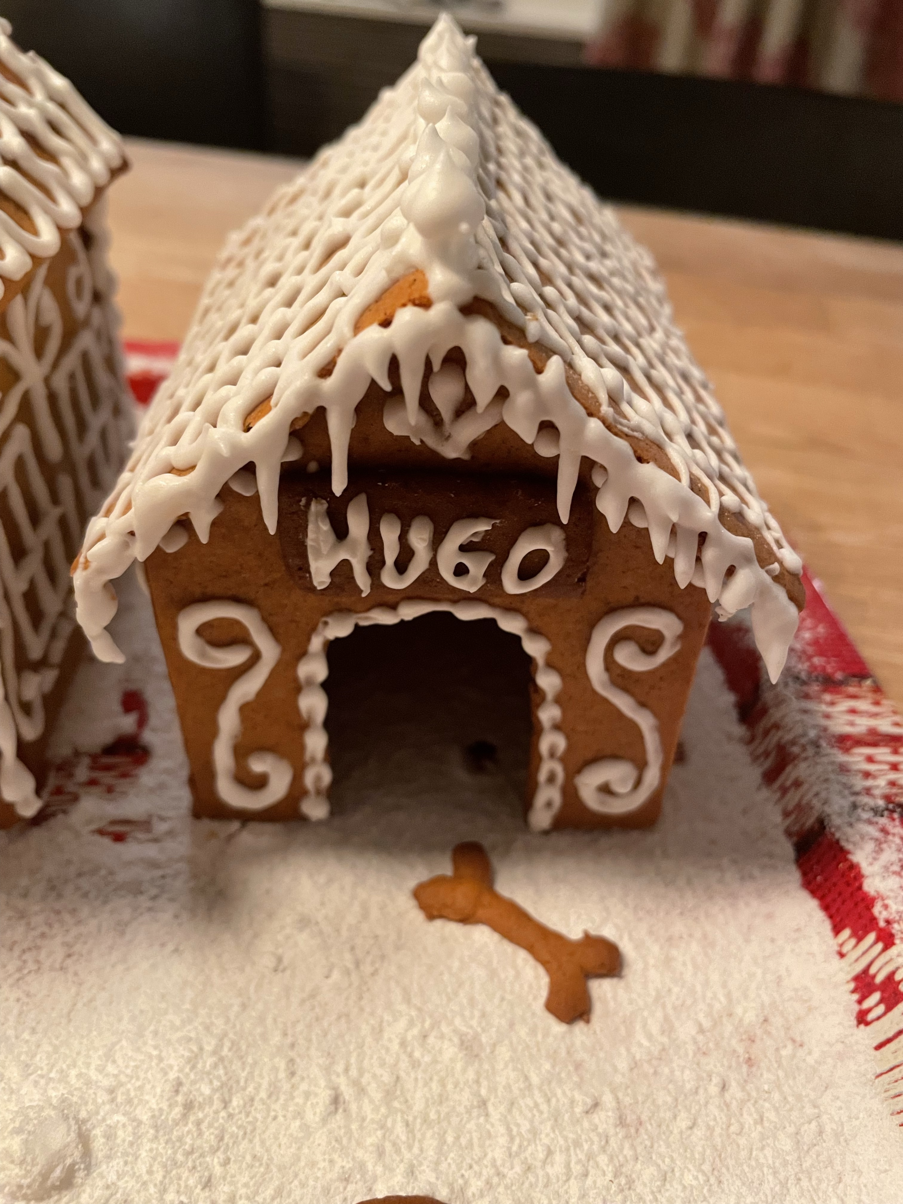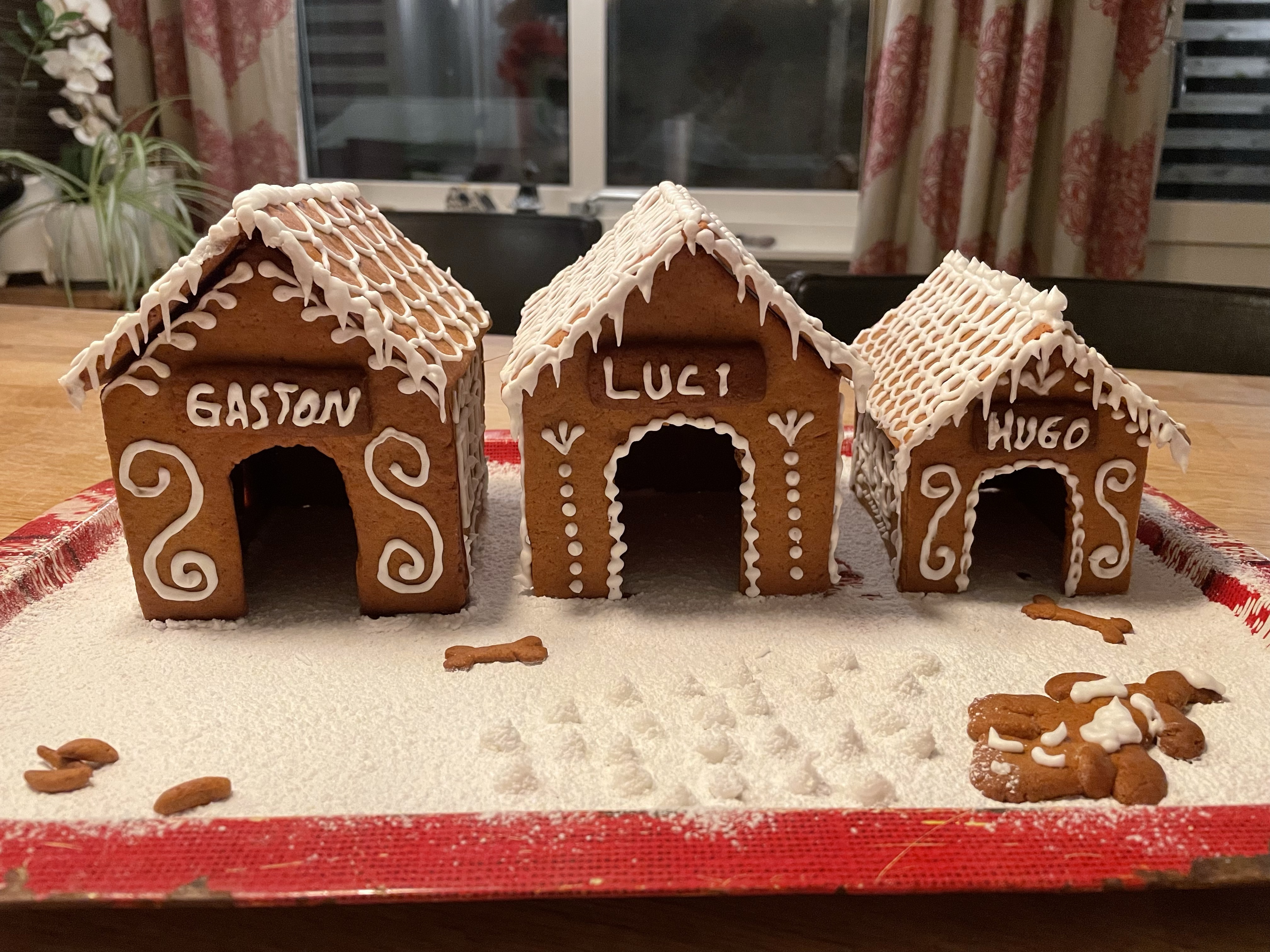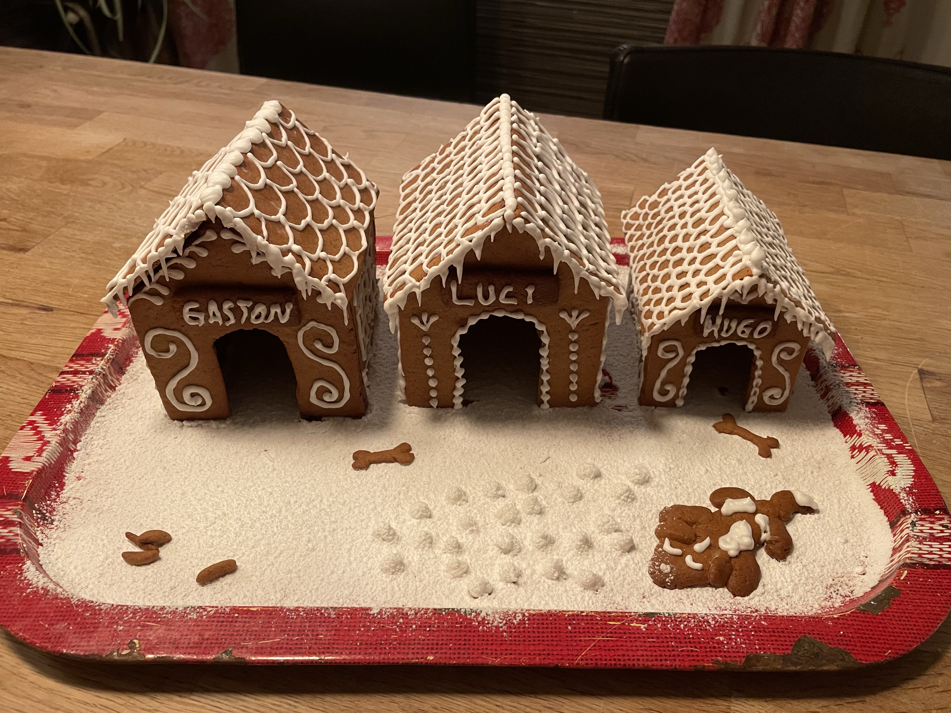 Lussebullebak Magnus och Tove bakade goda lussebullarDet är som en blandning av lussekatter och kanelbullar, vääääldigt goda!Och väldigt fina! Jag tror det är Leilas recept vi kör på.Pepparkakor in the making Några för att hänga i taket i köketDet blev en egen design på pepparkakshus i årGräddning pågårTove dekorerar. Årets tema är ….hundkojor!HugoLuciOch Gaston!Fina va!