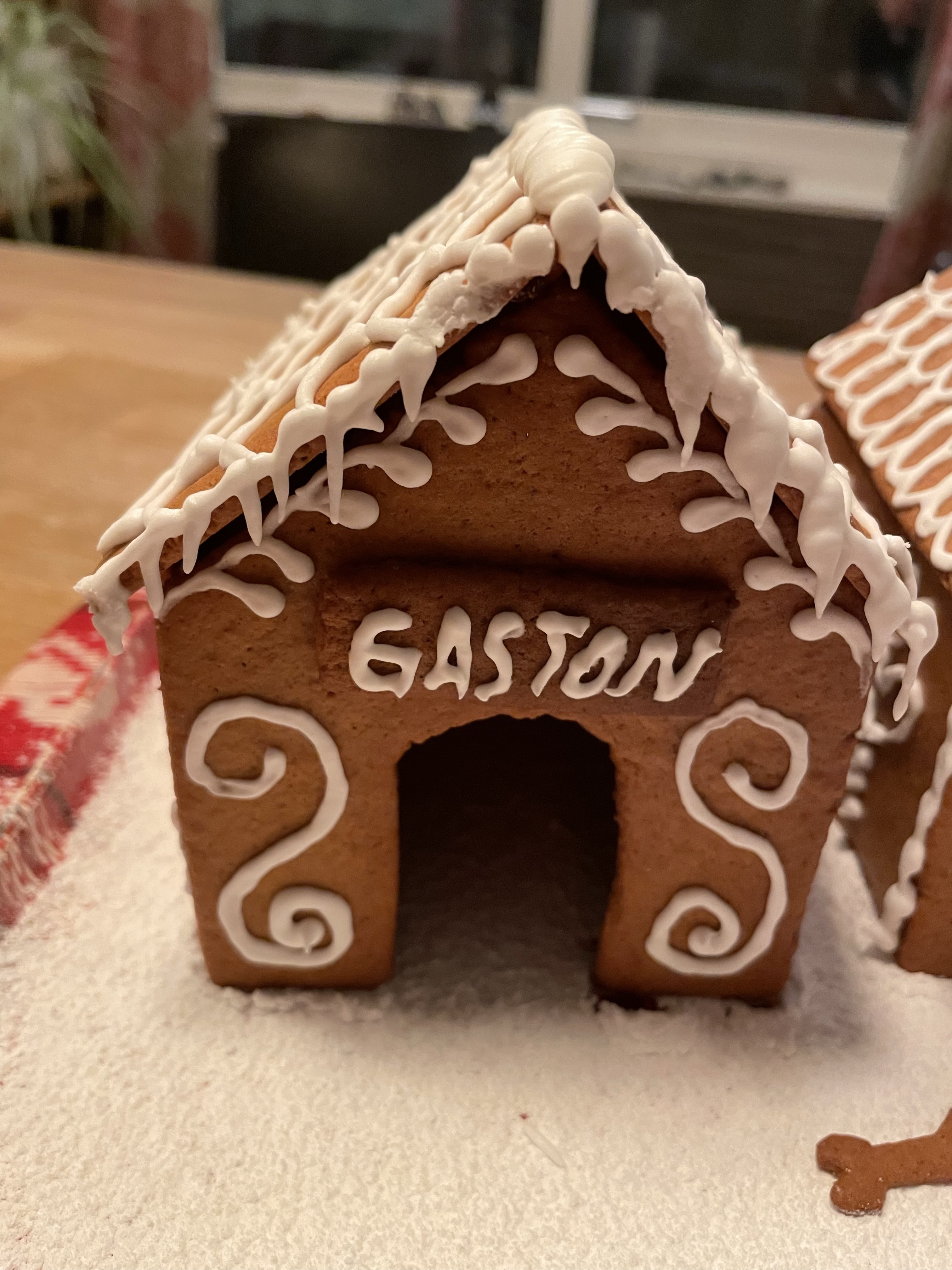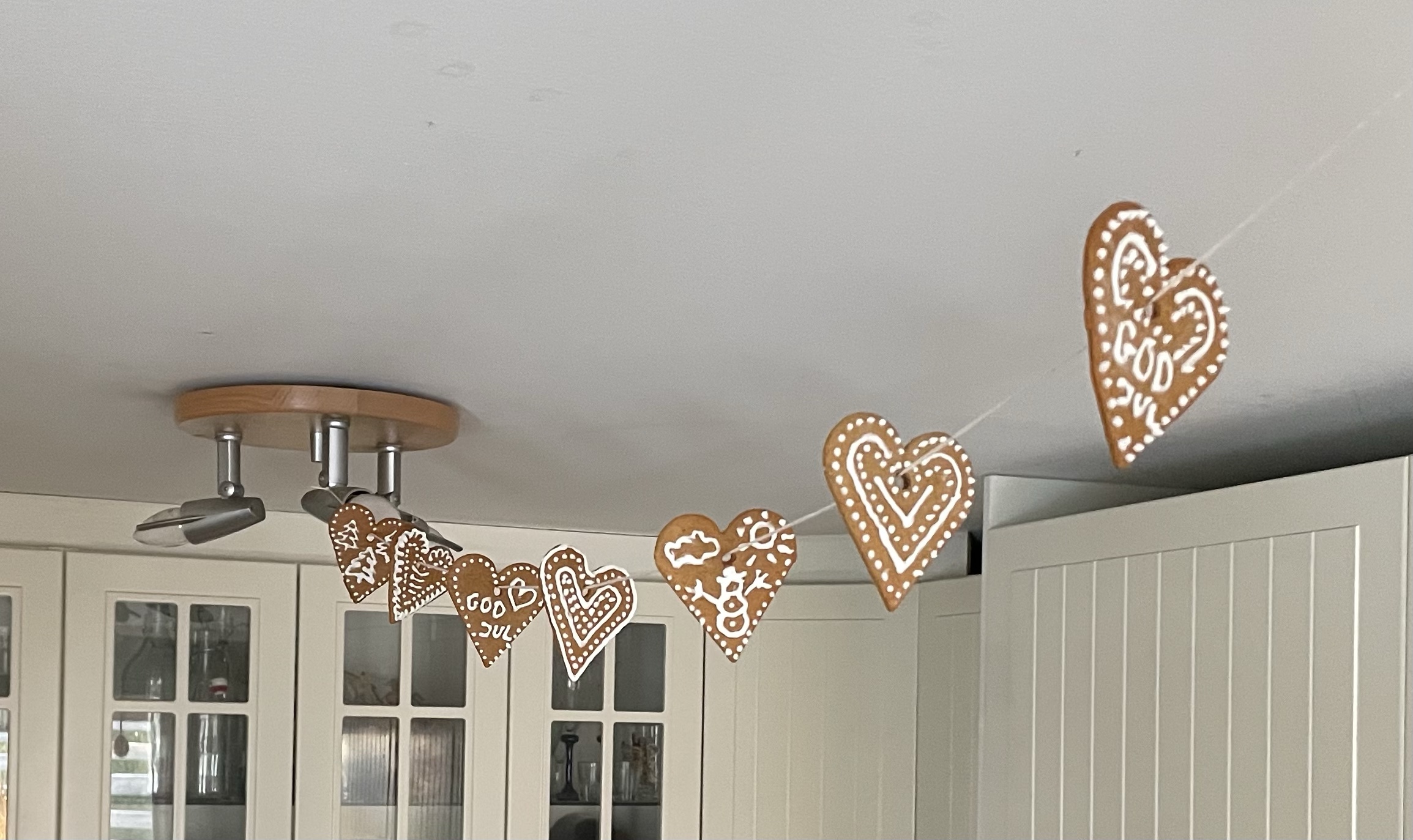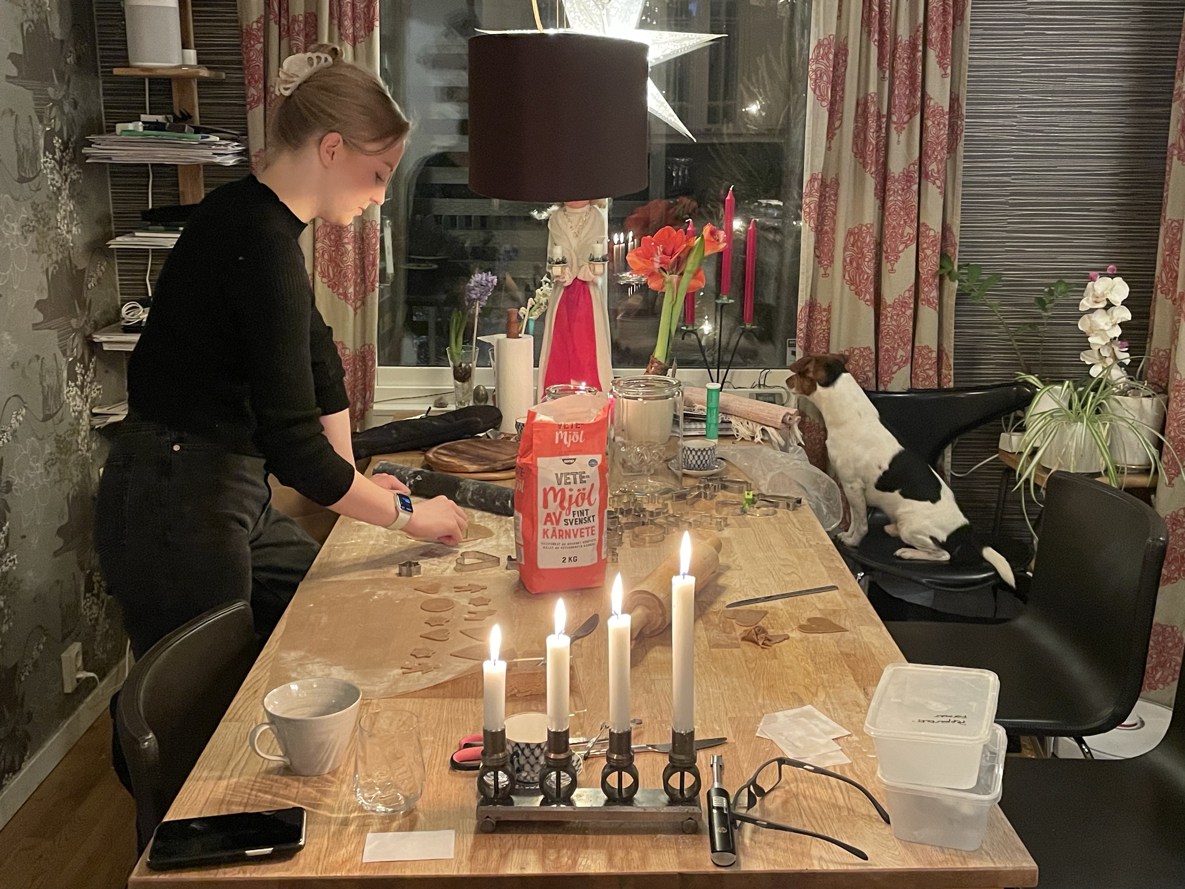 Lussebullebak Magnus och Tove bakade goda lussebullarDet är som en blandning av lussekatter och kanelbullar, vääääldigt goda!Och väldigt fina! Jag tror det är Leilas recept vi kör på.Pepparkakor in the making Några för att hänga i taket i köketDet blev en egen design på pepparkakshus i årGräddning pågårTove dekorerar. Årets tema är ….hundkojor!HugoLuciOch Gaston!Fina va!