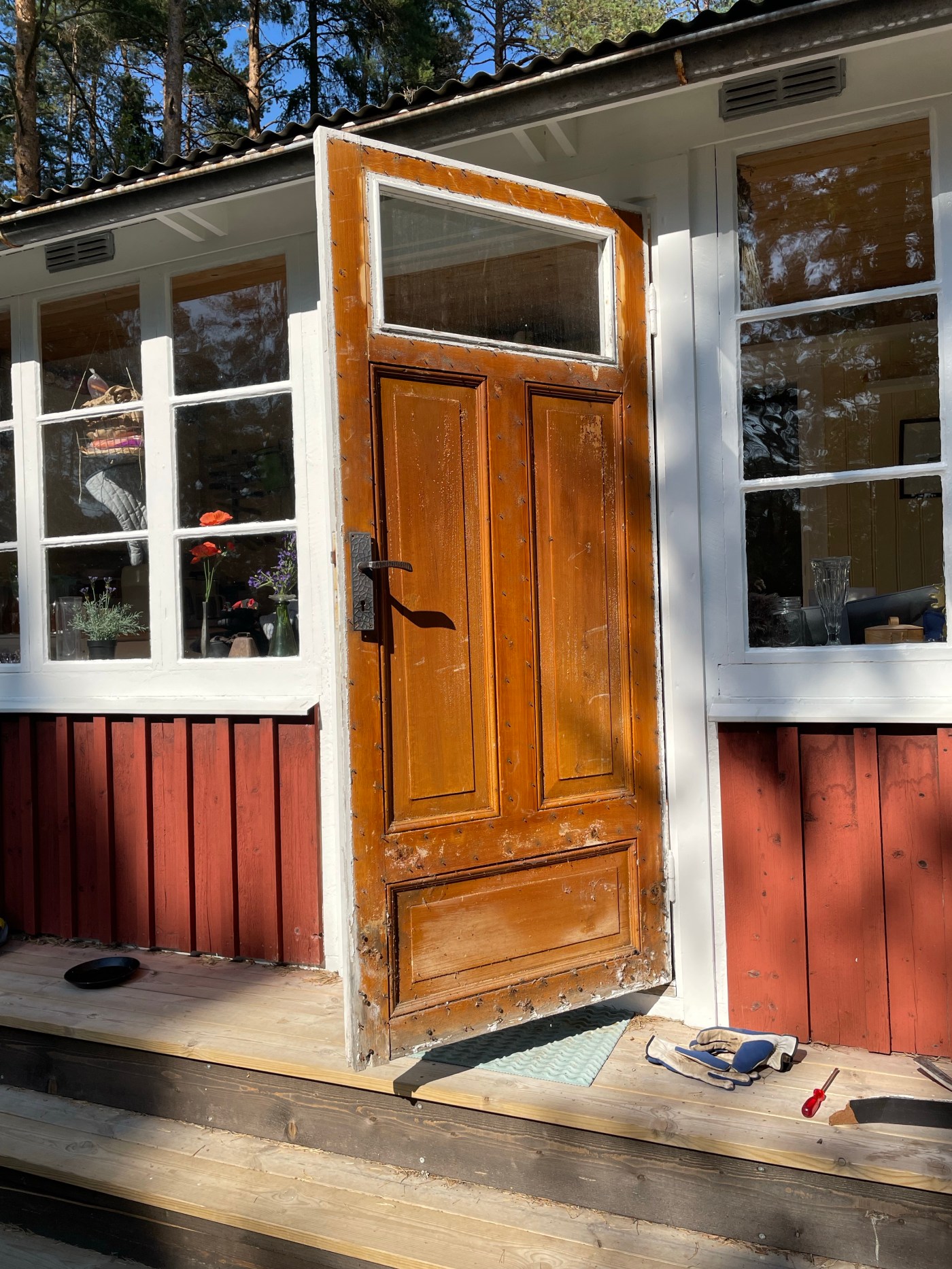 Jag har ganska länge, kanske några år, försökt få Magnus att gå med på att vi ska ta bort den gamla masonitskivan som sitter på ytterdörren på Tallis.
