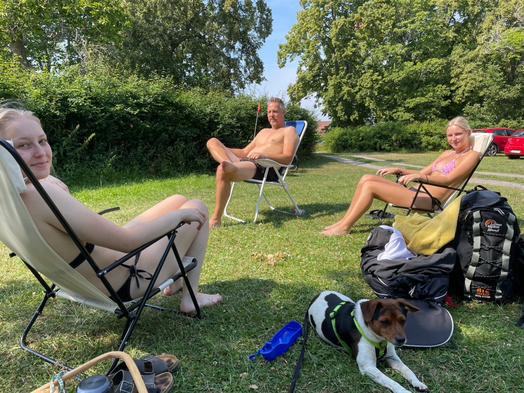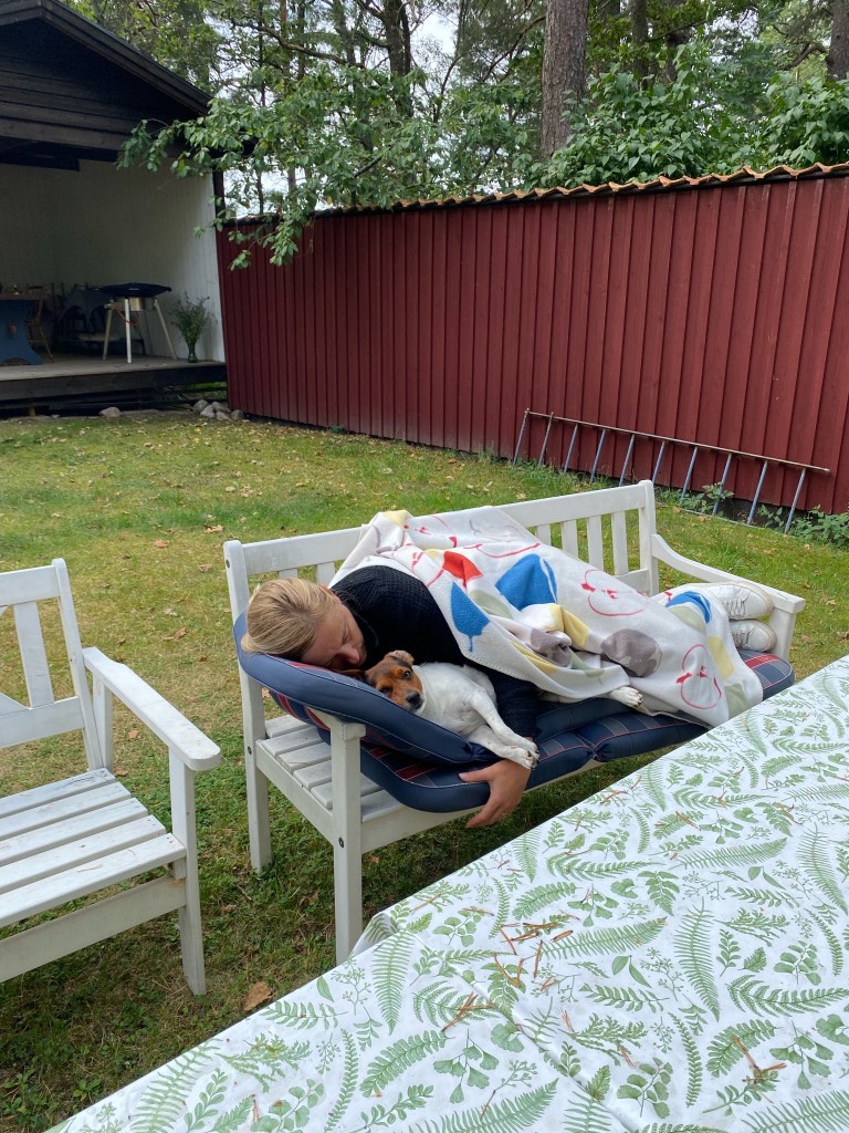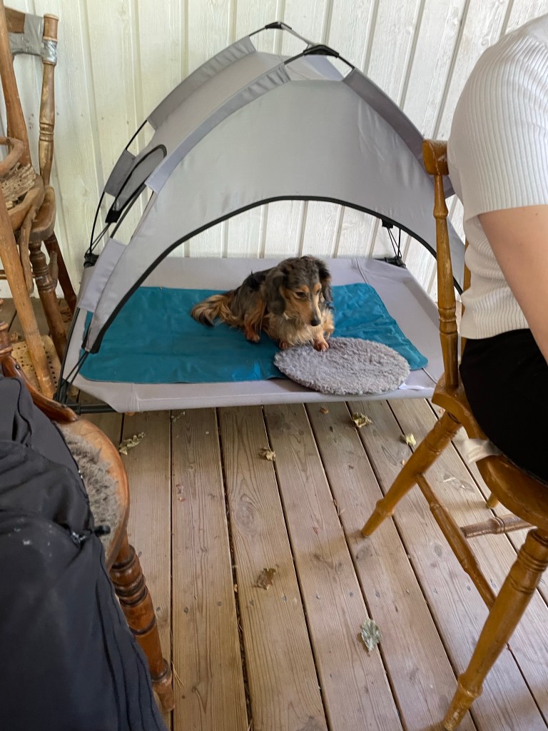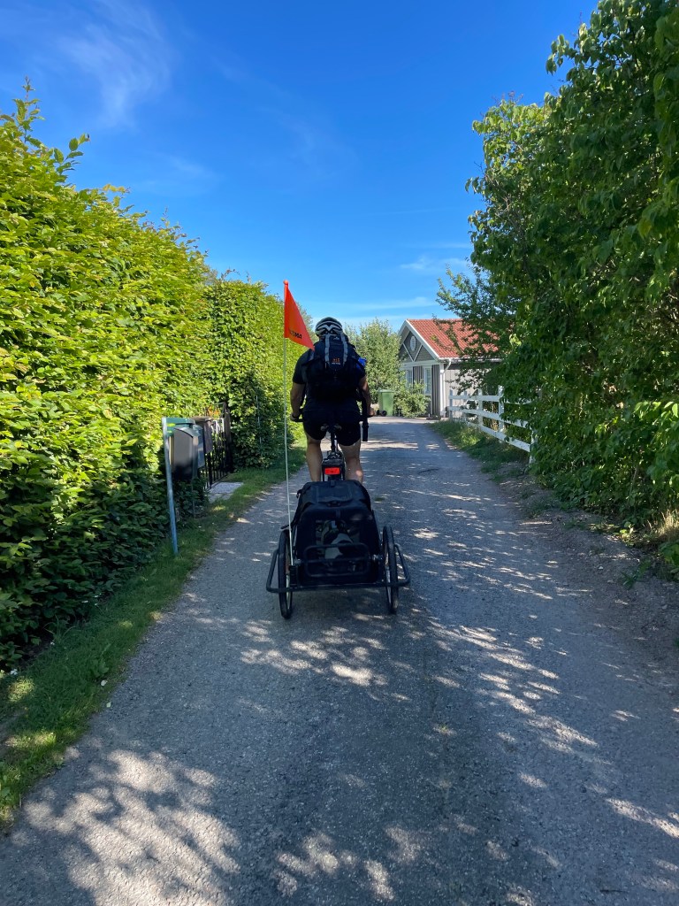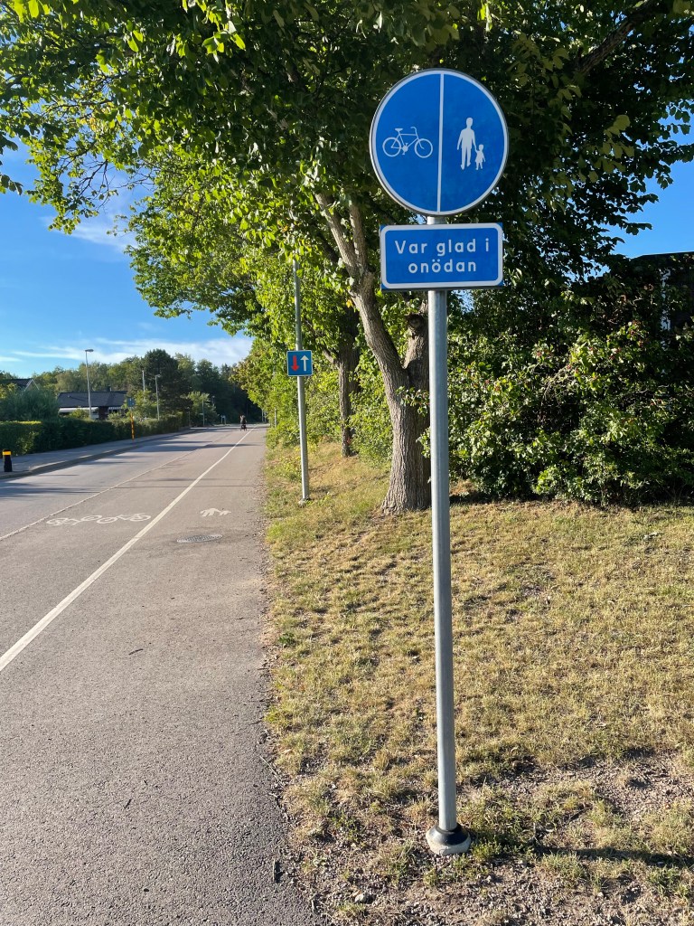 Jag har suttit på altanen ute…Och Magnus har suttit på verandan😊Och så har det varit så fint väder att vi testade att cykla ner till badet häromkvällen med Hugo i vagn.Inte helt nöjd med det men det gick😬Finns det fika till mig med?🐶På vägen hem passerade vi den här skylten.Precis så ska det vara!