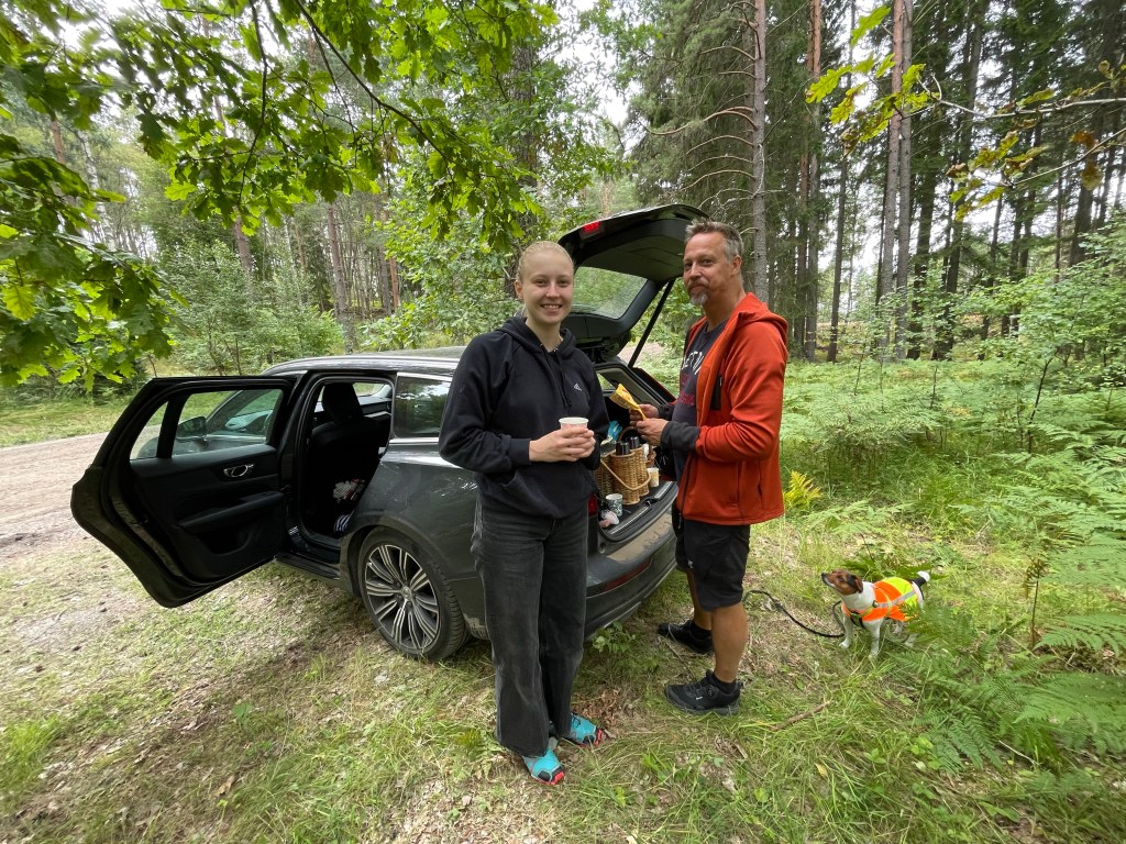 Efter lite rek med bilen så stannade vi här! Det kanske inte ser ut som en imponerande svampskog på bilden.Men på andra sidan såg det lovande ut… men nej , två kantareller hittade vi där. Det var mest läskigt att gå bland alla vildsvinsspår tyckte jag😨Men vi gav inte upp! Magnus hade fixat goda äggmackor och lite godis för att få upp energin!Och kaffe😁Snart redo för en ny skog!Mycket blåbär och ändå lite mer svamp här…och fin natur!Sista försöket i ny skog men först lite lunch!Pastasallad (eller pytt i panna salladish, dvs allt vi kunde hitta i kylskåpet, det blev jättegott!Hugo och jag orkade inte följa med i sista skogen så vi stannade kvar i bilen och chillade❤️När vi kom hem hade Ingela lämnat en nyslungad honungsburk på trappan🫶Bästa syrran👌