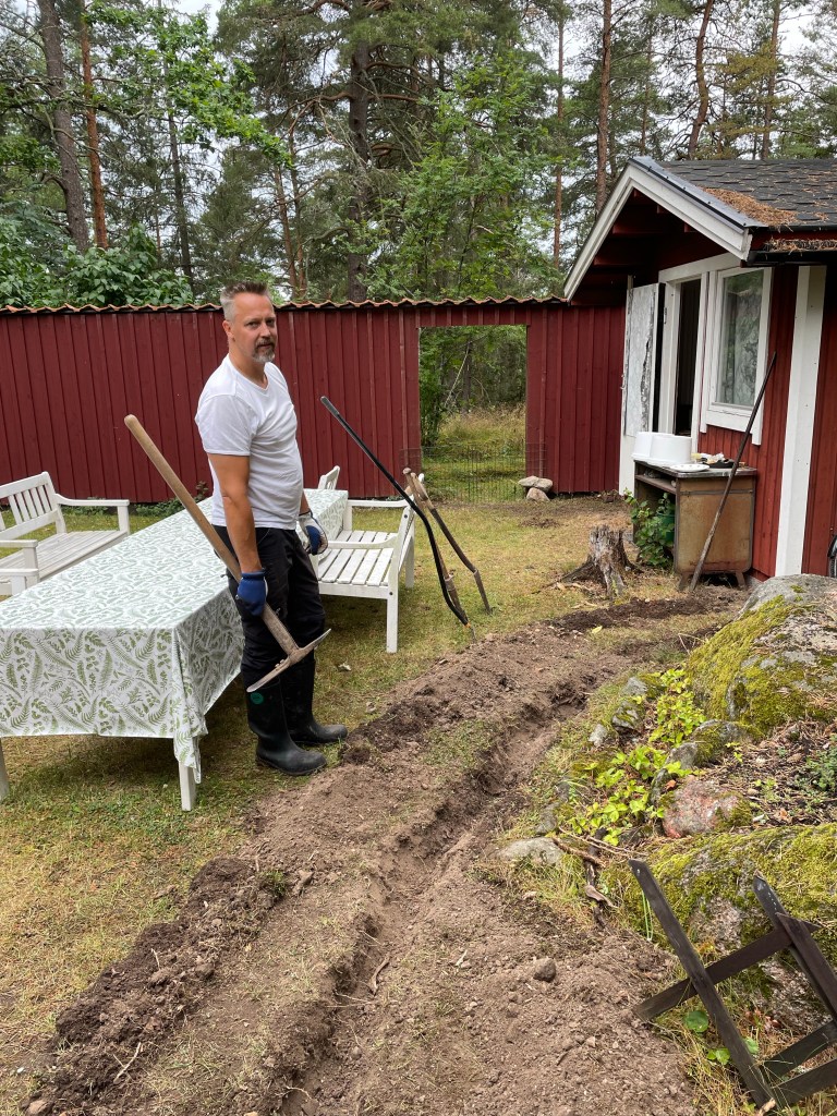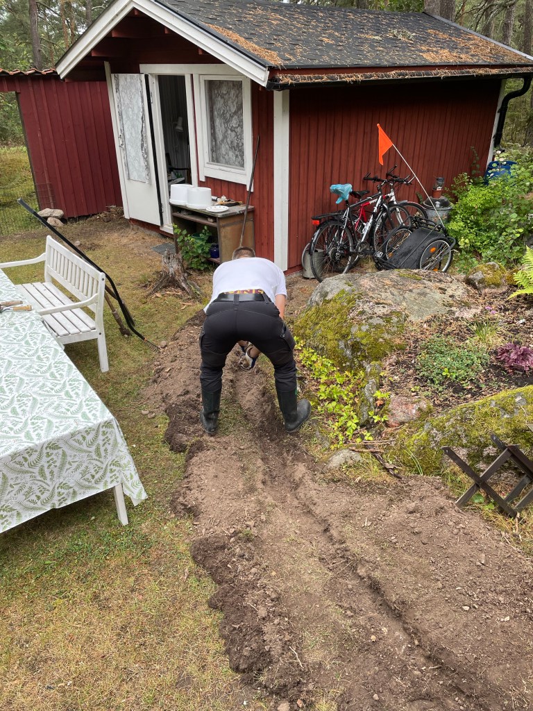 Magnus har börjat förbereda för eldragning till friggan och altanen med att gräva ner kablar.