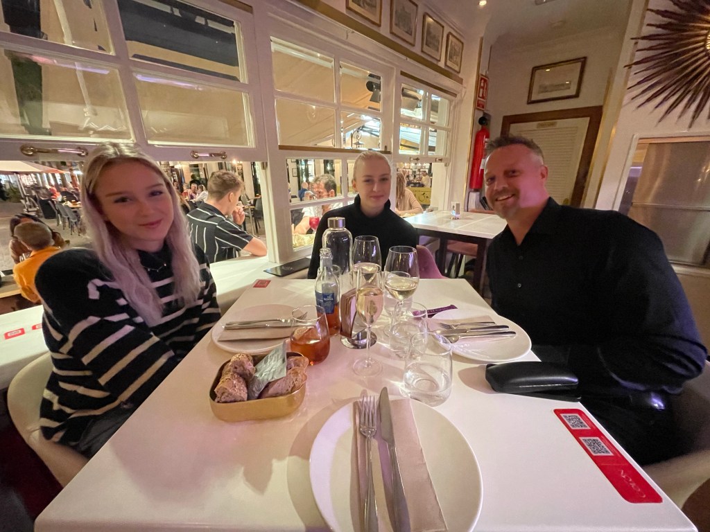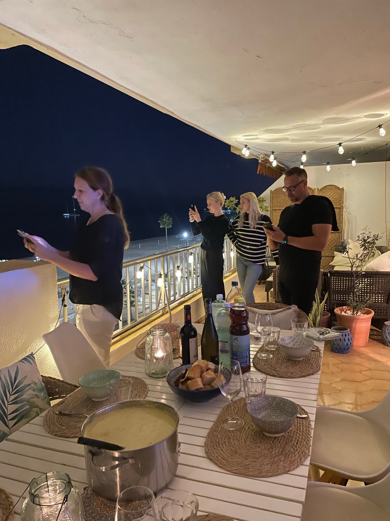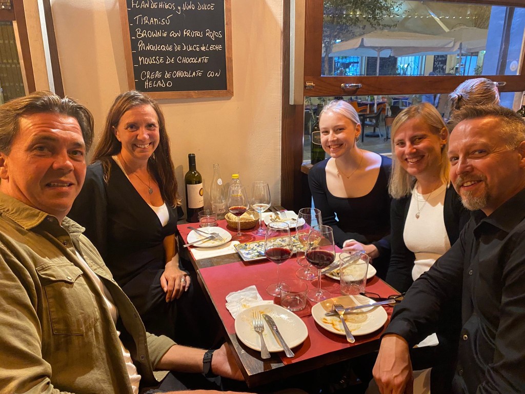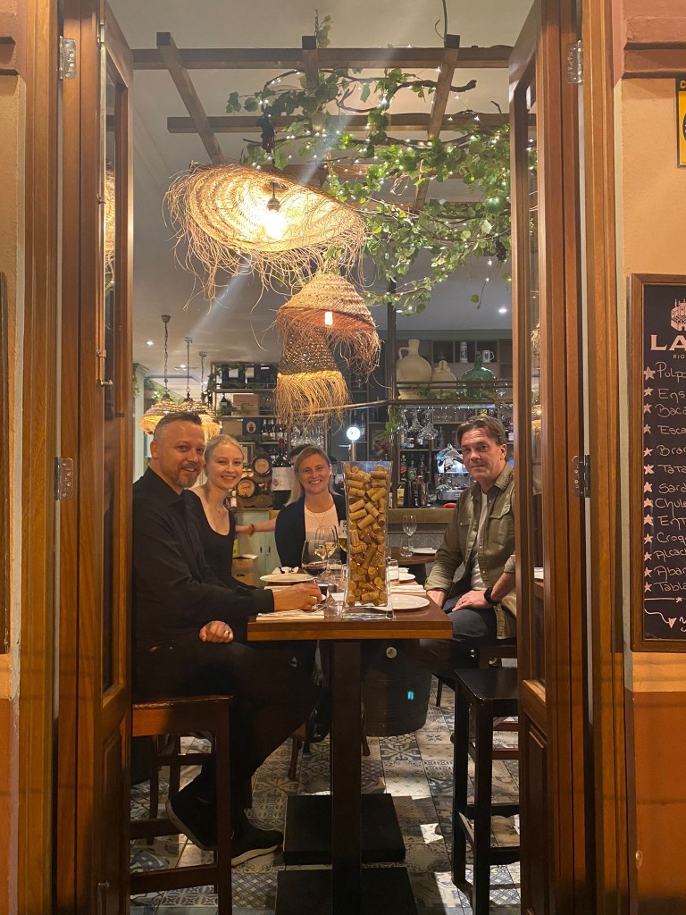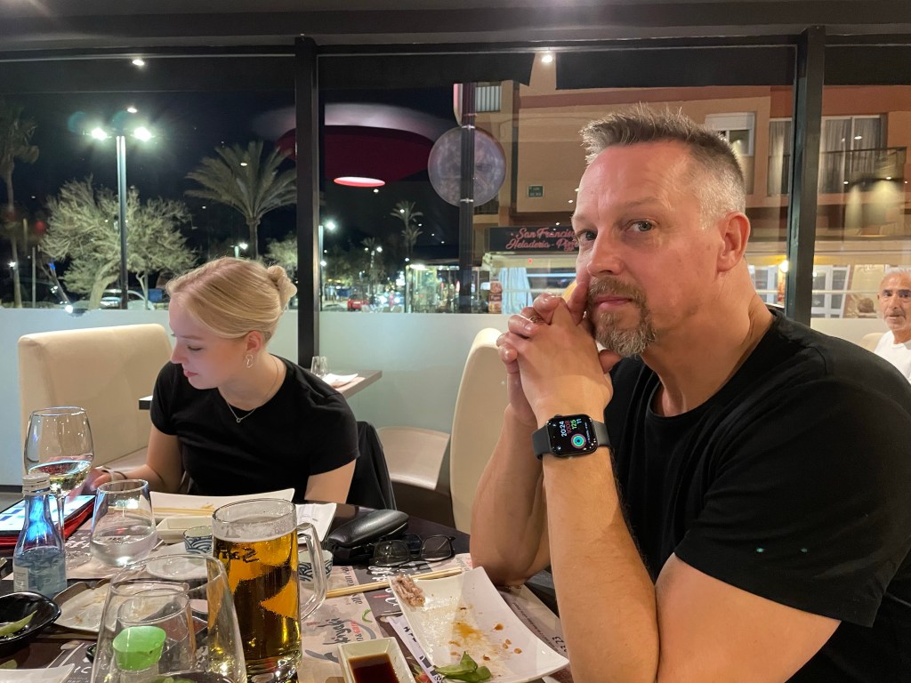 En kväll var vi ute på Sukiyaki, restaurangen som har robotar som serverar……Lina och jag var där sist så nu fick resten av familjen också gå på den kuliga restaurangen😁.Vi fick till och med Ludde som egentligen inte är superimponerad av sushi 🍣🙏😊Sen har vi ätit Crêpes på ett av Linas favoritställen.På lördagen åkte vi till Malaga med Mikael och Jenni. Först tog vi ett glas vin på en systerkrog…Och det var denna som vi bokade in middagen på.Lina o Ludde var på egen fest så dom missade den här mysiga tapasrestaurangen! Kul att nämna var att det visade sig vara Charlie Söderberg som sitter bakom mig i ”man bun” och som vi pratade lite med under kvällen, mycket trevlig!En kväll var vi hemma hos fam. Andersson och åt en god fisksoppa🙏Fotogänget som fotade……den magiska solnedgången 🌅Tripp, trapp, trull😁 Buddy, Lina och Ludde😊